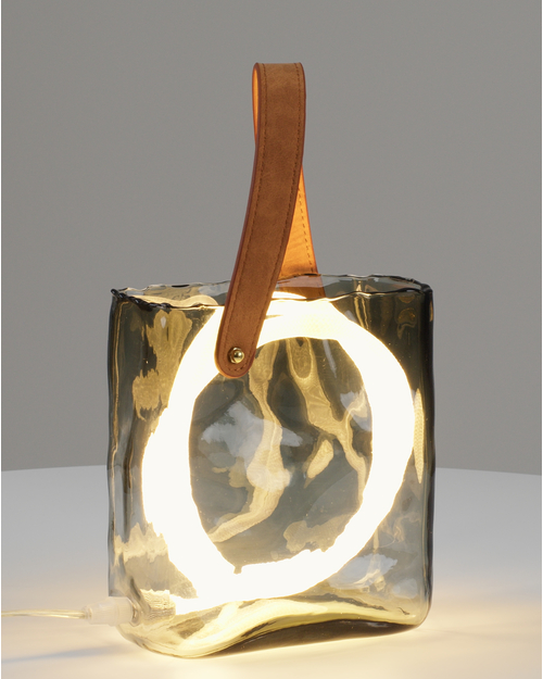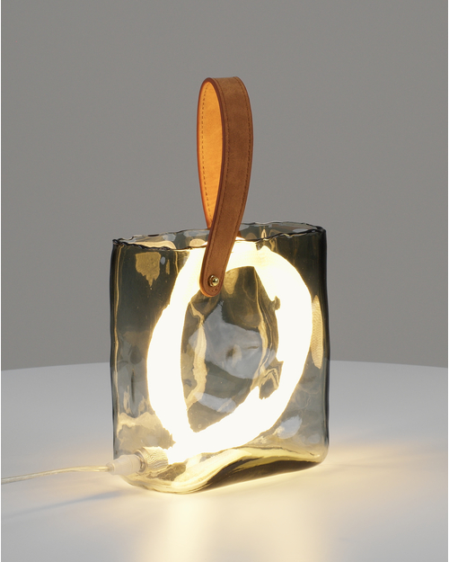 Запросить индивидуальное предложениеНастольная лампа Bag сразу привлекает внимание необычной формой — она выполнена в виде дизайнерской сумки с глянцевым стеклянным корпусом и ручкой. Сквозь прозрачные волны стекла просвечивает гибкая неоновая лента, создающая мягкое, тёплое свечение и эффект живого света. Лампа выглядит словно арт-инсталляция, объединяя эстетику и практичность.