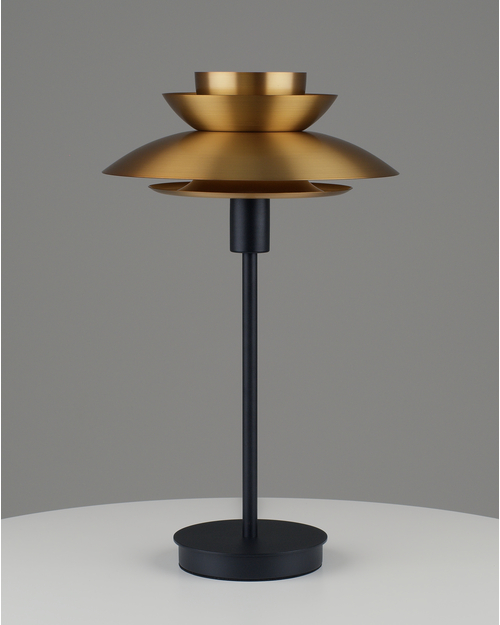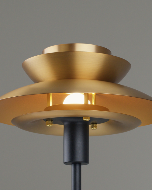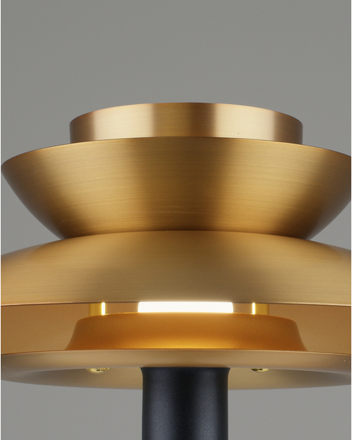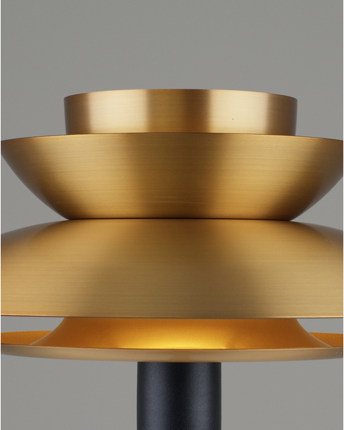Гармоничное сочетание минимализма и элегантности. Плафон, выполненный из металла, вдохновленный культовым дизайном Луи Пульсена и представляет собой несколько слоев, визуально напоминающих цветок. Цвет латуни внешней поверхности плафона контрастирует с золотым внутренним покрытием и основанием черного цвета, усиливают световой эффект, создавая теплое и уютное освещение.