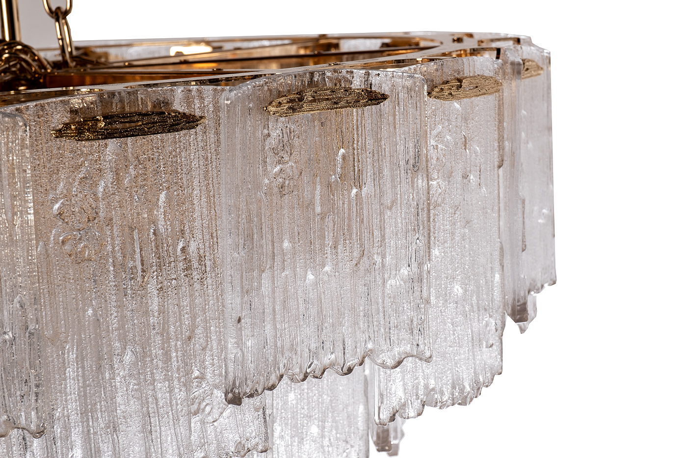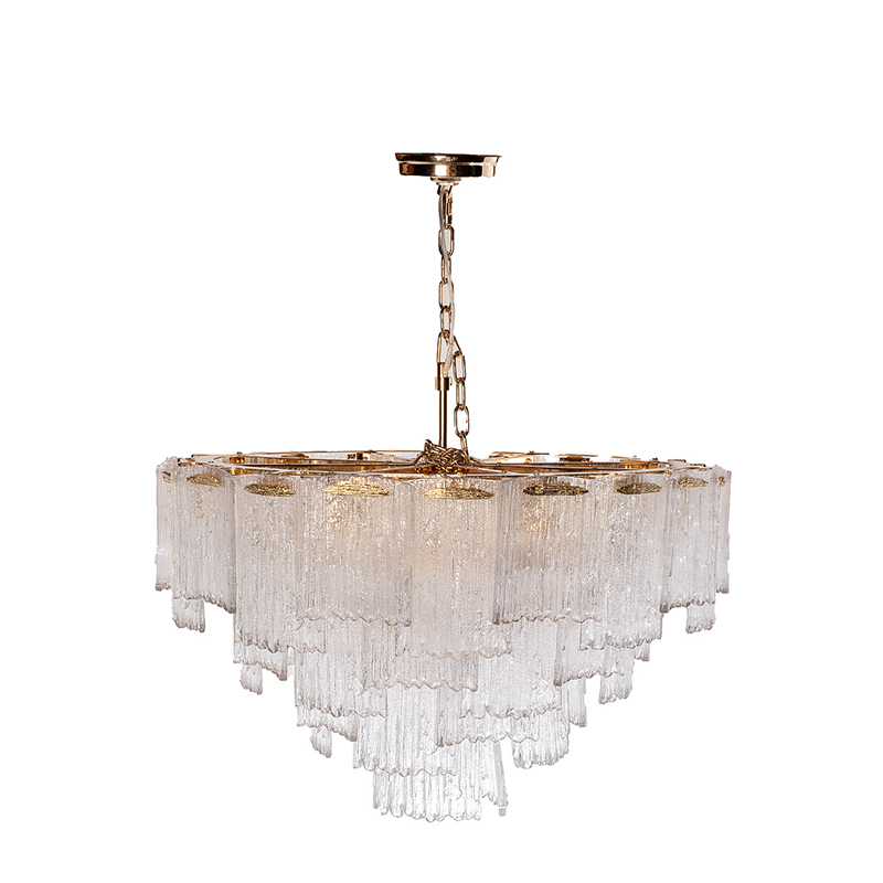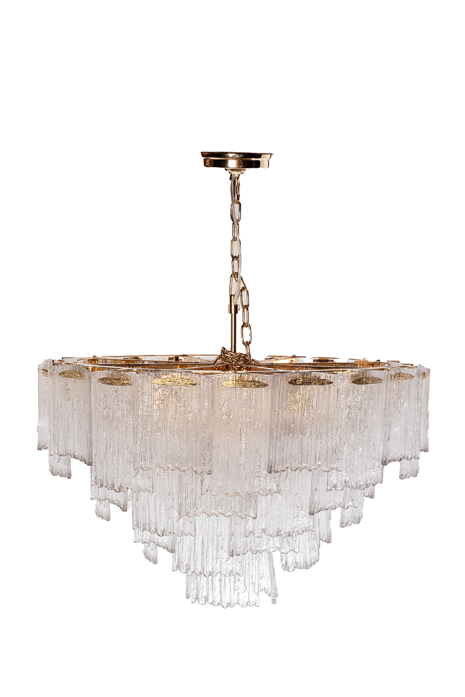 Запросить индивидуальное предложениеПодвесная стеклянная люстра с эксклюзивным дизайном станет идеальным вариантом для современного или классического интерьера. За счет своей формы и элементов из рифленого стекла эффектно смотрится в интерьере и обеспечивает мягкое освещение. Стильная люстра для гостиной сочетает в себе надежный каркас из металла и стеклянные подвески в виде ниспадающих водопадов, что придает ей особенного шарма и аристократичности. Благодаря своим декоративным качествам этот потолочный светильник органично впишется в любое стилистическое оформление и станет его эффектным украшением.