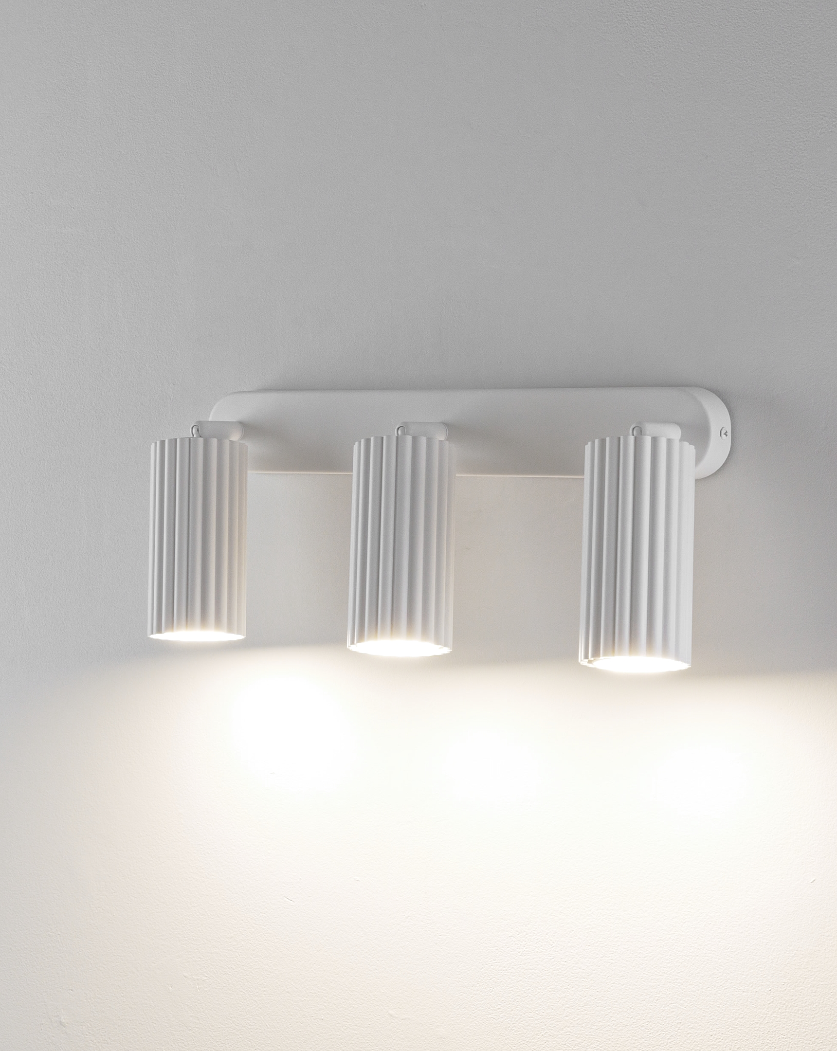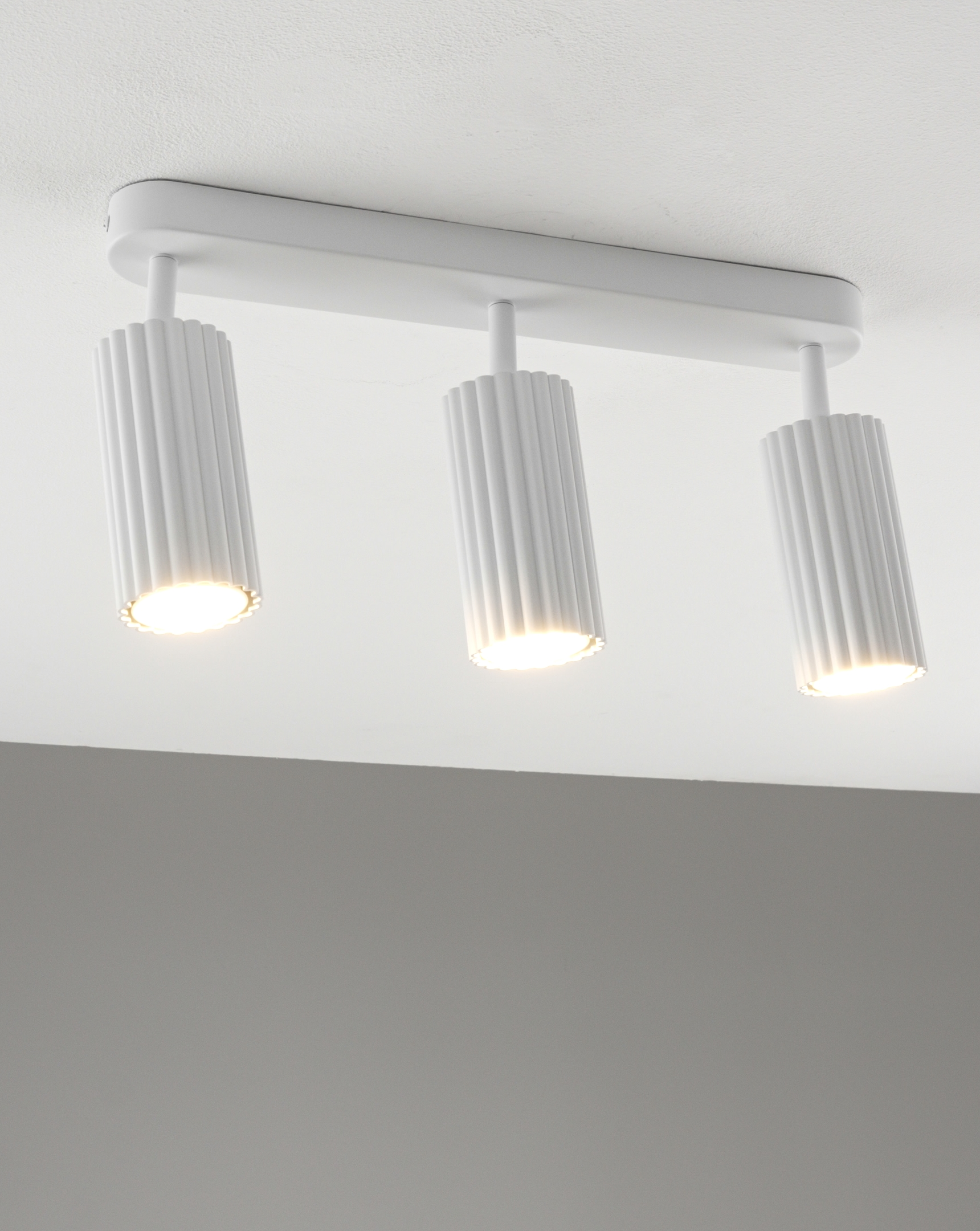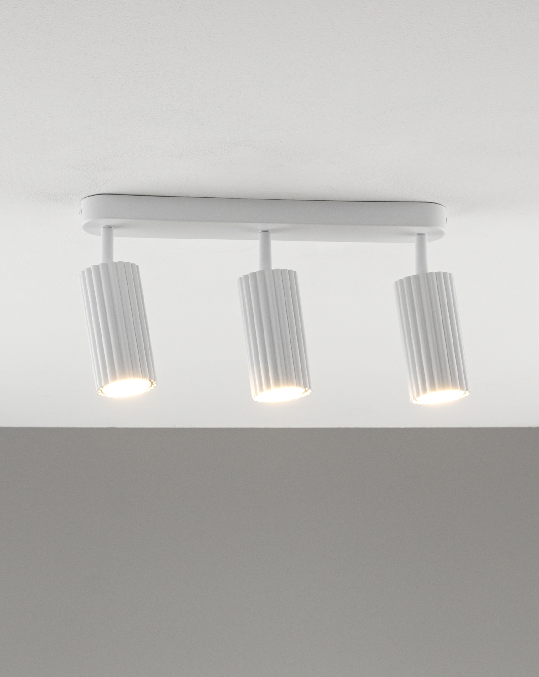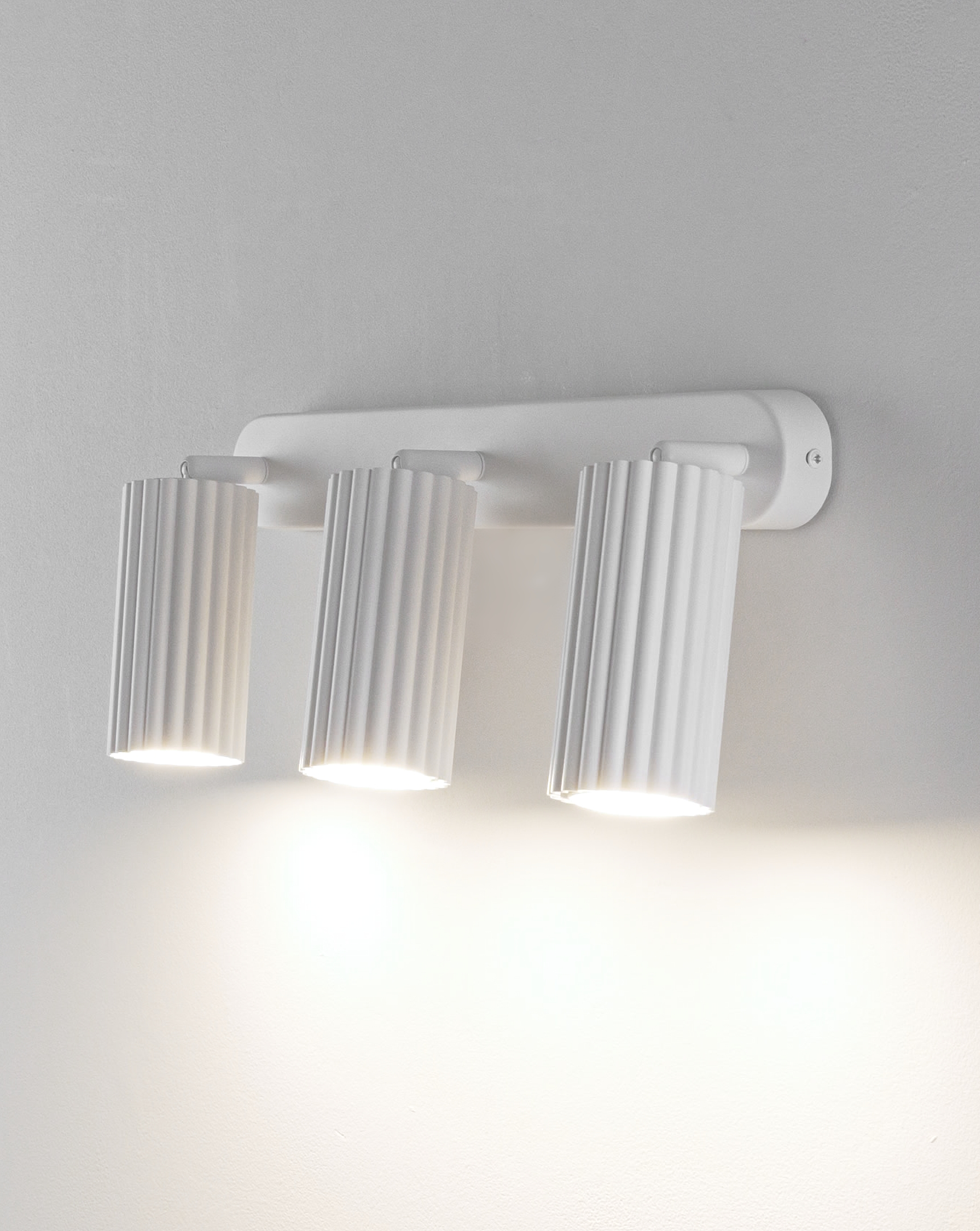 Спот Cora выполнен в минималистичном и функциональном стиле с элементами лофта. Белые цилиндрические плафоны с матовой текстурой и вертикальными рёбрами создают выразительный акцент и придают светильнику стильный облик. Такой светильник будет уместен как в современных квартирах, так и в коммерческих интерьерах — кафе, лобби или коворкингах.