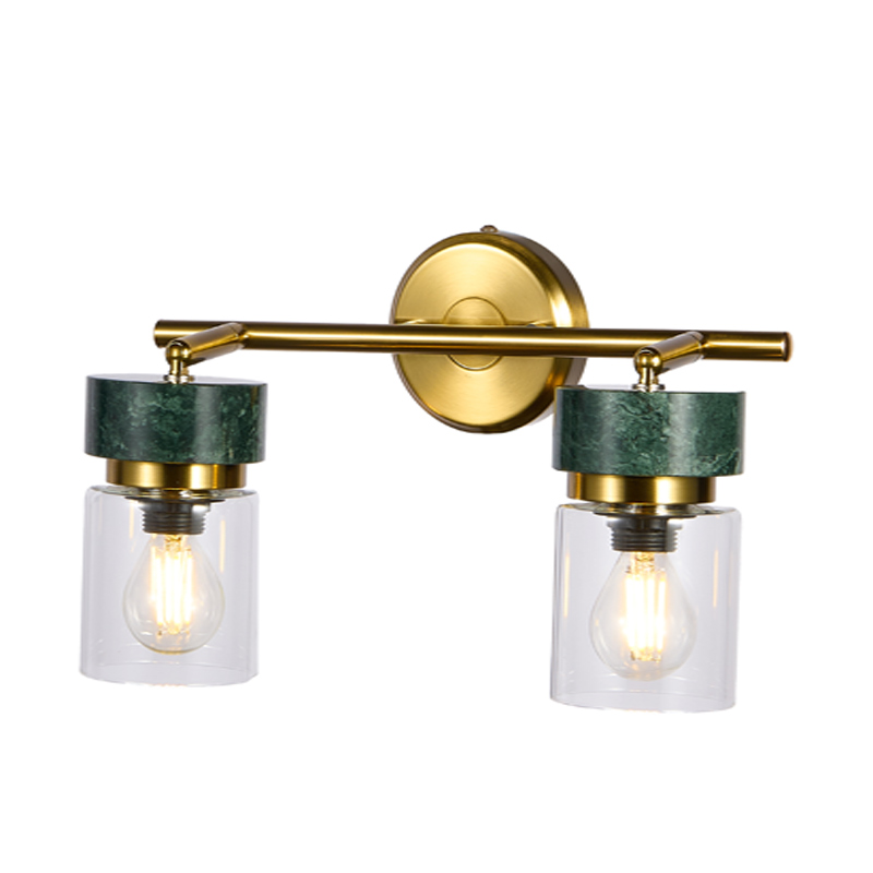 Плафоны выполнены из прозрачного стекла, корпус — из металла с глянцевым золотым покрытием. Декоративный элемент из натурального мрамора добавляет светильнику статус и глубину.