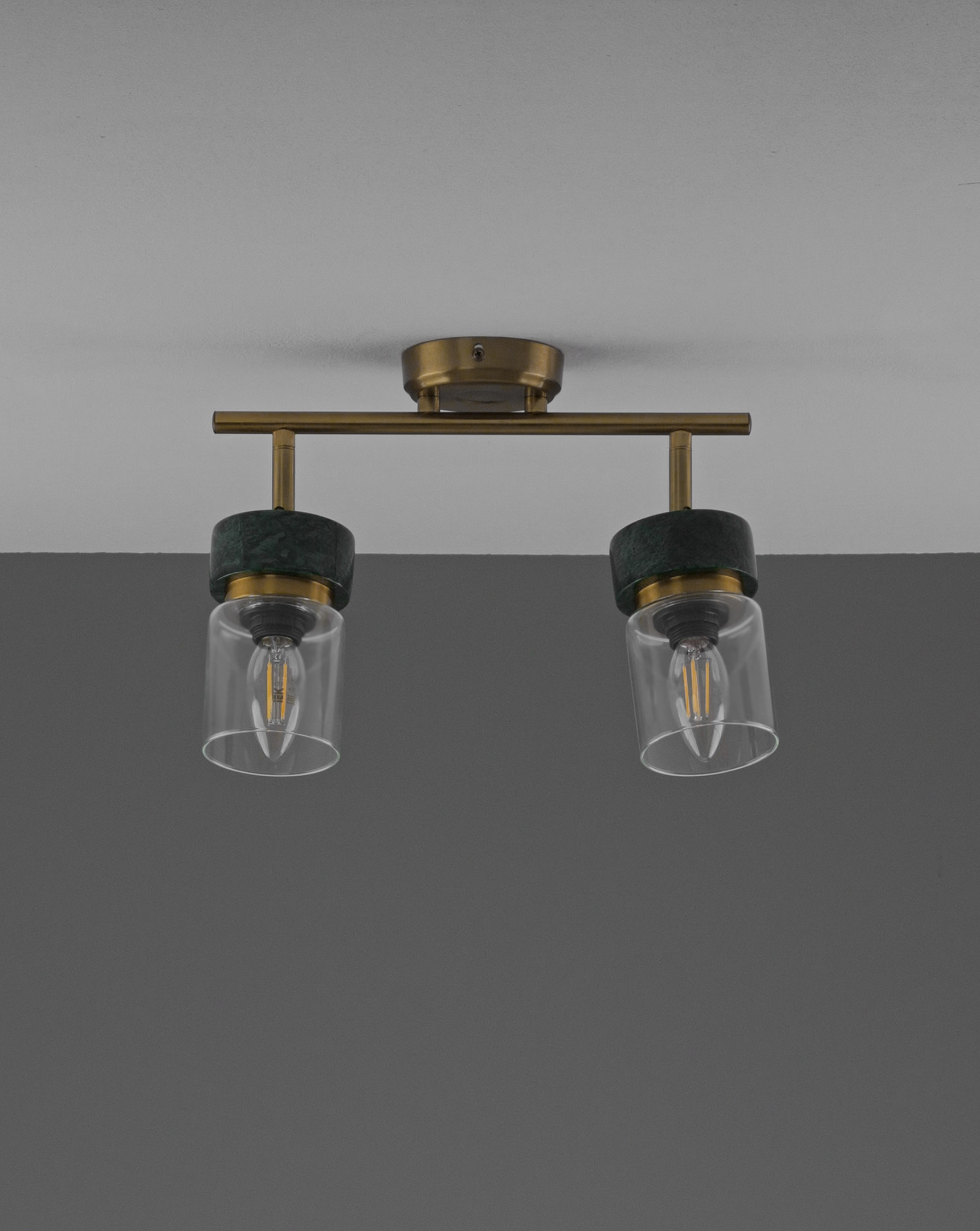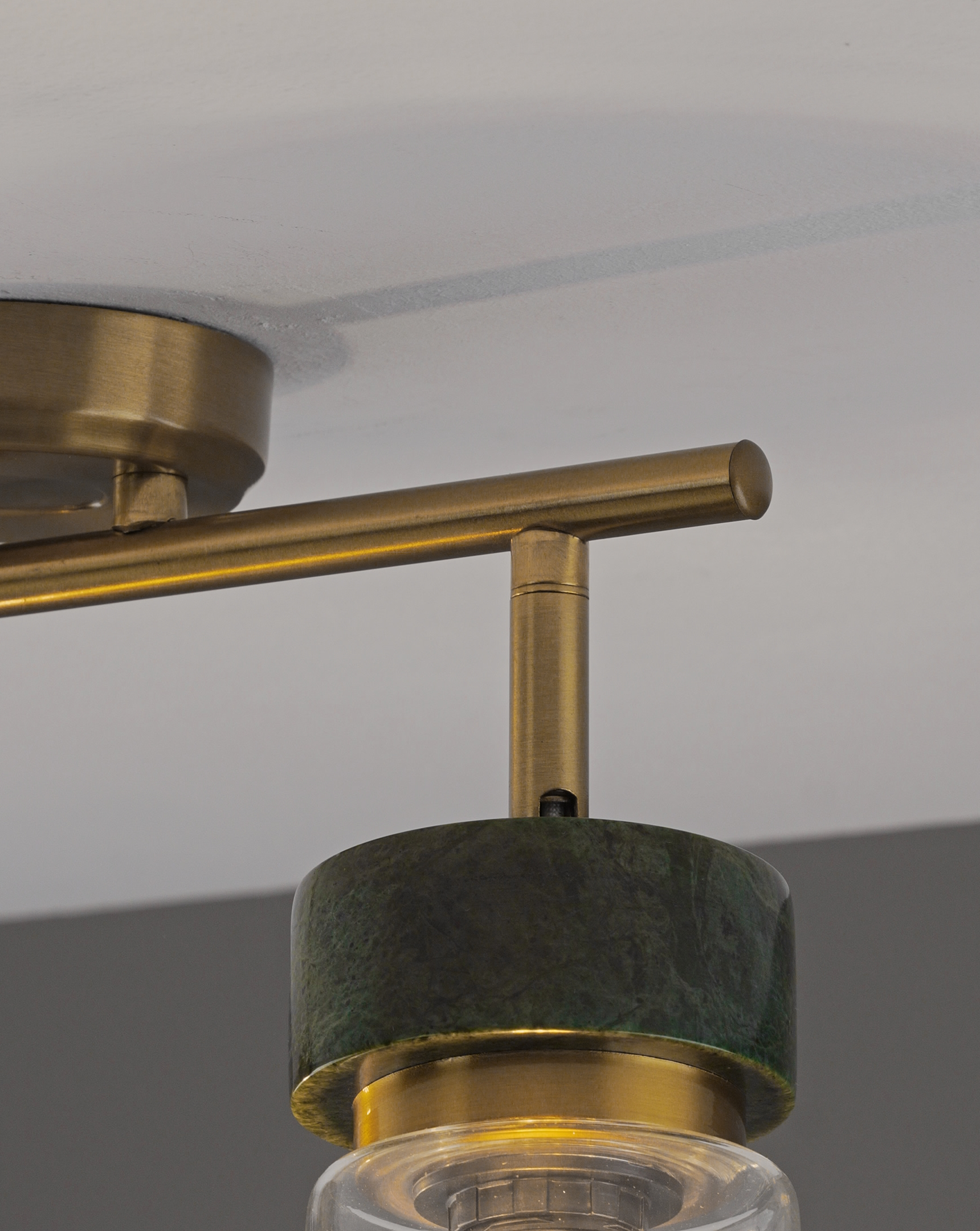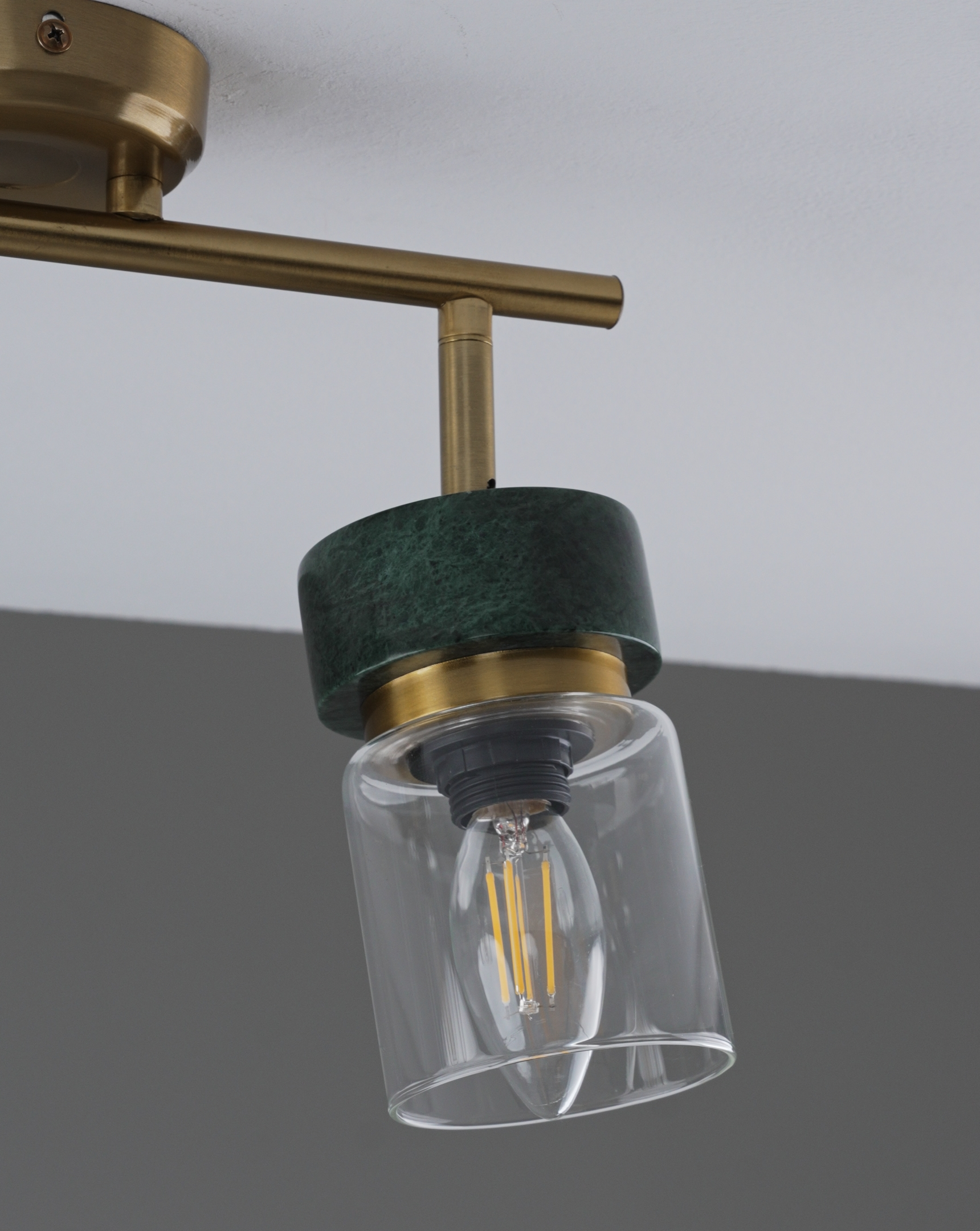 Спот из коллекции Almero создан для тех, кто ценит стильные детали в интерьере. Цилиндрические прозрачные плафоны подчеркивают лампу внутри, а натуральный мрамор в зелёном оттенке эффектно контрастирует с корпусом золотого цвета.