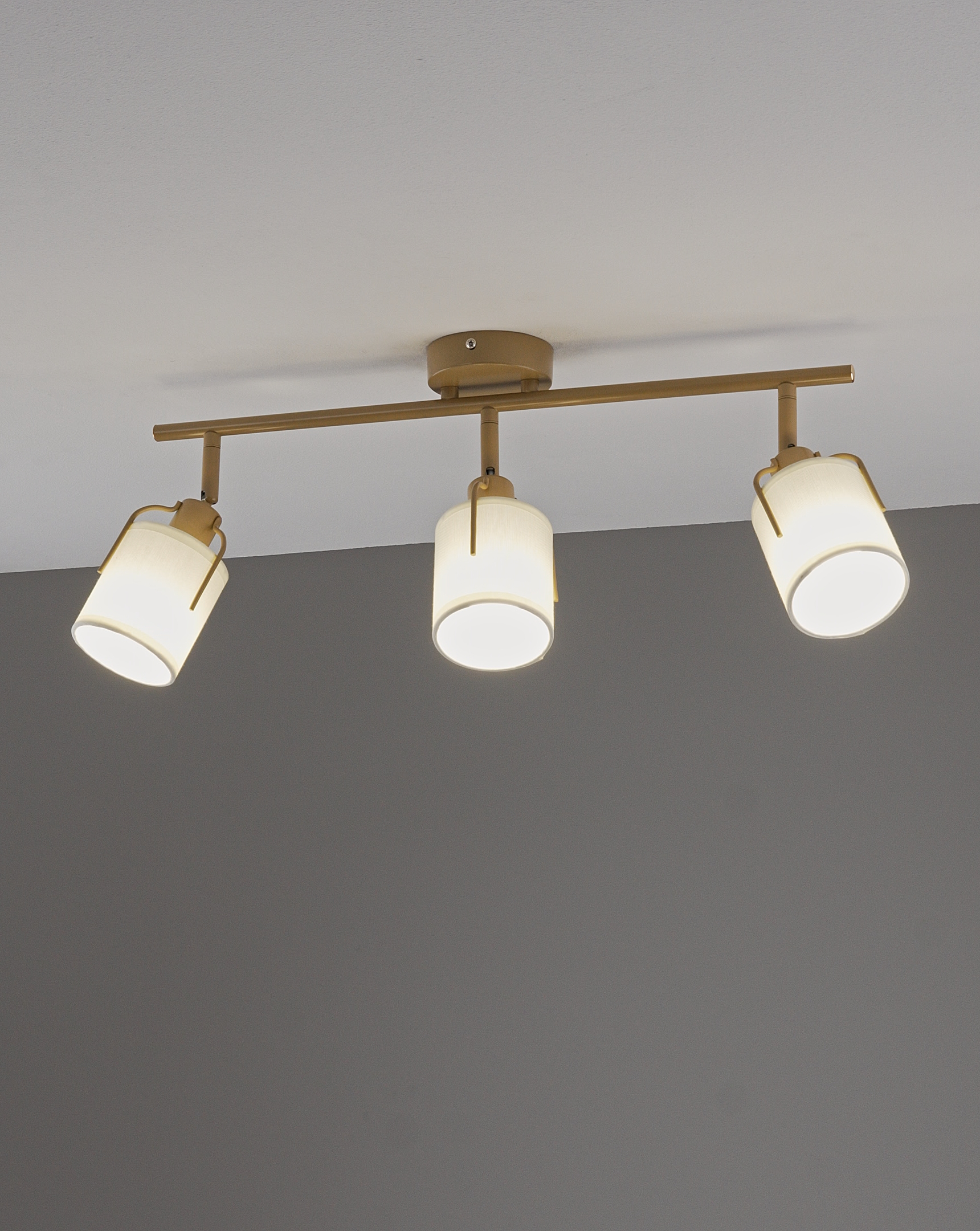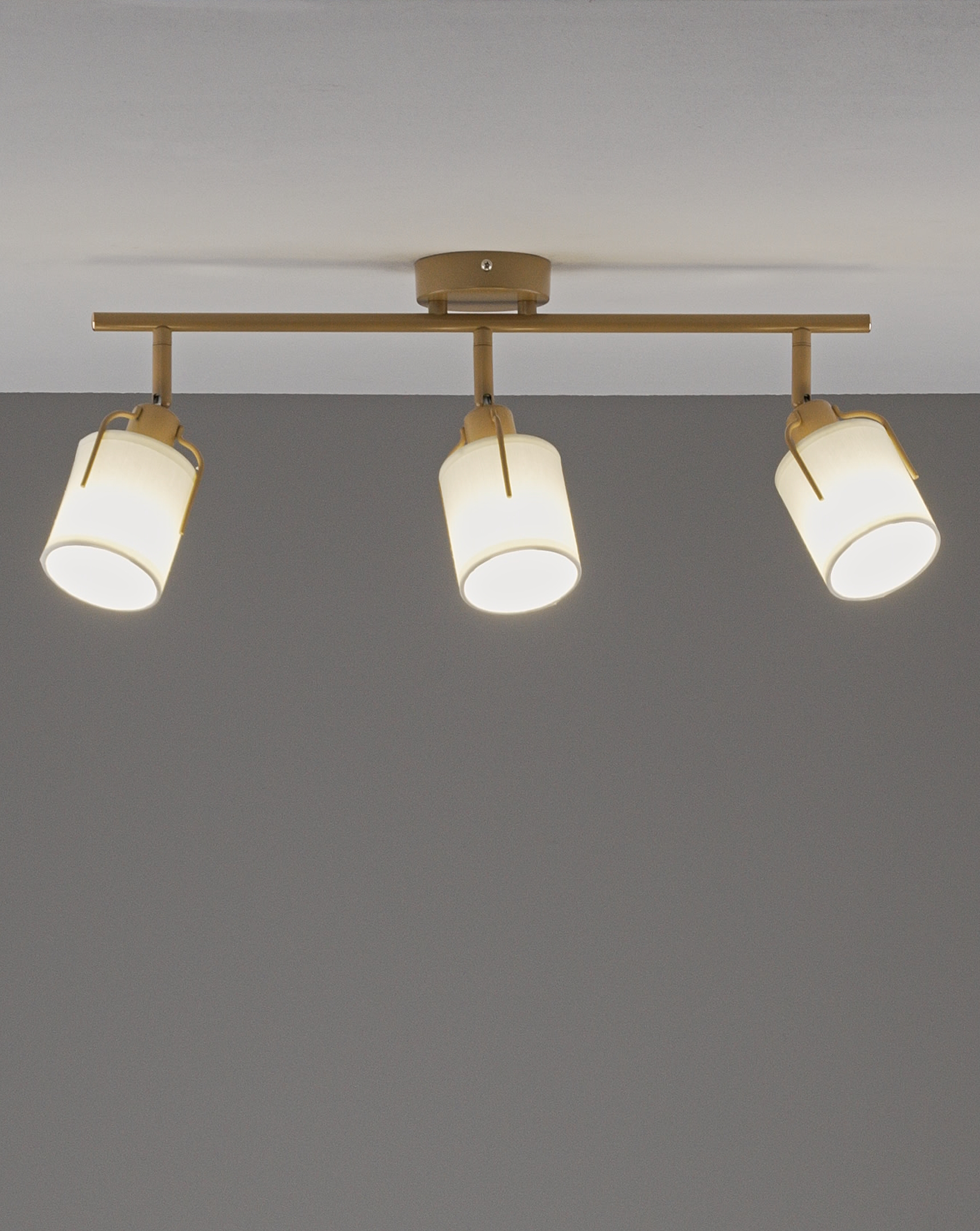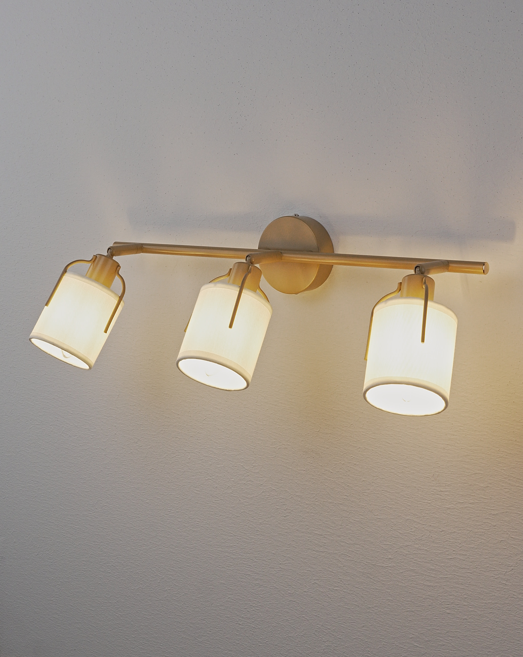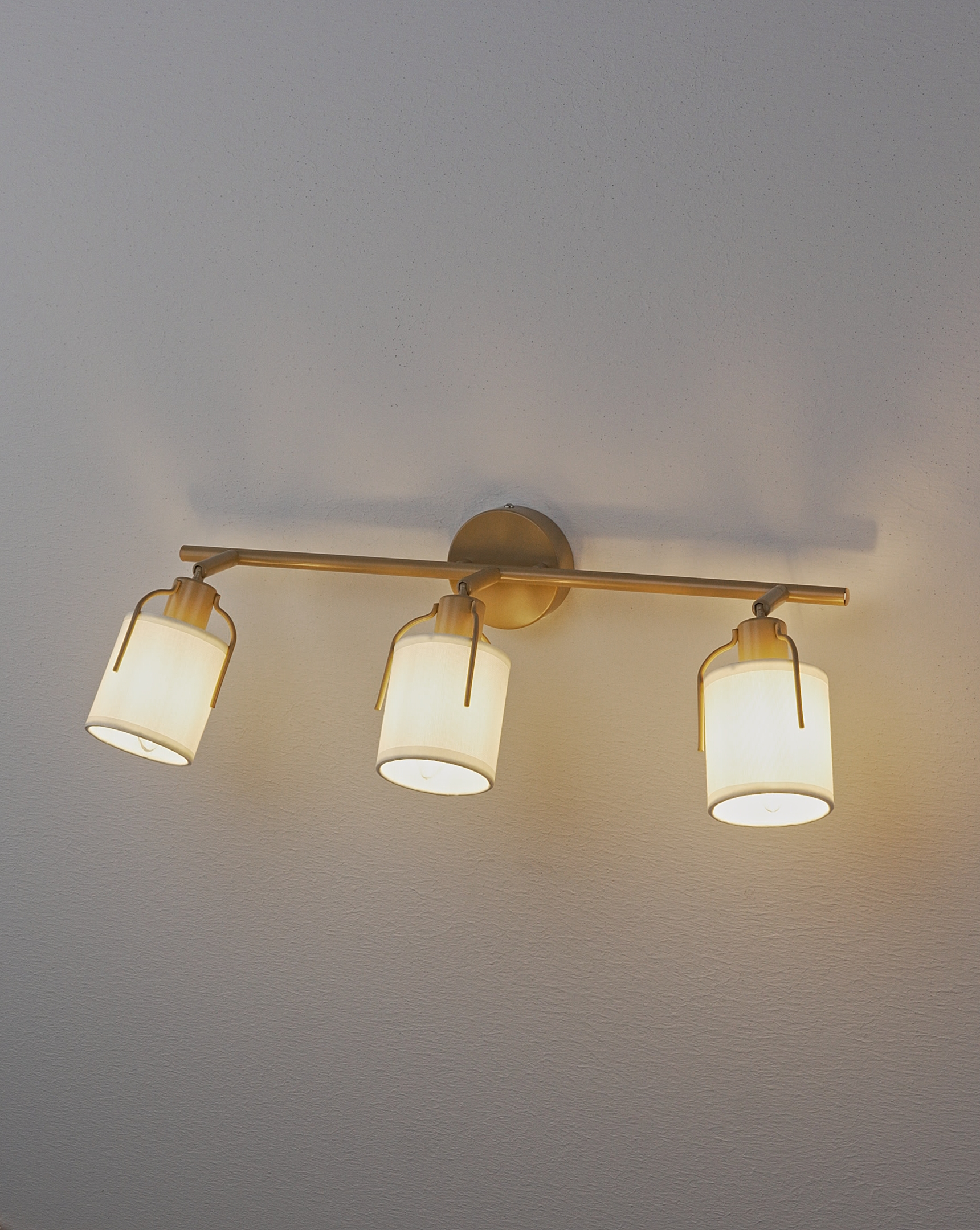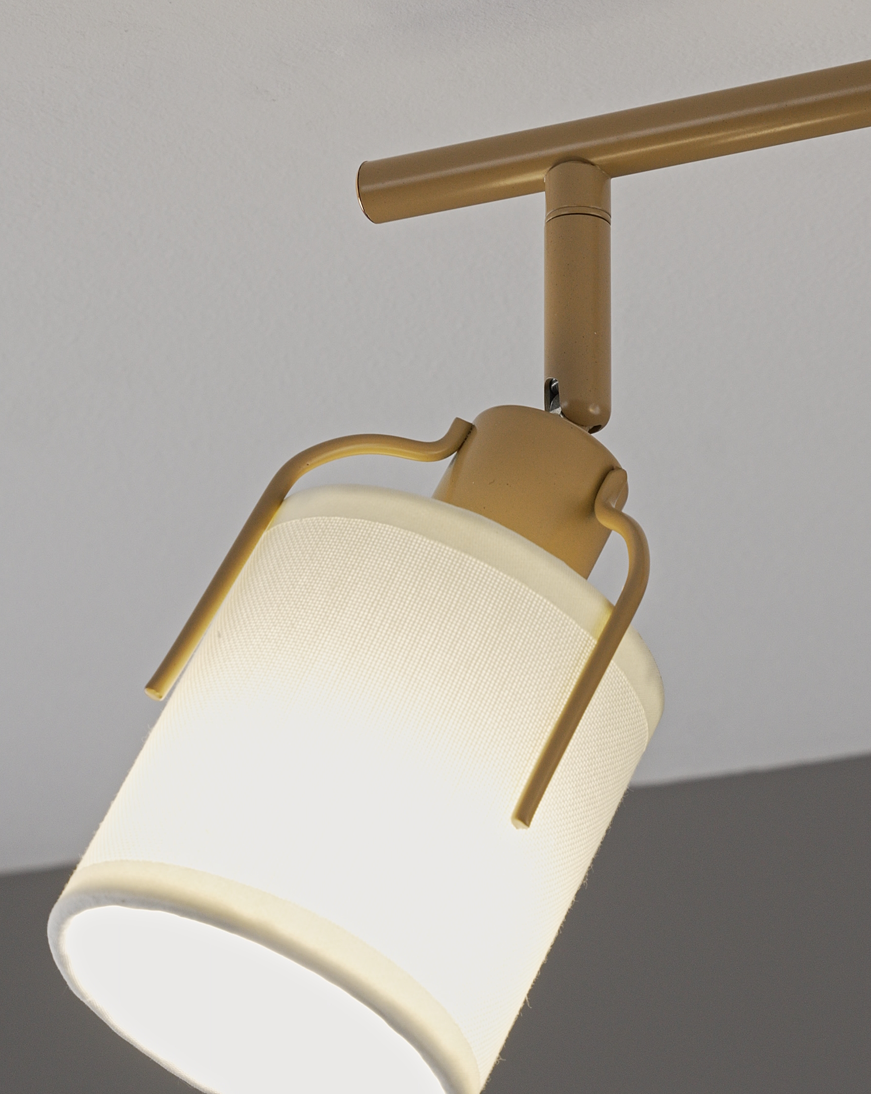 Плафоны изготовлены из прочного текстиля, корпус — из матового металла золотого цвета. Эти материалы устойчивы к повседневному износу и легко сочетаются с мебелью и отделкой в современном интерьере.