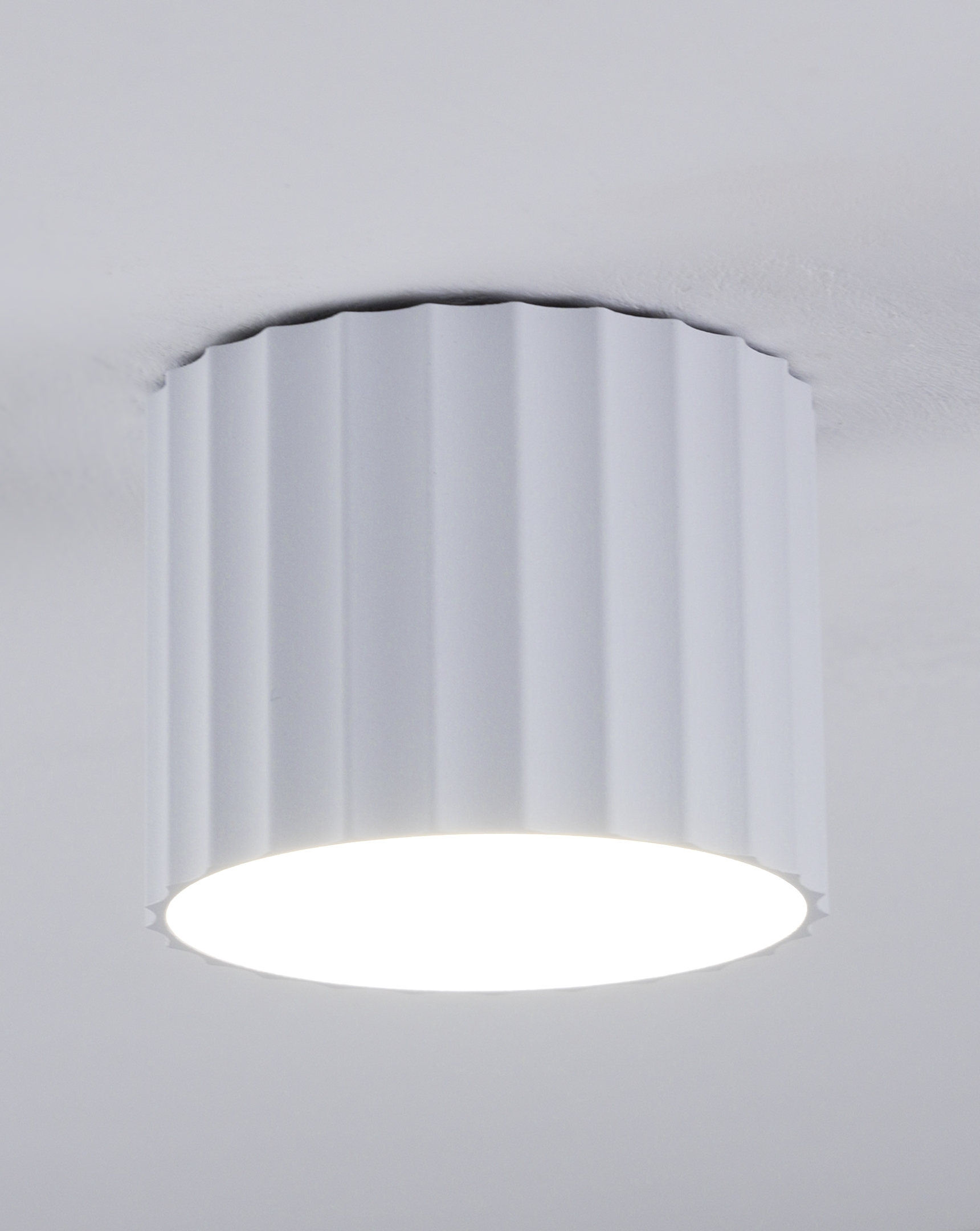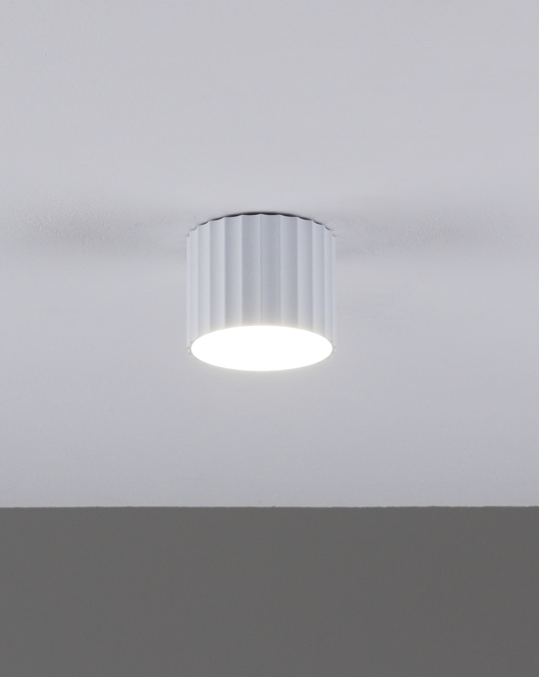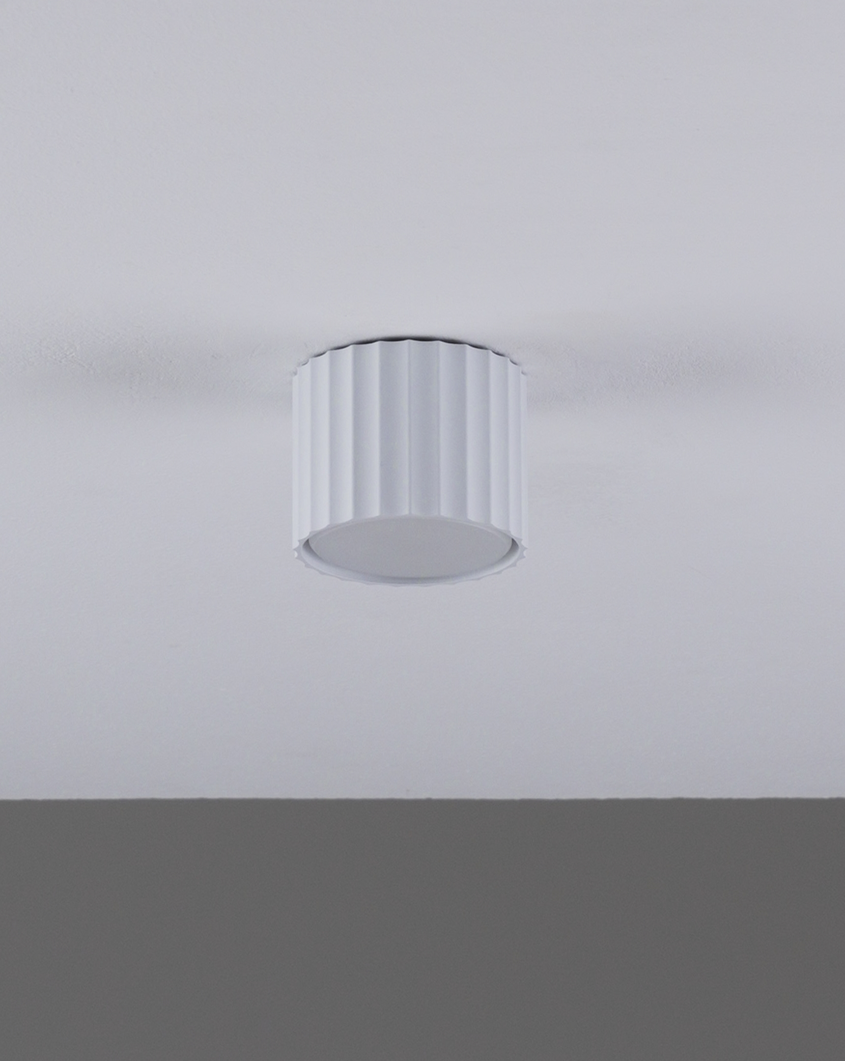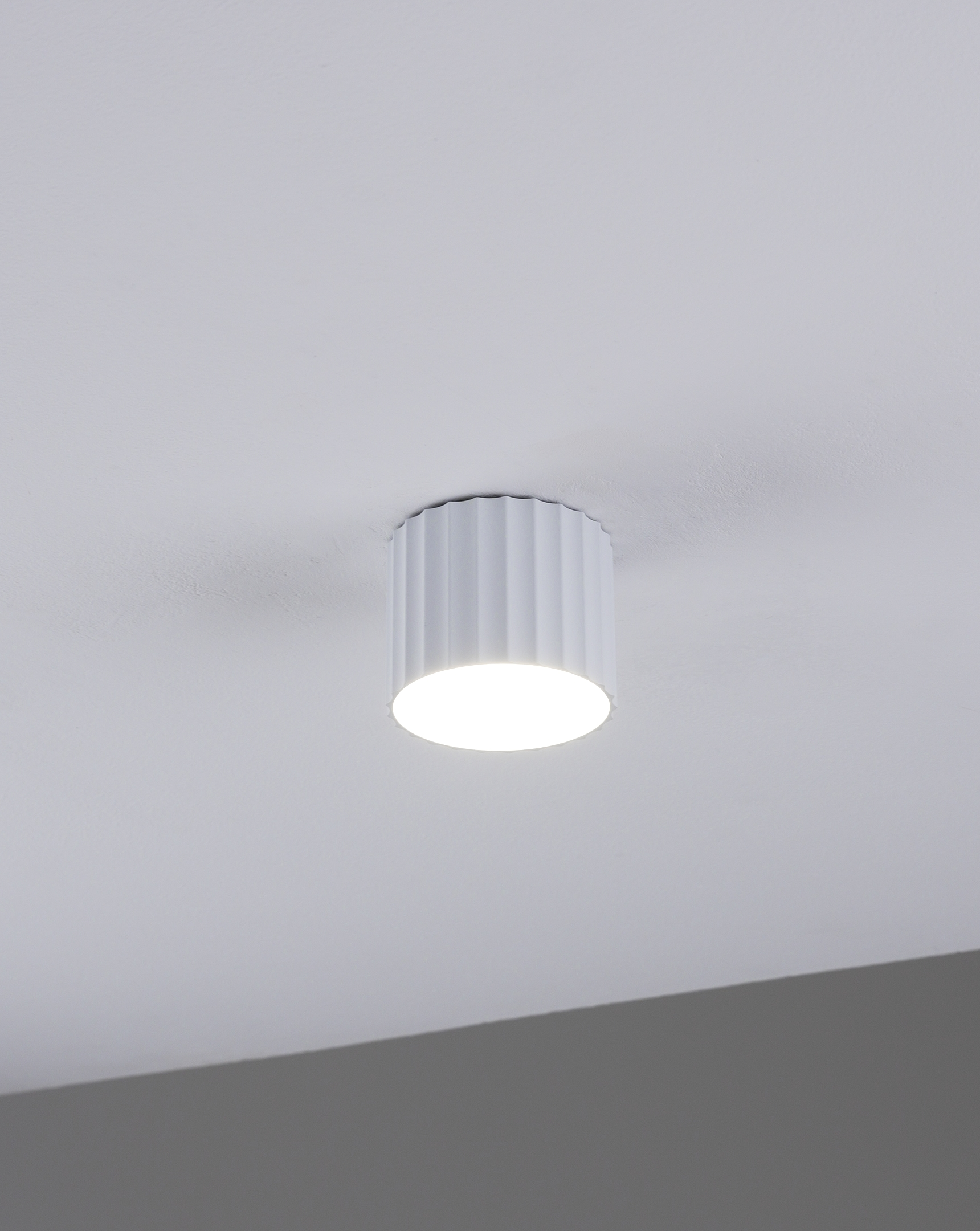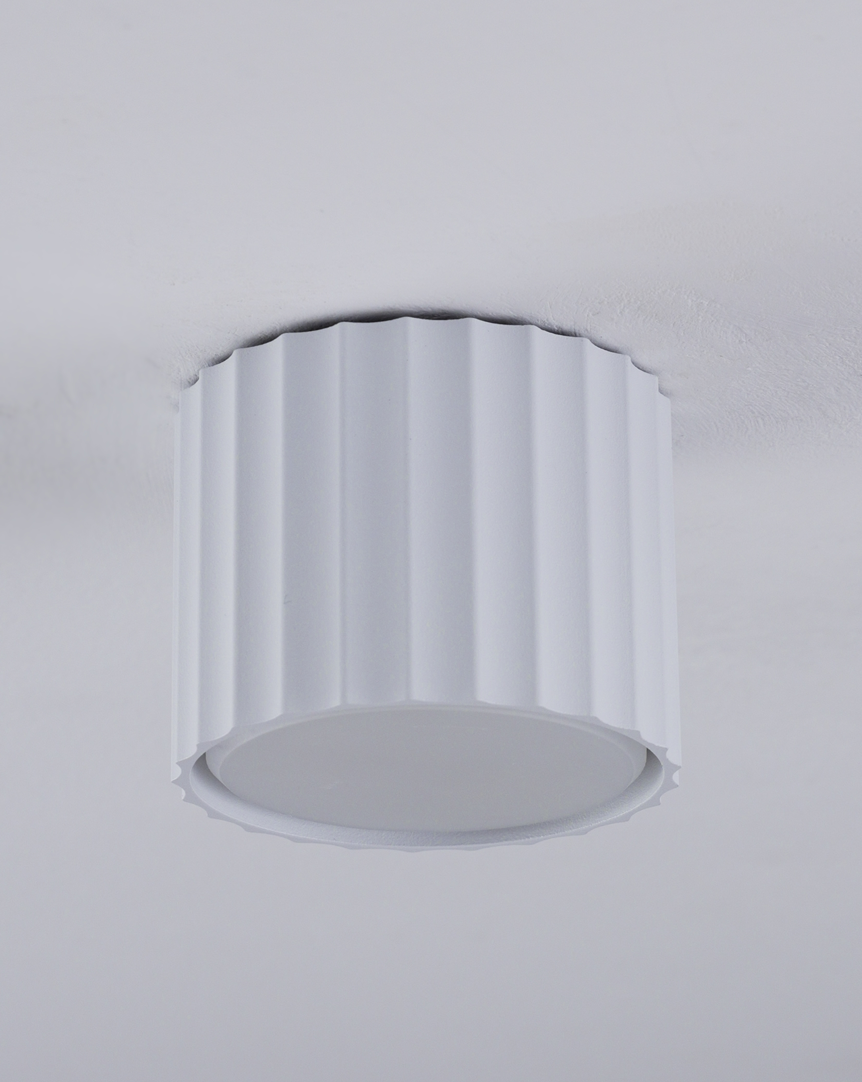 Плафон выполнен из прочного металла с матовым покрытием. Компактная цилиндрическая форма светильника с вертикальной ребристой фактурой и лаконичный цвет делают его универсальным и подходящим для разных интерьеров, от современных до лофт-стилей.