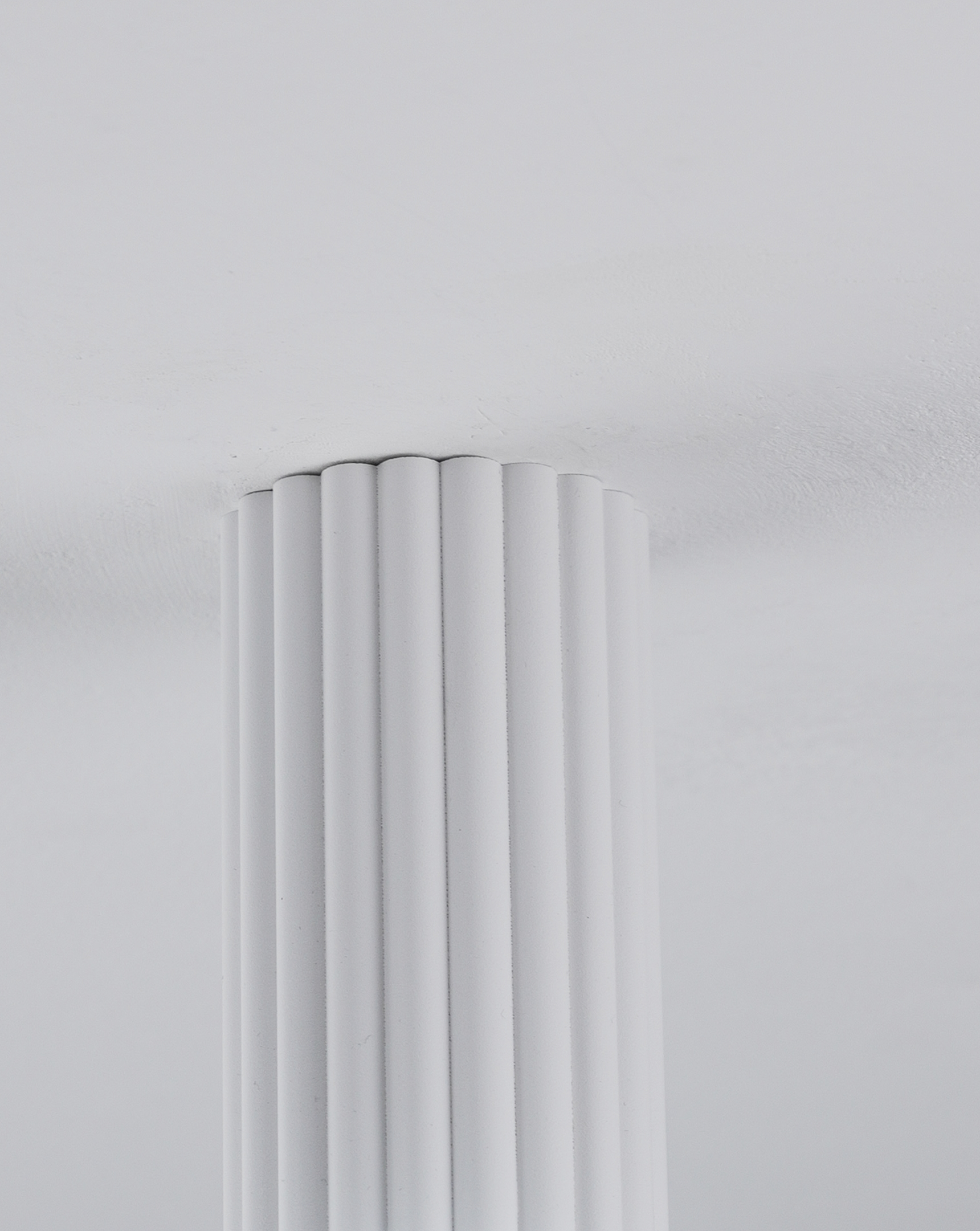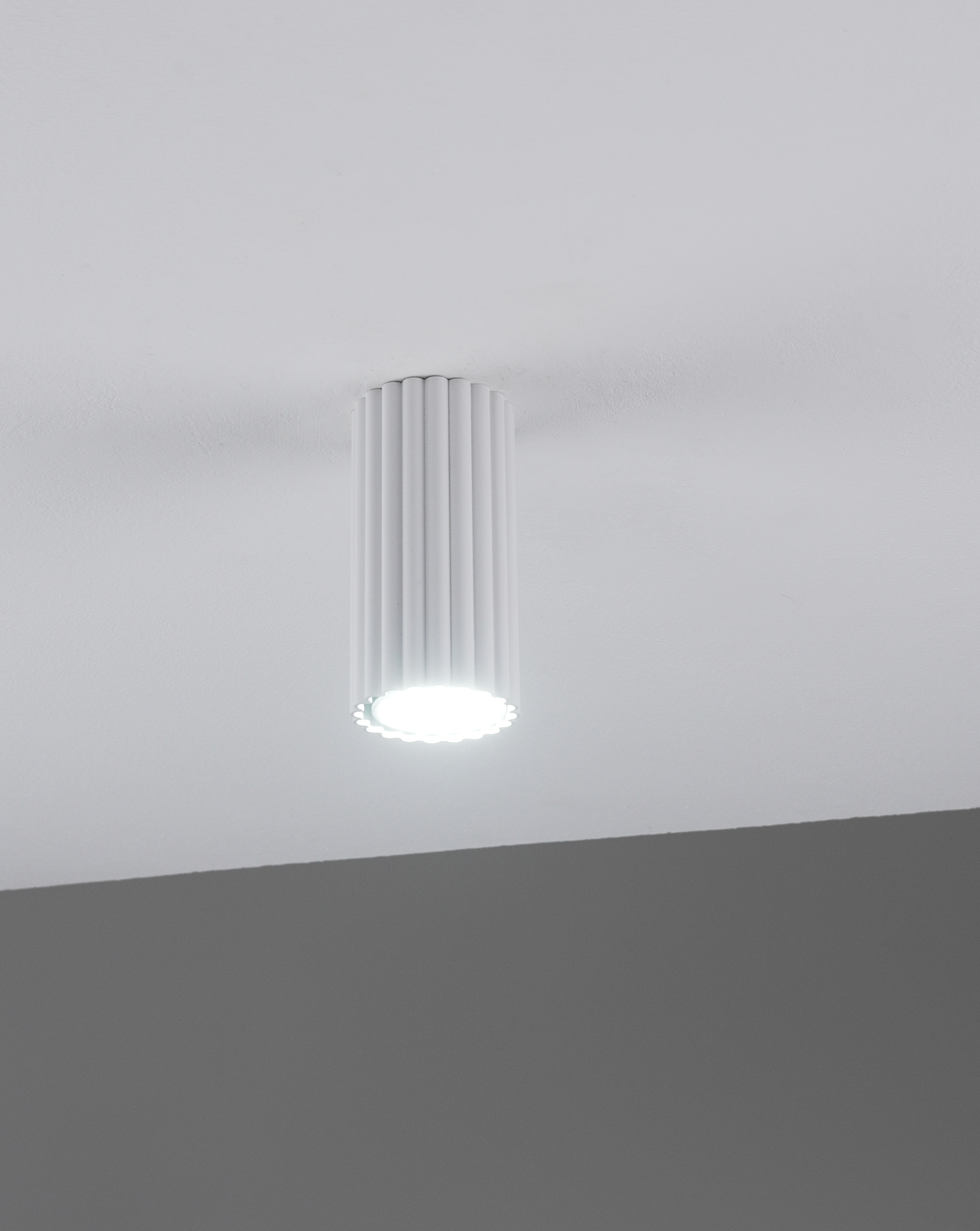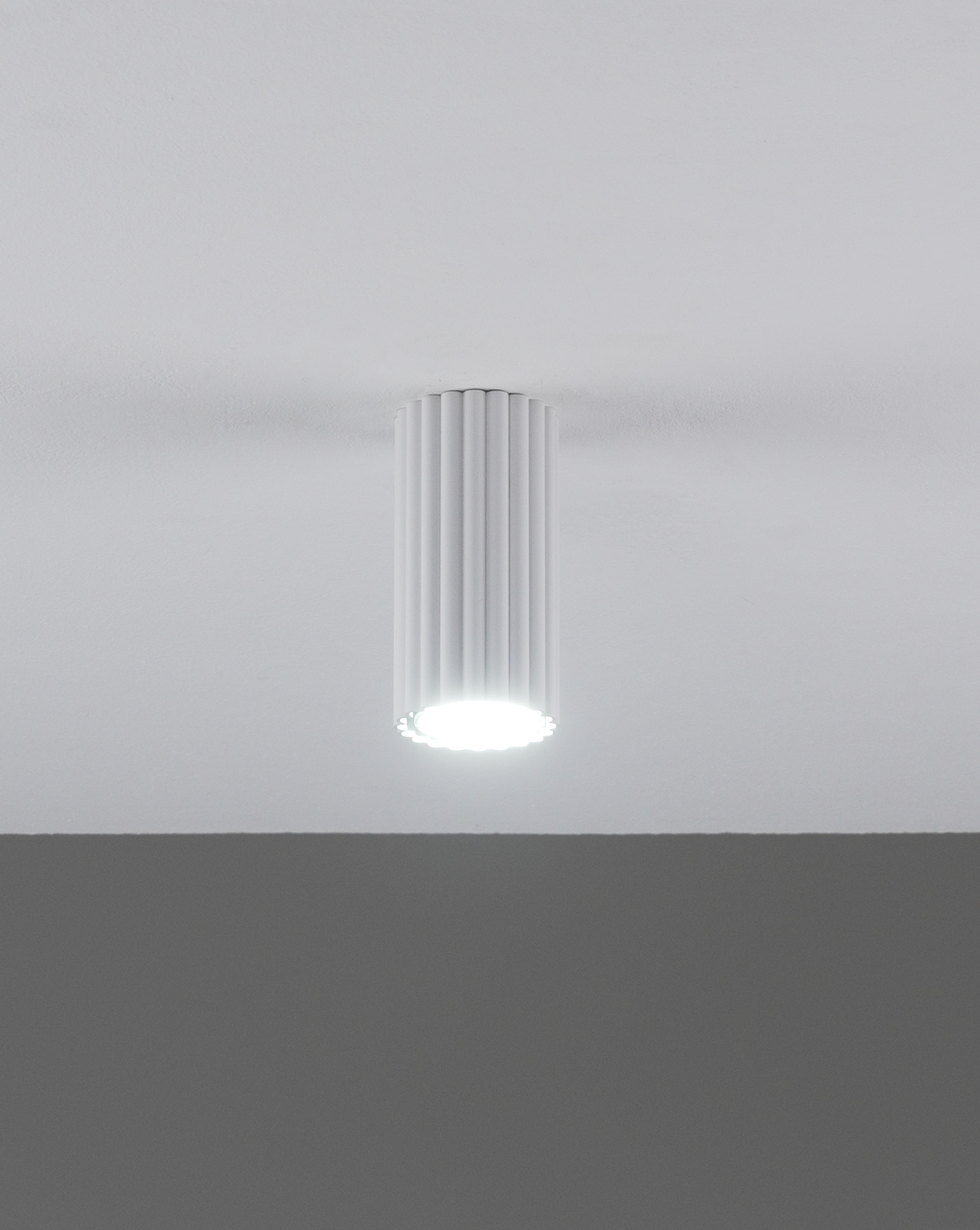 Плафон выполнен из прочного металла с матовым покрытием. Вытянутая цилиндрическая форма светильника с вертикальной ребристой фактурой и лаконичный цвет делают его универсальным и подходящим для разных интерьеров, от современных до лофт-стилей.