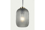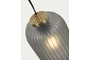 Потолочный светильник состоит из стеклянного абажура и круглого металлического основания. Абажур дымчатого цвета, с граненой фактурой. Его высота – 20 см, ширина – 12 см.
