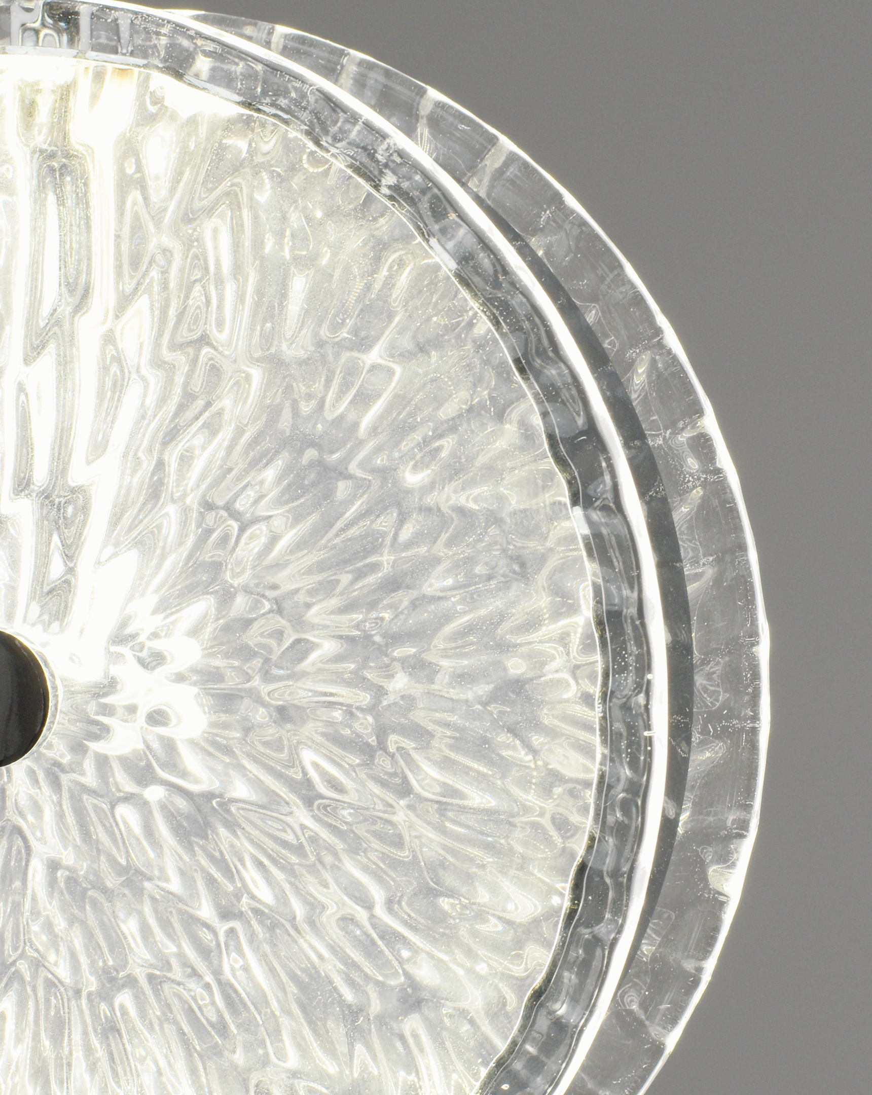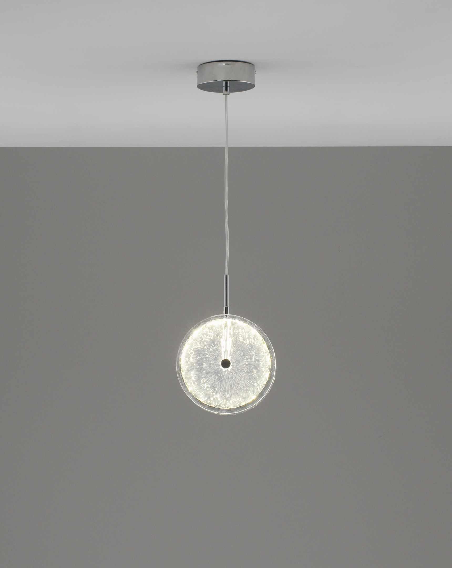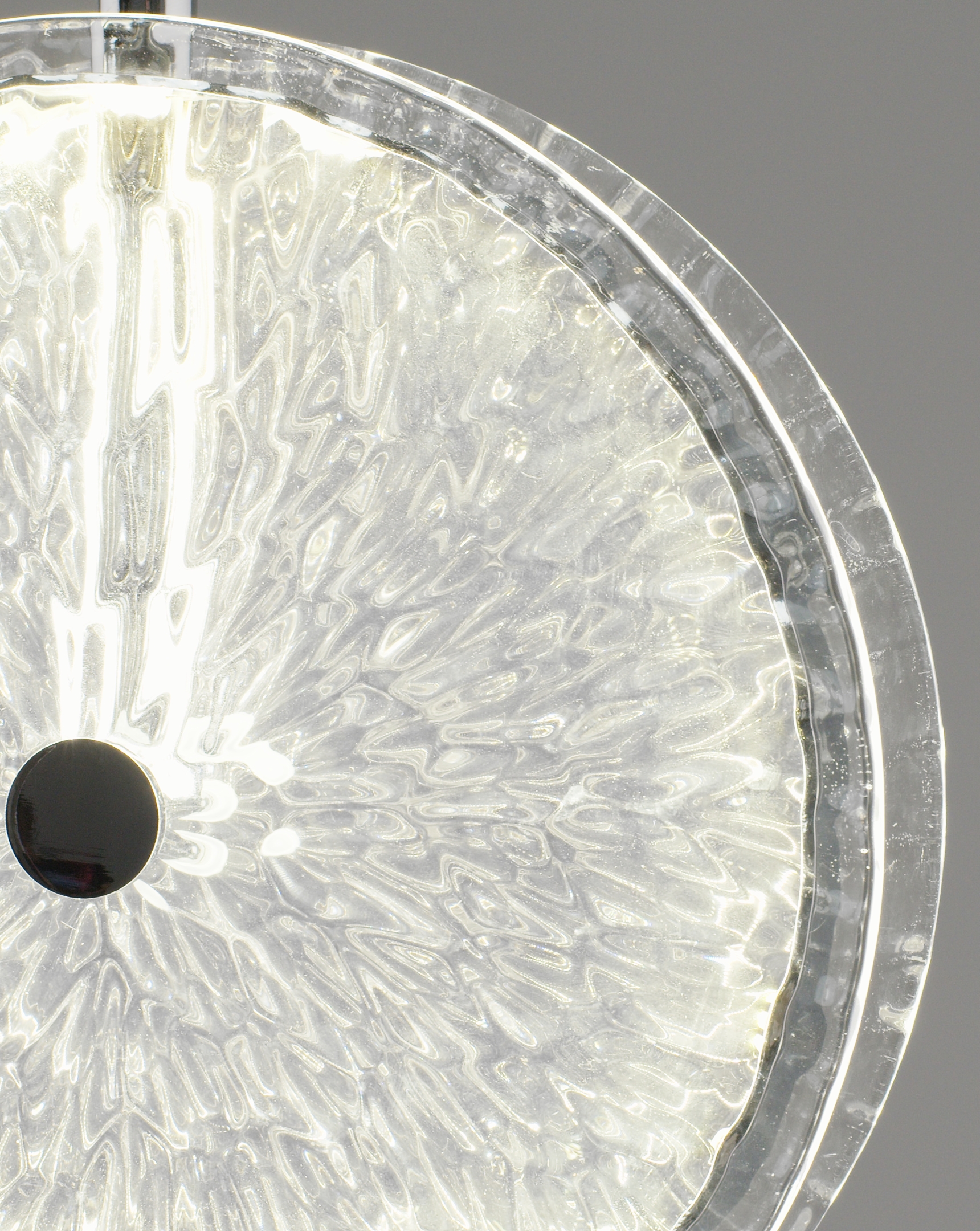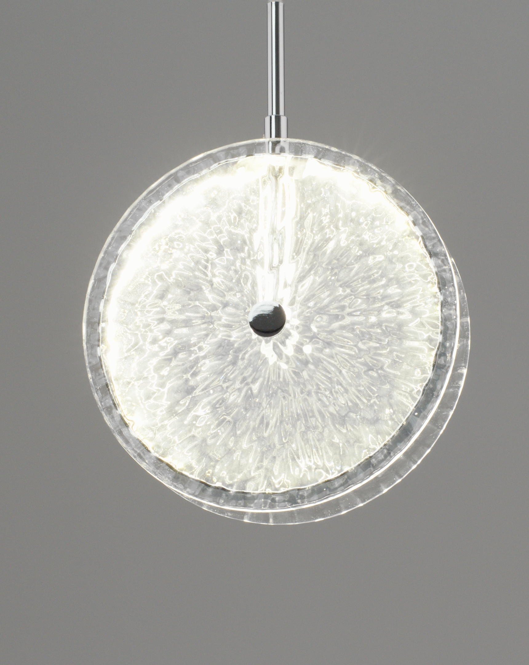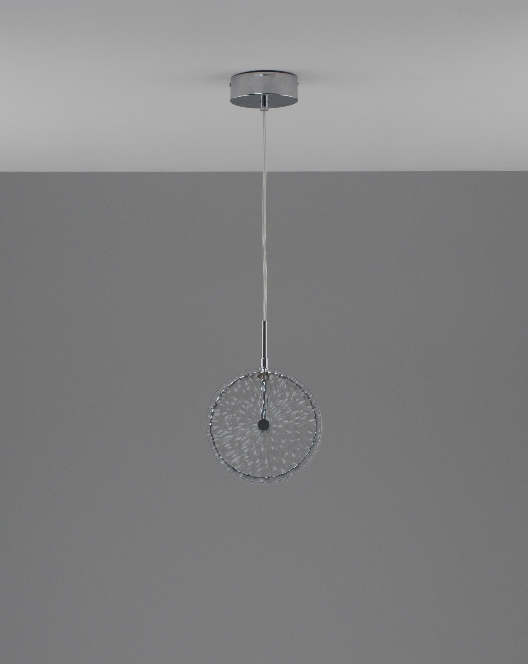 Элегантный дизайн. Подвесной светильник Marnia — это гармоничное сочетание минимализма и изысканного декора. Центральный элемент — круглый стеклянный плафон с рельефной фактурой, создающей эффект мерцающего сияния. Металлические детали с хромированным покрытием добавляют современности и утонченности.