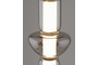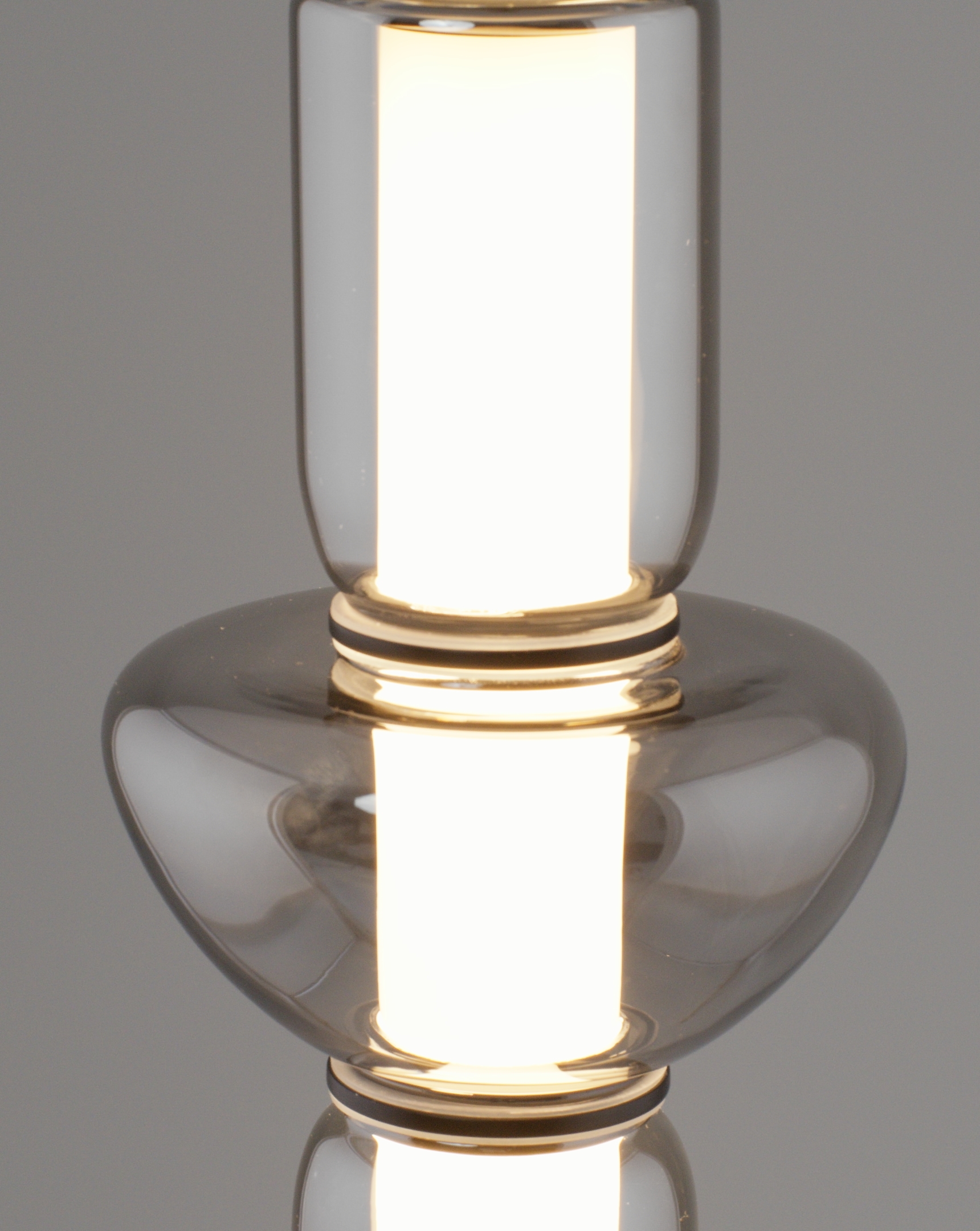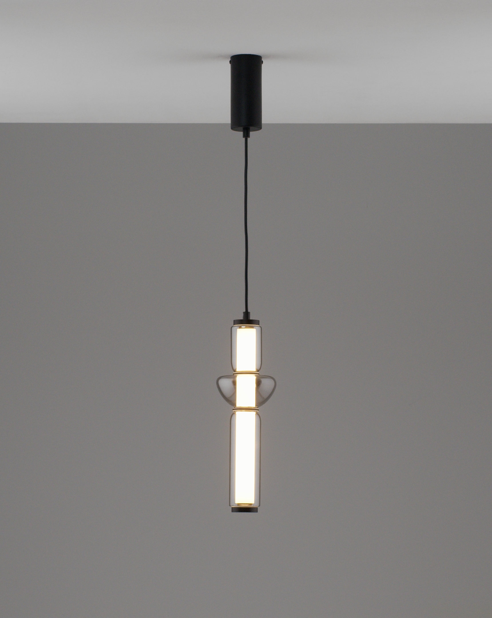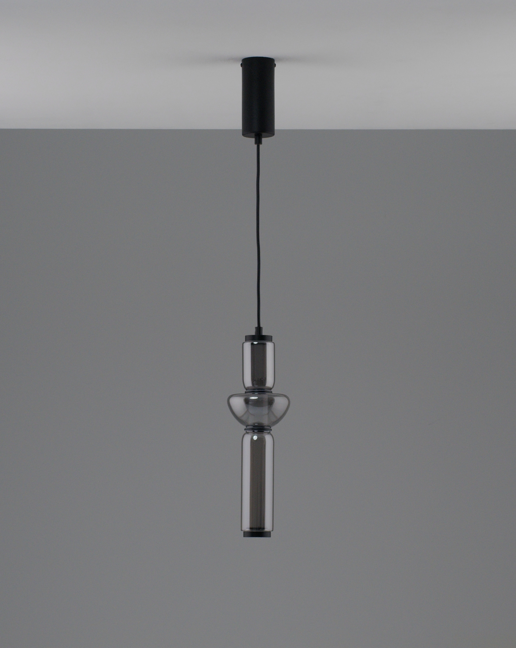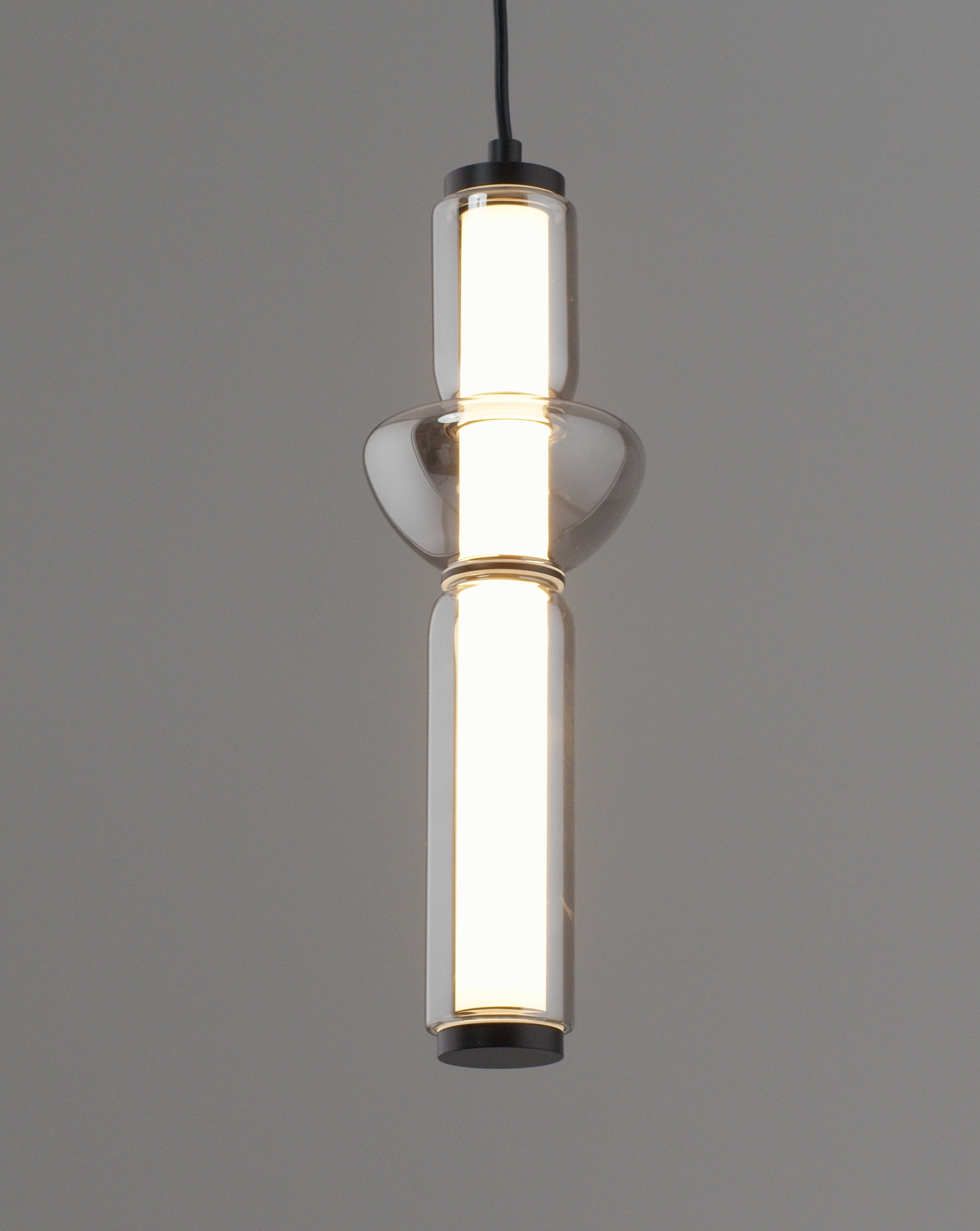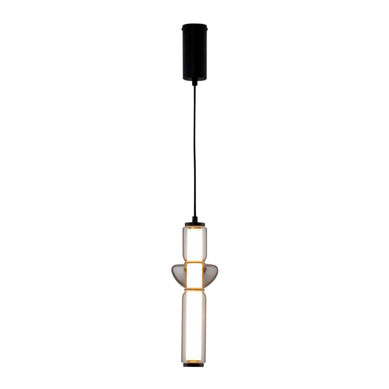 Особенности дизайна и материалы. Корпус выполнен из прочного металла черного матового цвета, который придает светильнику элегантность и стильный вид. Он выполнен с плавными и округлыми линиями, создавая гармоничную цилиндрическую форму, в которой стеклянный плафон чередуется с металлическими элементами. Стекло в плафоне прозрачное, с эффектом легкой серой дымки, что придает светильнику изысканность.