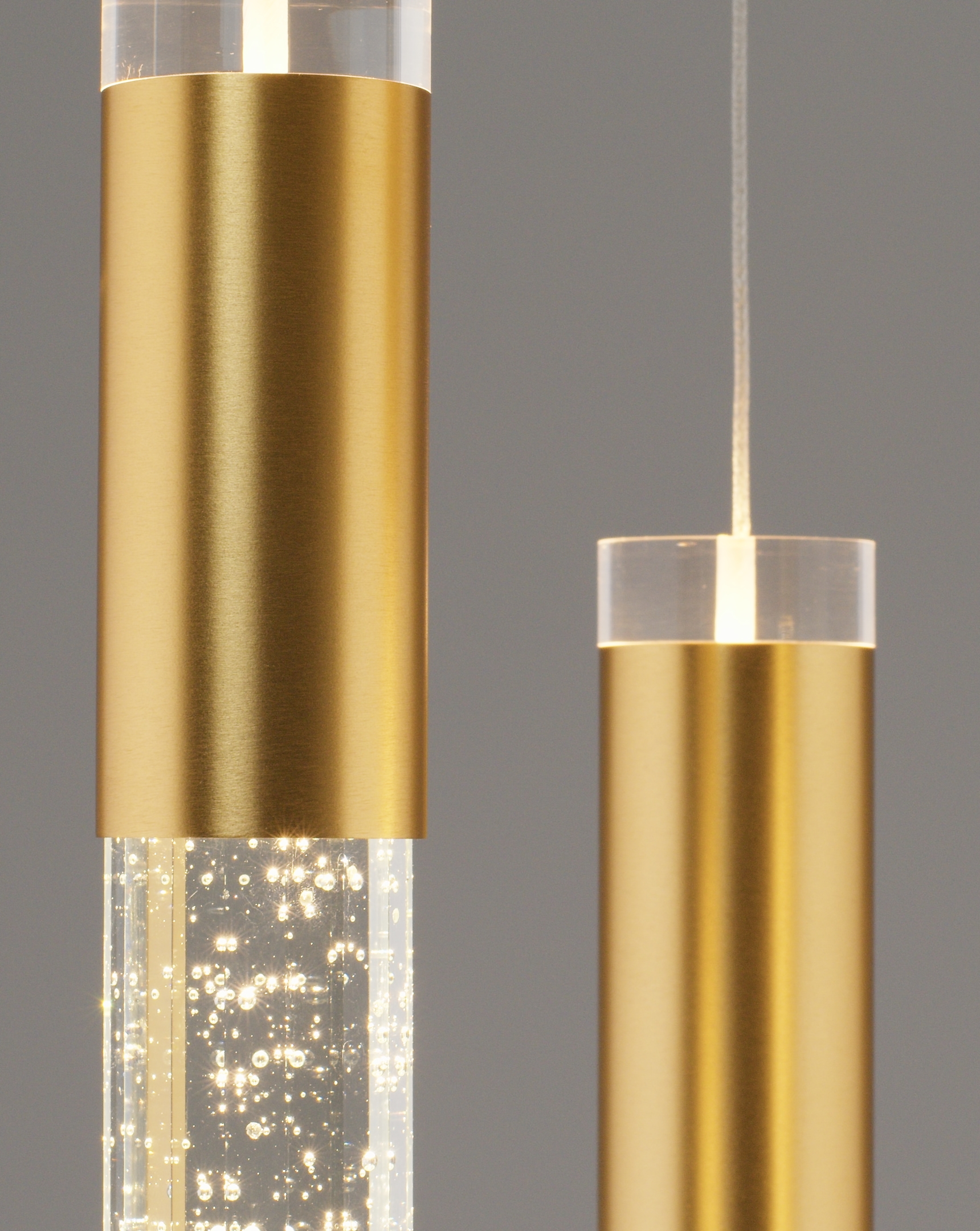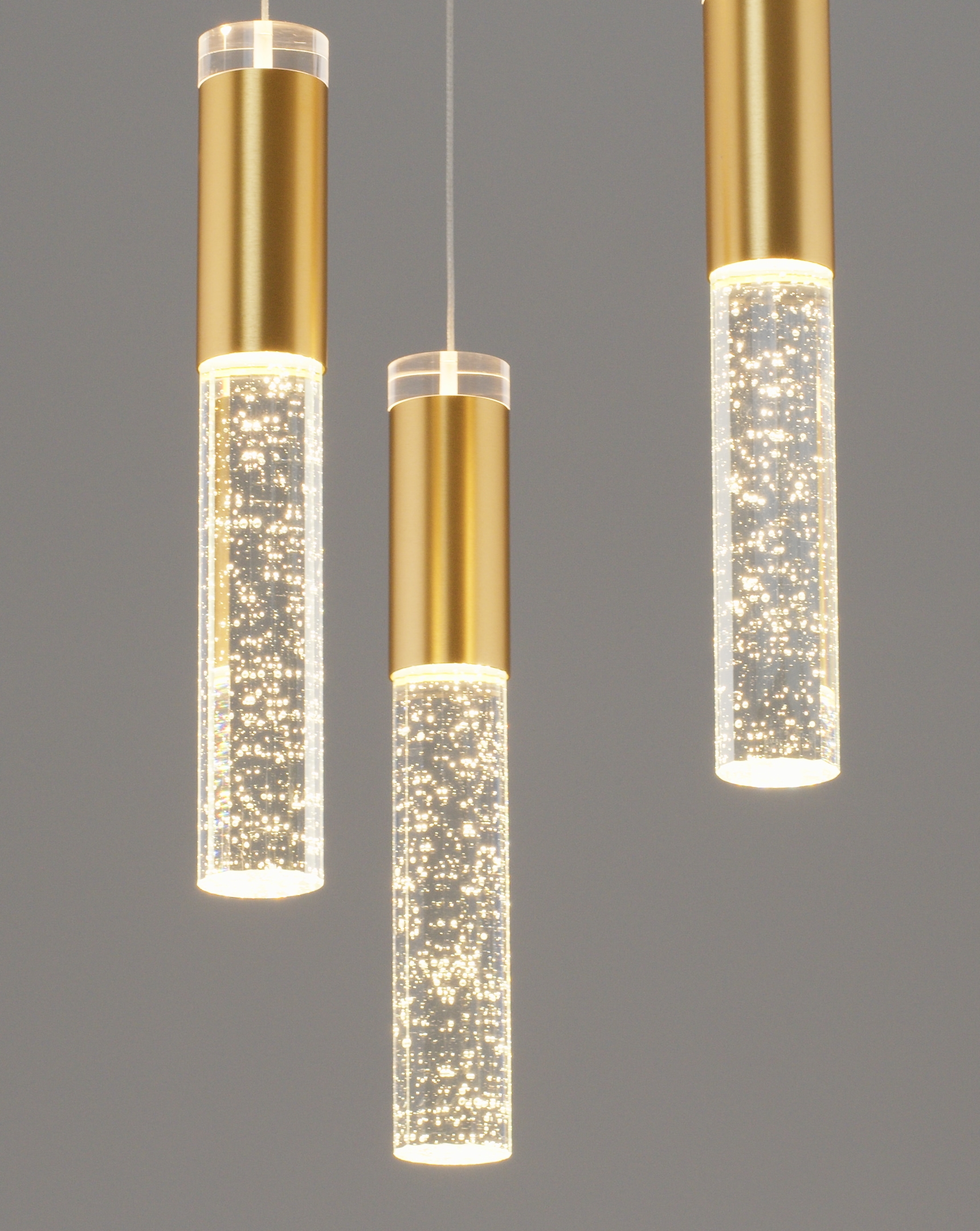 Особенности дизайна и материалы. Светильник имеет современный и элегантный дизайн в стиле хай-тек. Цилиндрические плафоны выполнены из прозрачного акрила, внутри которых, создается впечатление, находятся пузырьки воздуха, придающие светильнику уникальность, создавая эффект легкости и воздушности. Белый металлический корпус дополняет декоративный элемент, придавая всей конструкции минималистичный и стильный образ.