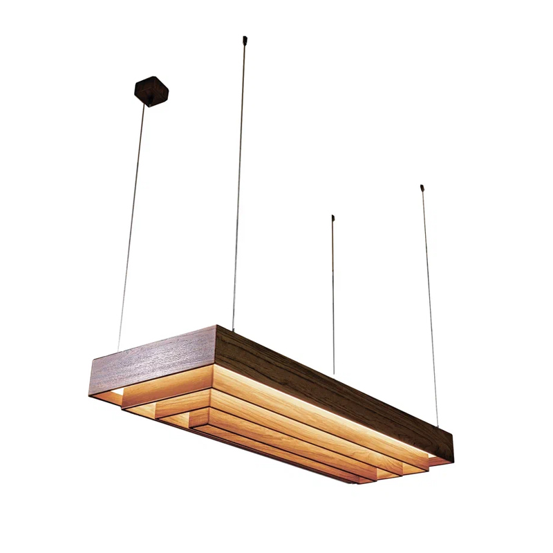 Дизайн светодиодной конструкции, выполненной из натурального дерева, основан на принципе матрешки. Благодаря разным размерам прямоугольных элементов объемный потолочный светильник выглядит легким, равномерно распределяя свет. Экран из молочного оргстекла создаст эффект мягкого рассеивания.