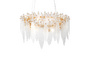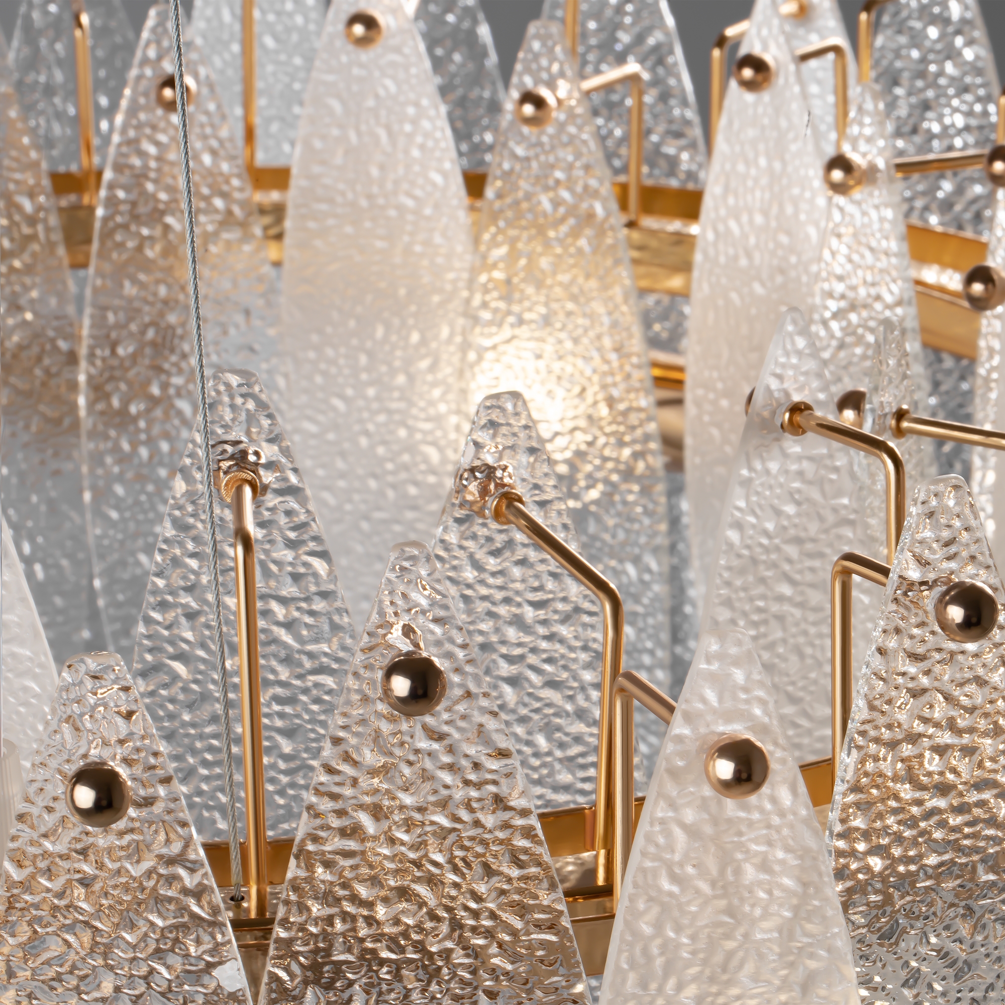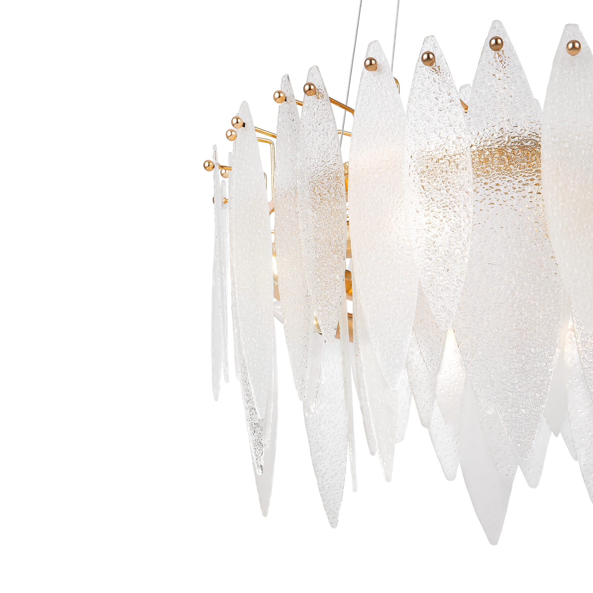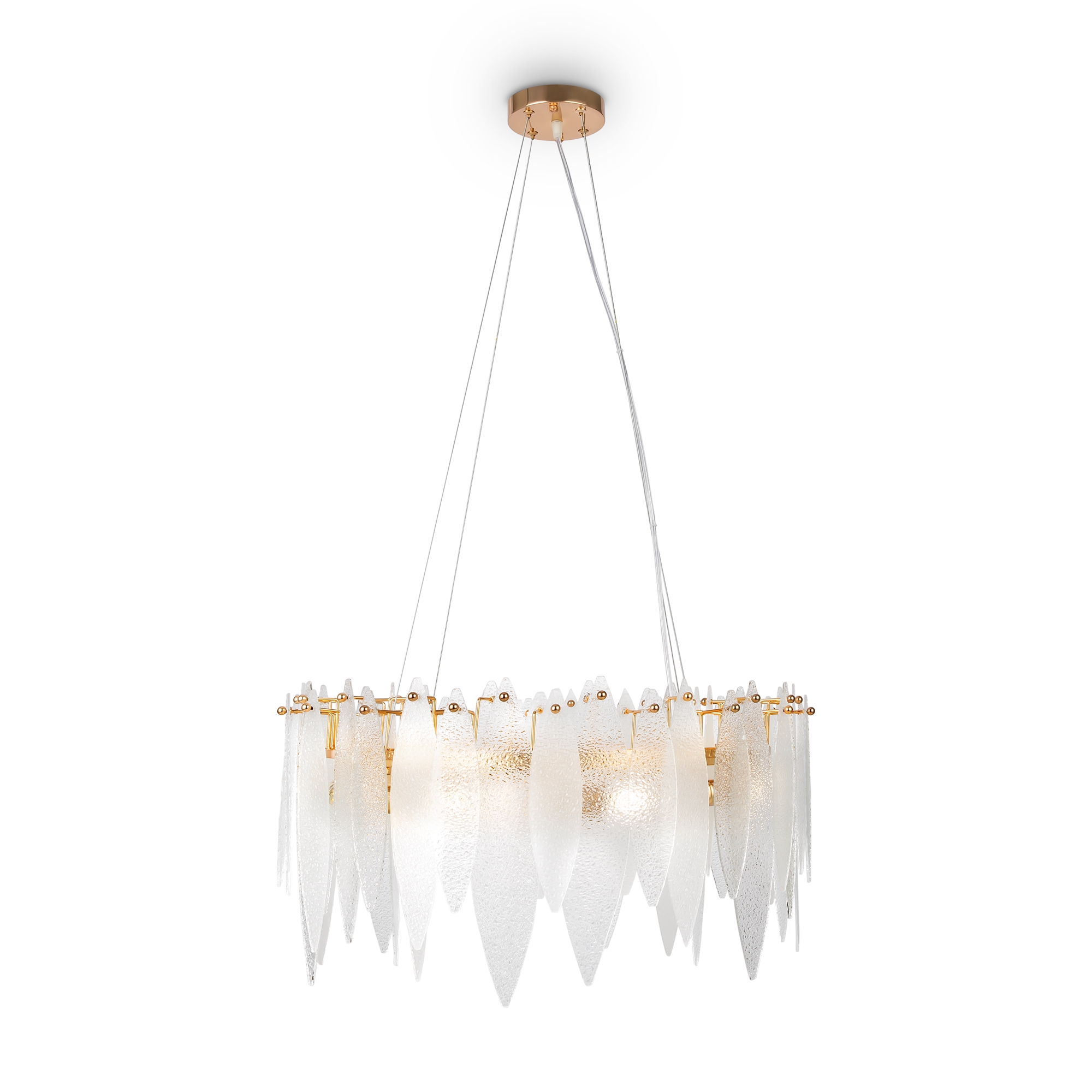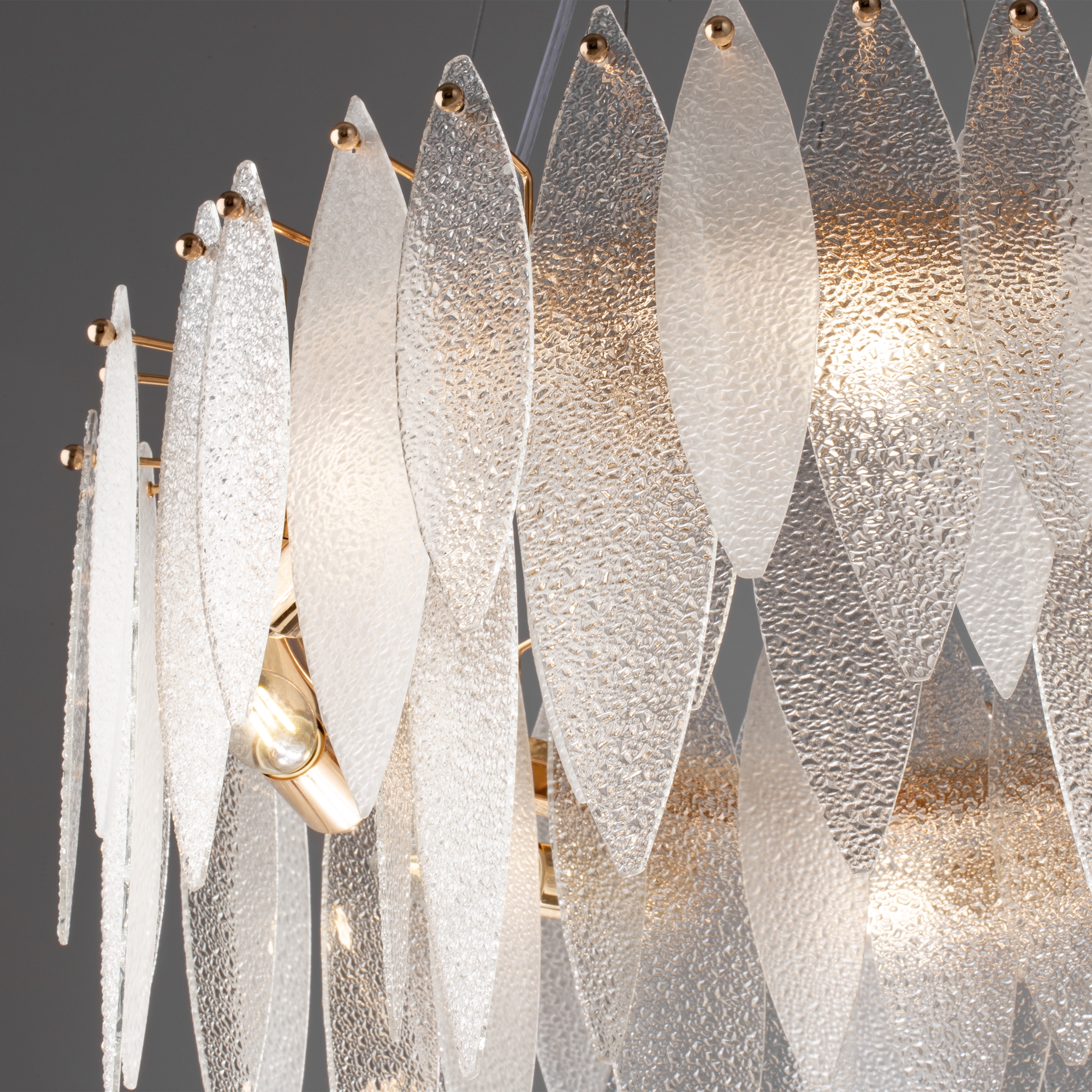 Запросить индивидуальное предложениеLucrecia – серия с выразительным характером и романтичным настроением. Визуально легкий силуэт составляют несколько рядов стеклянных подвесок, обрамляющих металлическую окружность. Обтекаемые контуры лепестков и живописная фактура «замороженного» стекла – тренд светодизайна. Металлические элементы, окрашенные в цвет французского золота, подчеркивают праздничное настроение модели. Расположенные вдоль окружности источники света обеспечивают равномерное распределение светового потока. Отражаясь и преломляясь в декоре, он образует красочную игру бликов и переливов. Длина тросов регулируется, что позволяет адаптировать подвесные светильники под любую высоту потолков. Серия включает бра и люстры на 5 и 8 ламп. С помощью такого светового ансамбля легко организовать комплексное освещение гостиной, спальни или столовой. Воздушный невесомый дизайн интегрируется в современные и классические стили – от фьюжн и шебби-шика до ар-деко. Материал арматуры – металл. Цвет – французское золото.