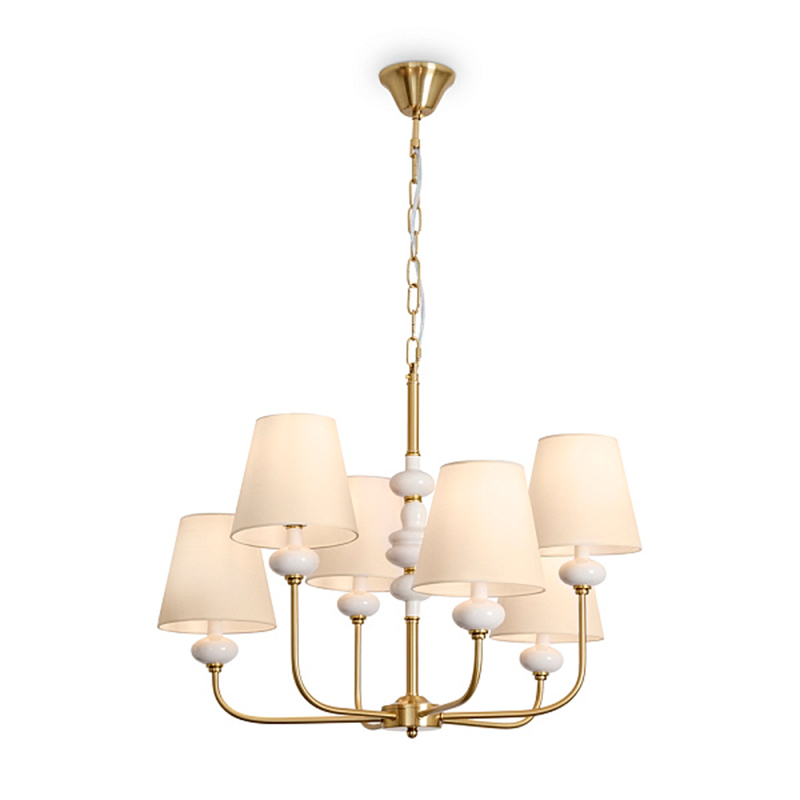 Запросить индивидуальное предложениеПодвесные светильники серии Evelyn воплощают гармонию классической элегантности и современных линий. Рельефные керамические элементы добавляют светильникам особую тактильность и глубину, а благородная латунь металлической арматуры создает теплое, праздничное настроение. Белоснежные абажуры из гладкой натуральной ткани мягко рассеивают свет, подчеркивая утонченность дизайна. В коллекции представлены варианты с разным количеством источников света — от лаконичной модели с одним до роскошных люстр с шестью и восемью рожков. Настенное бра позволяет создать целостное световое оформление помещения. Серия Evelyn привносит в современное пространство дух французского прованса, но делает это деликатно, через выверенный баланс текстур и материалов. Каждая керамическая деталь, каждый изгиб латуни создает атмосферу легкой и непринужденной элегантности.