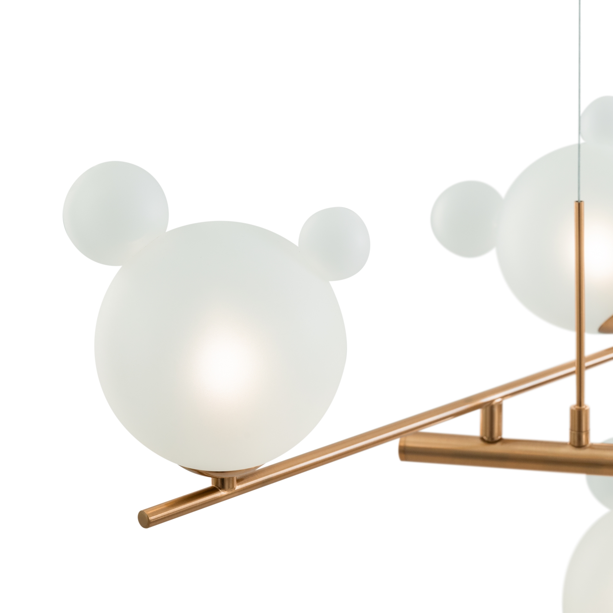 Запросить индивидуальное предложениеАрматура — металл, цвет— латунь. Белые плафоны из стекла с декоративными “ушками” - напоминают образ знаменитого диснеевского героя. Ассиметричный силуэт создает эффект подвижной игры. Высота подвесных моделей регулируется. Источник света - лампа с цоколем G9