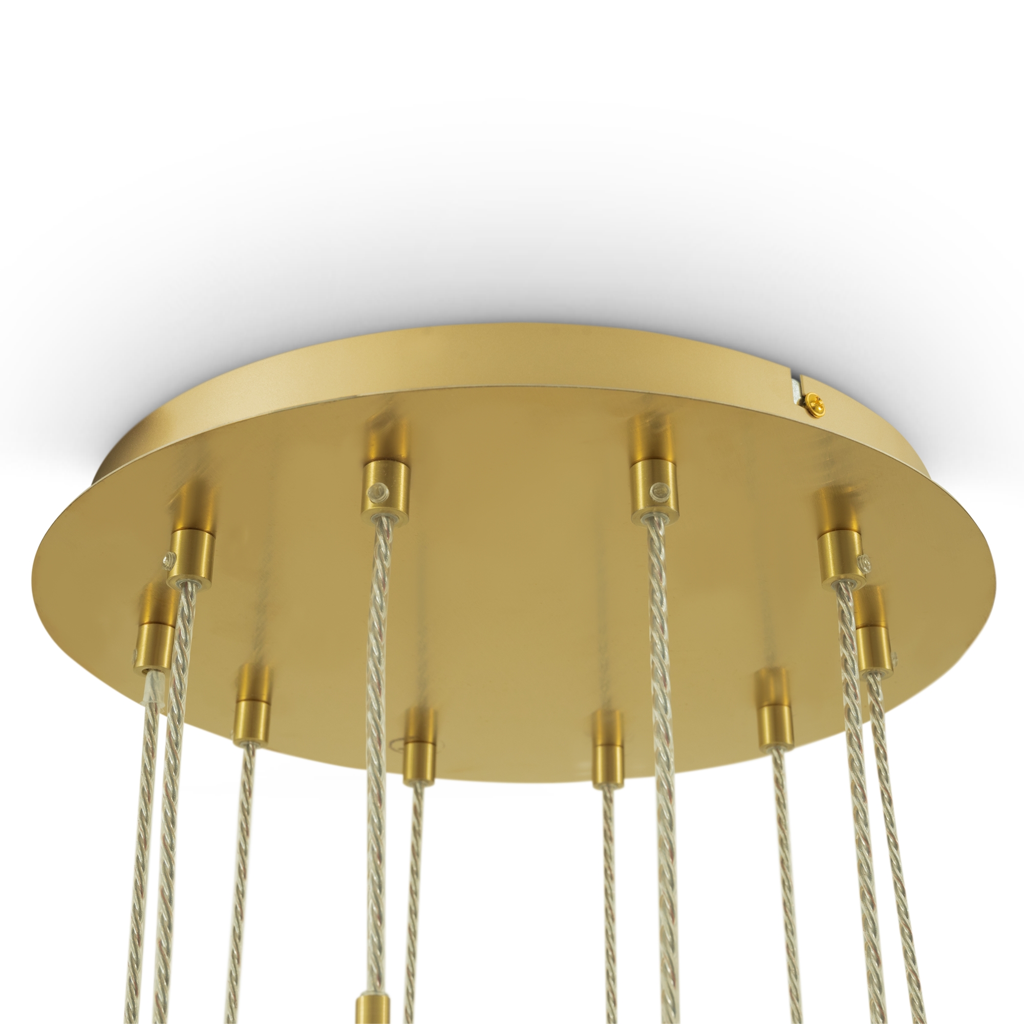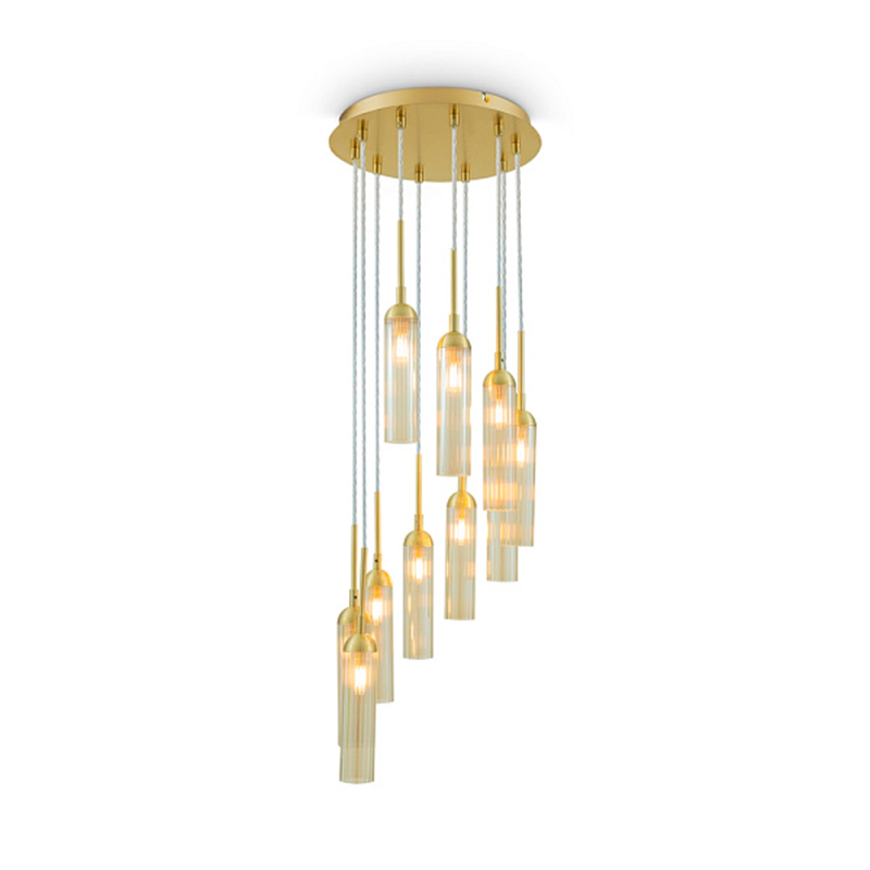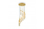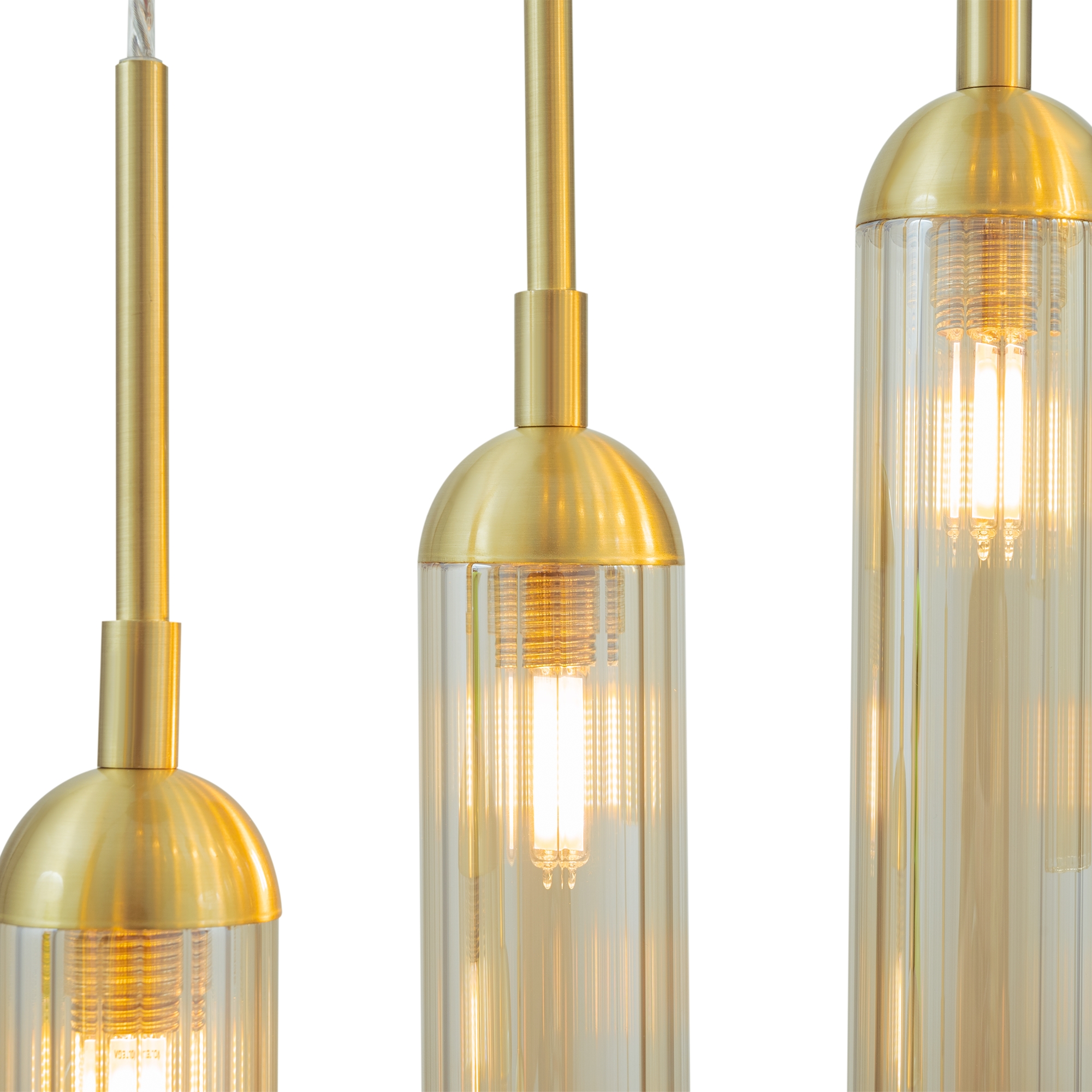 Запросить индивидуальное предложениеАрматура из металла, цвет — золото. Рельефные плафоны в тренде ZIGZAG. Материал — стекло, цвет — янтарный. Высота подвесных светильников регулируется. Плафоны закреплены на металлическую сферу. Источник света — лампа с цоколем G9.