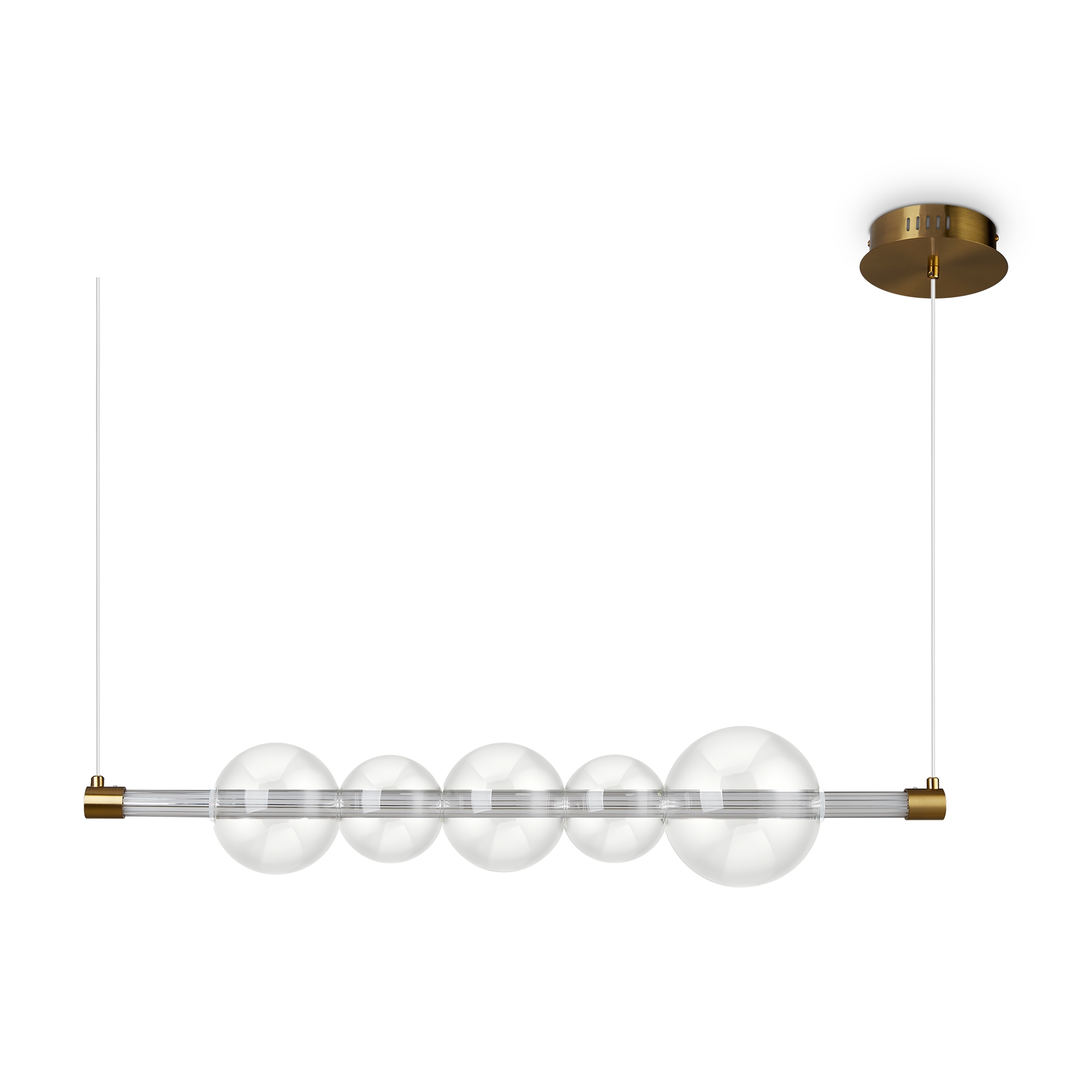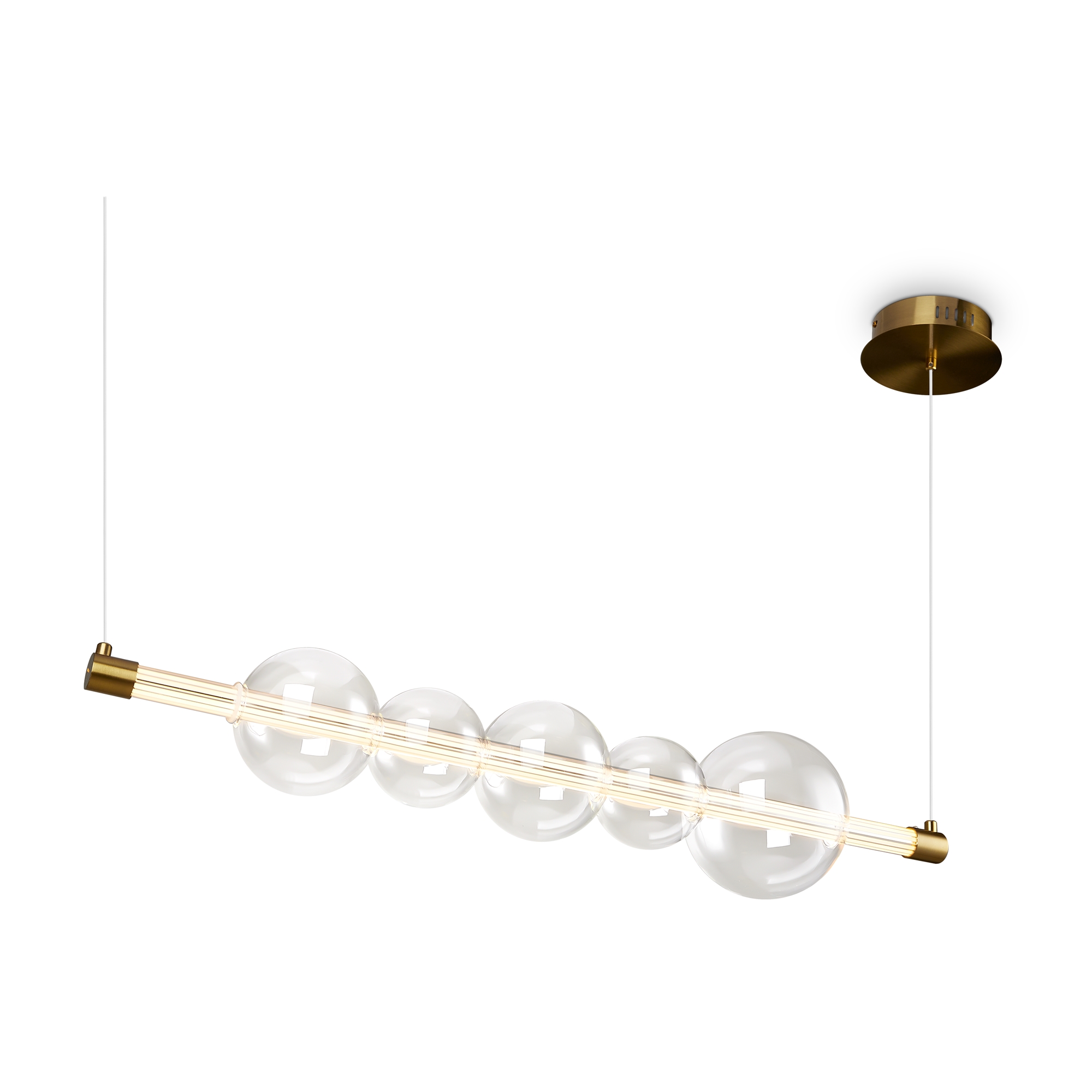 Запросить индивидуальное предложениеАрматура — металл, цвет — латунь. Тренд «invisible light» - LED-источник света скрыт в горизонтальной стеклянной трубке, пронизывая ряд декоративных плафонов-шаров разного размера из прозрачного стекла. Воздушная минималистичная горизонтальная конструкция. Регулируемая высота. Цветовая температура - 3000К.
