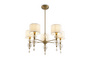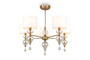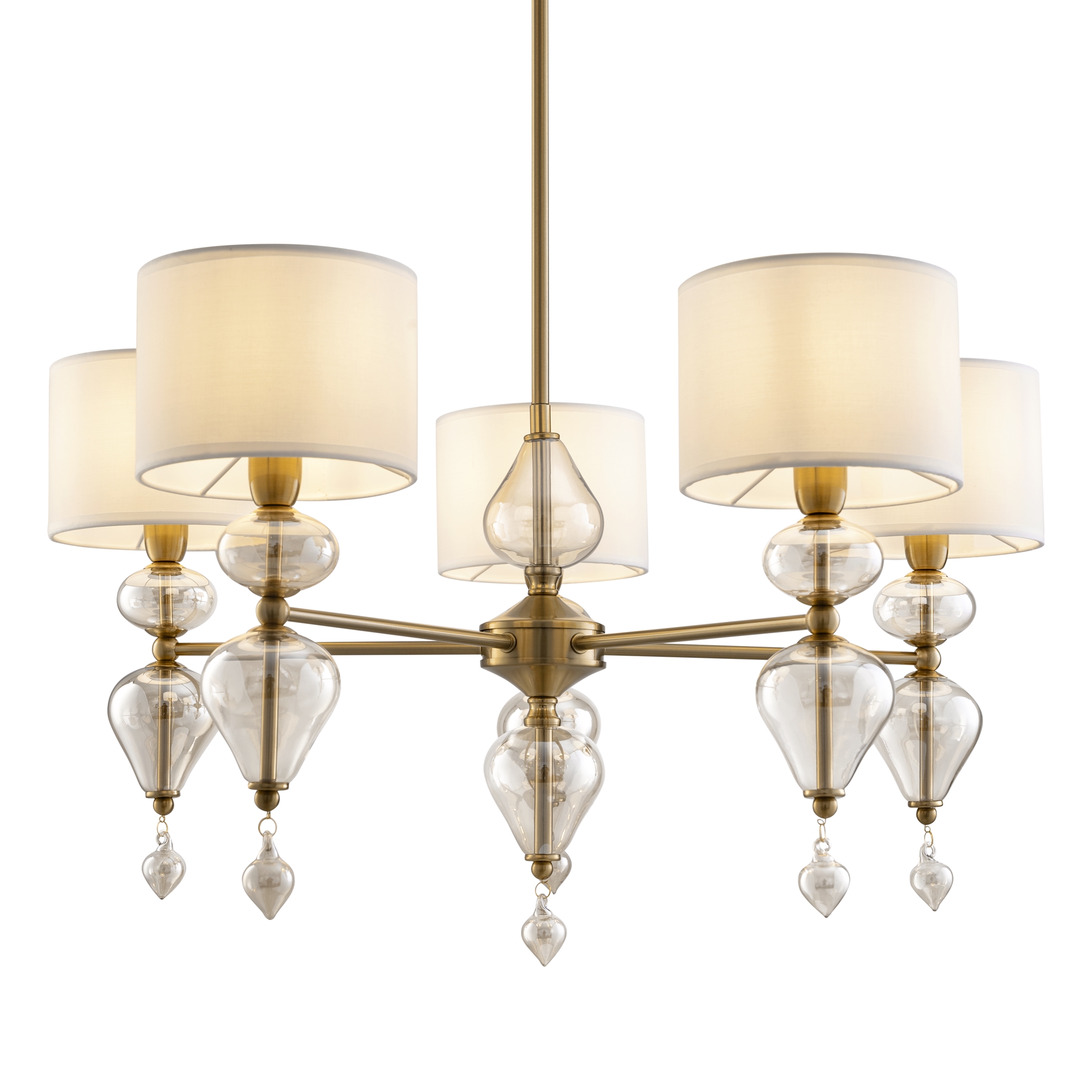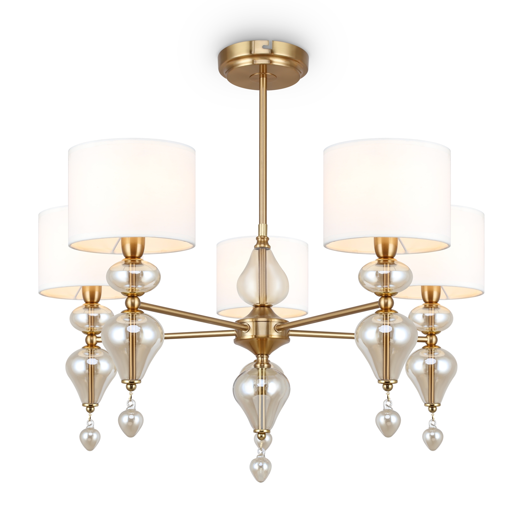 Запросить индивидуальное предложениеАрматура из металла, цвет — латунь. Плафоны — тканевые, молочного цвета. Металлическая конструкция декорирована выдувными стеклянными элементами с перламутровым напылением. Источником света служит лампа с цоколем Е14.