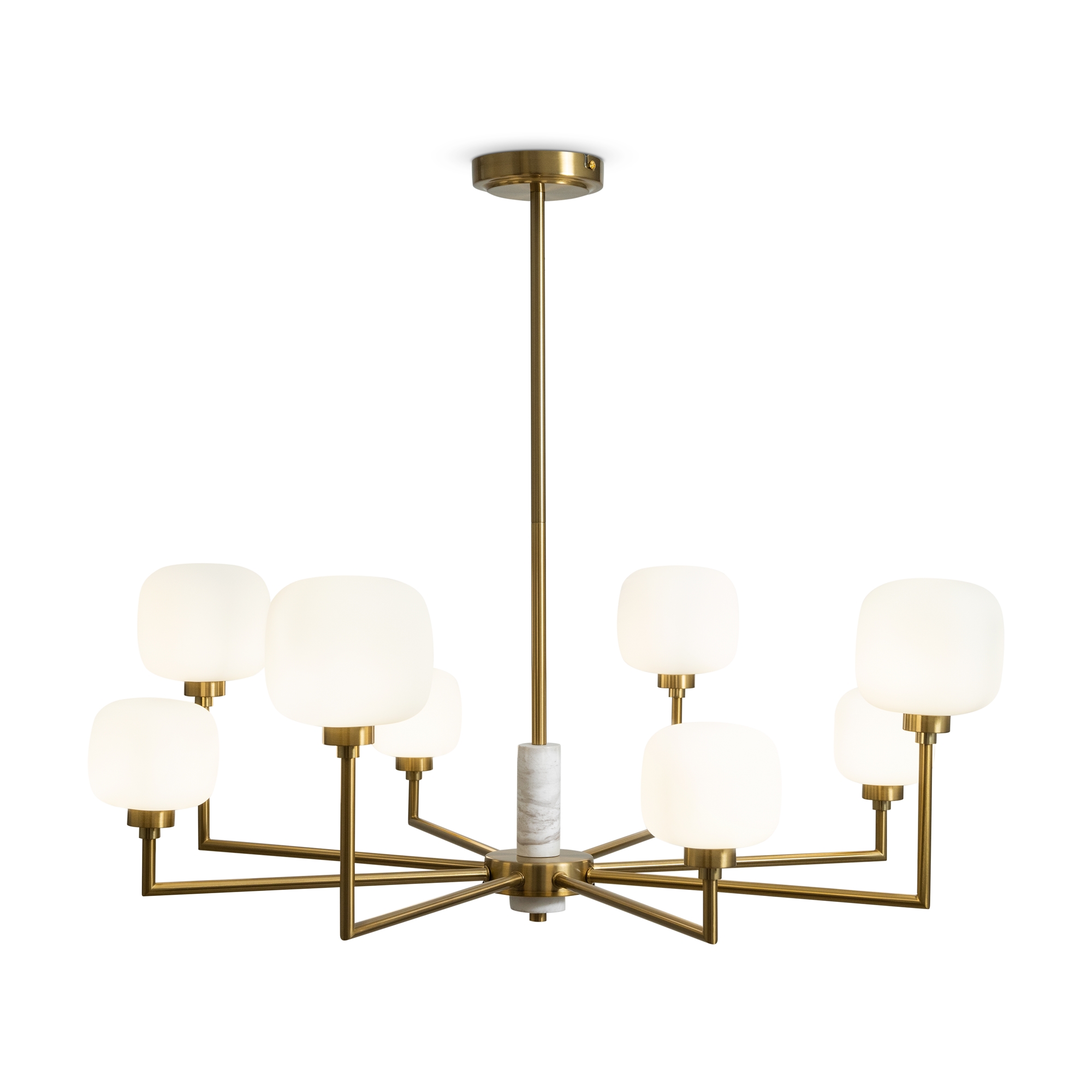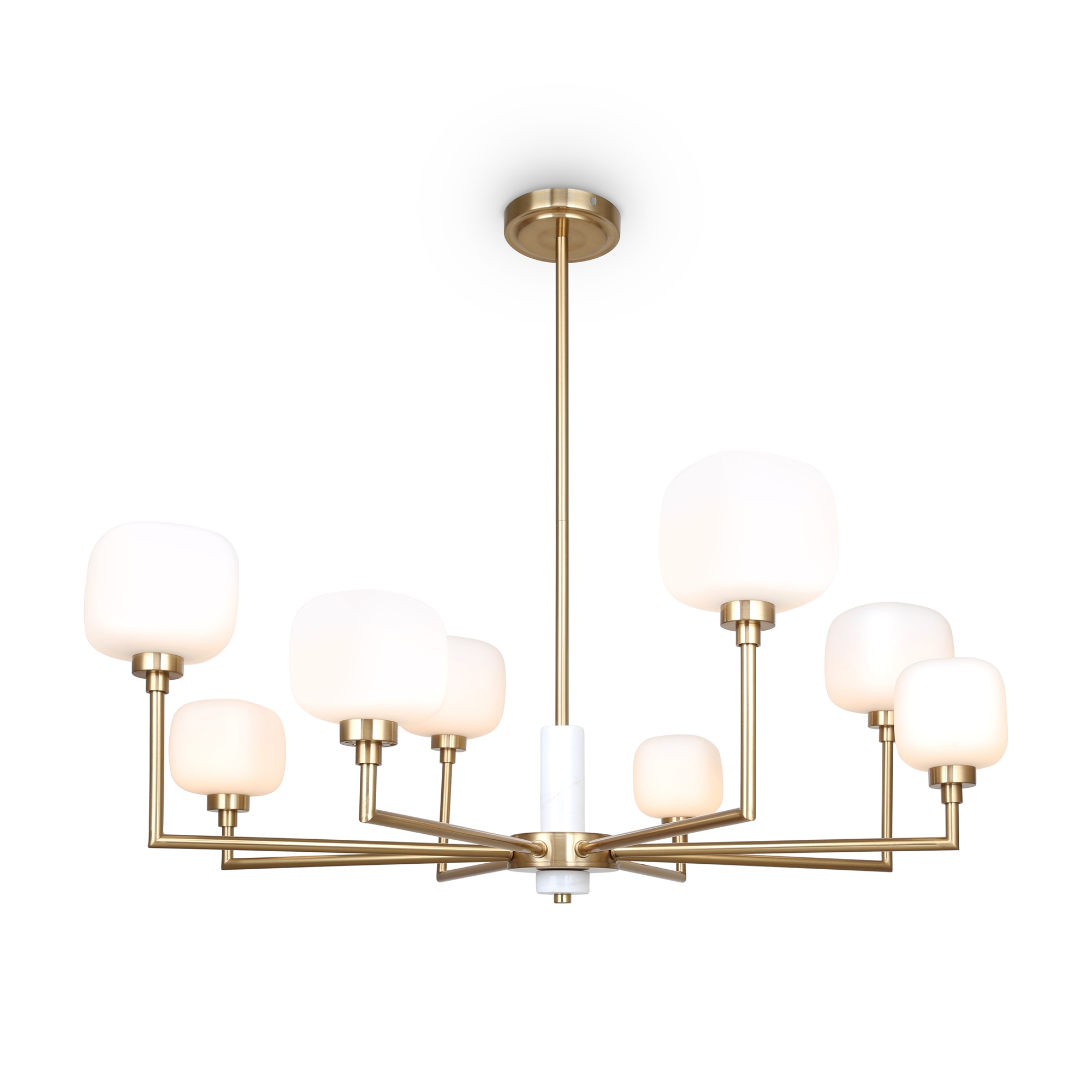 Запросить индивидуальное предложениеМеталлическая графичная арматура цвета латунь. Плафоны из белого матового стекла в необычной форме округлых кубов - закреплены на разной по высоте комбинации. Мягкое равномерное освещение. Источником света служит лампа с цоколем G9.