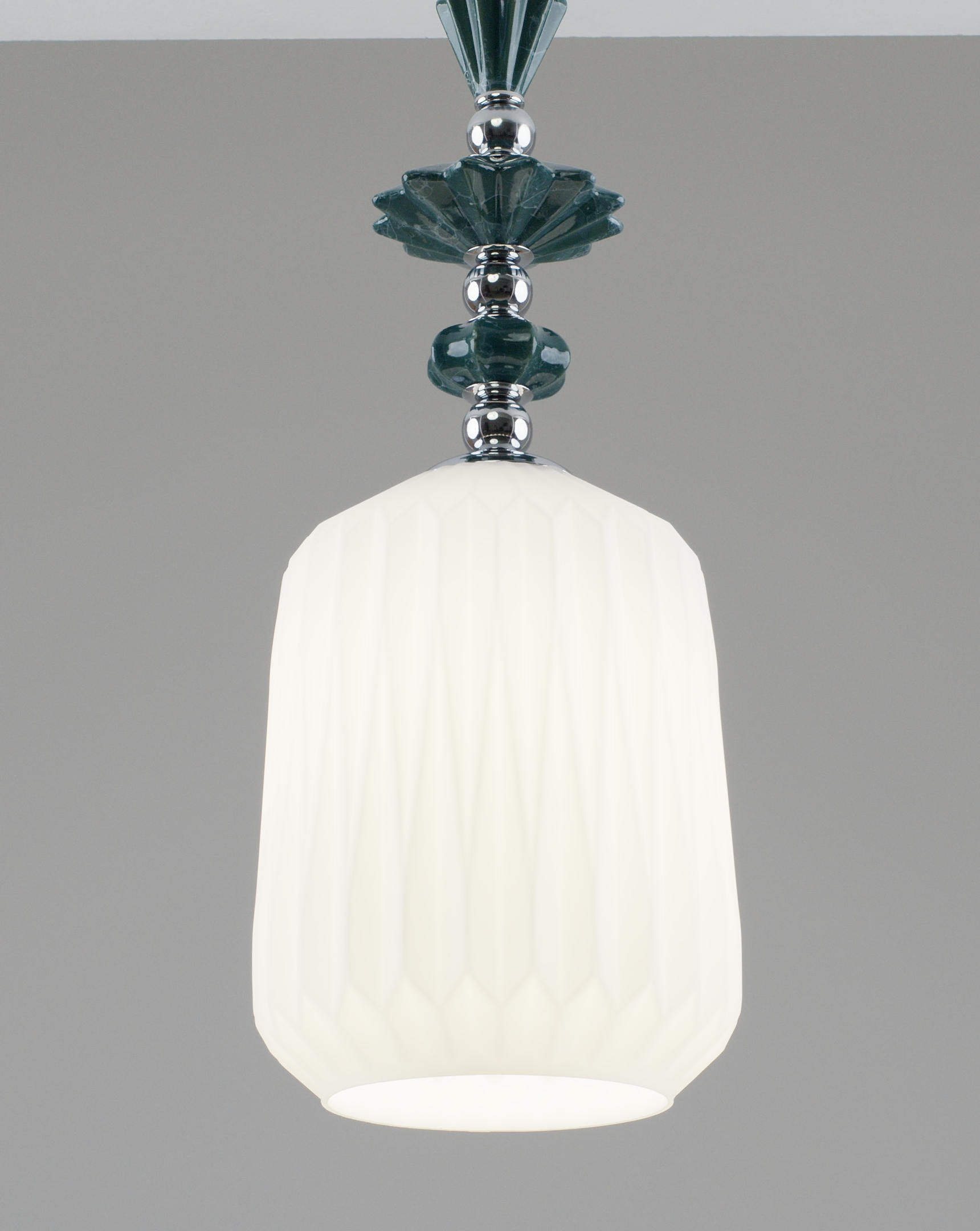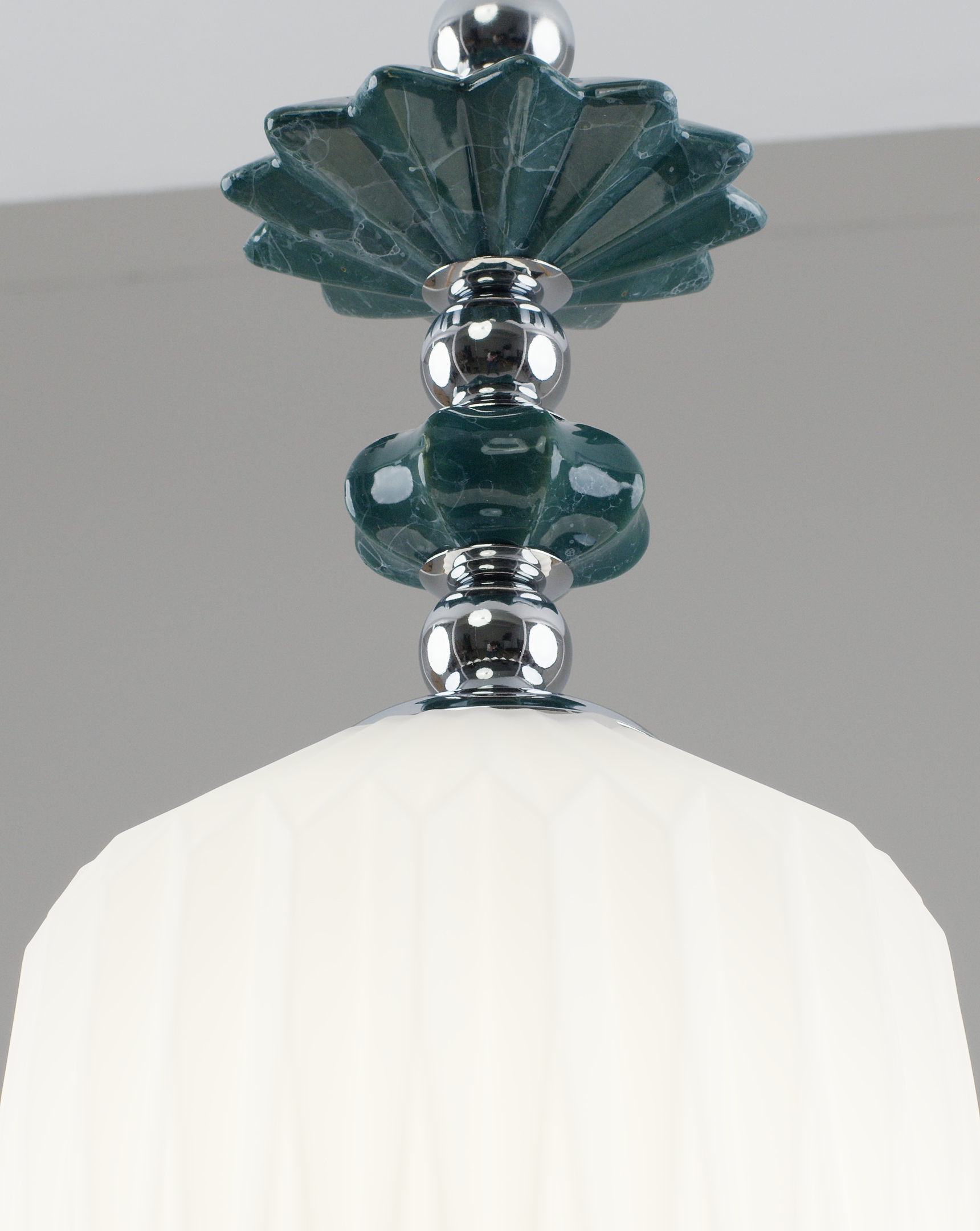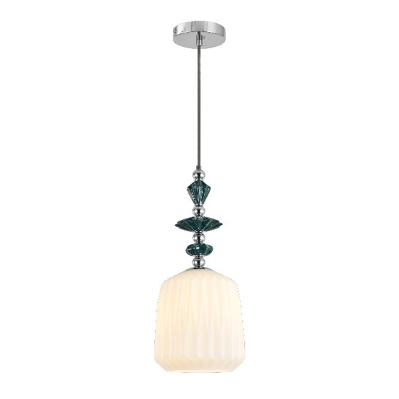 Светильник сочетает утонченность и восточный стиль. Плафон выполнен из матового белого стекла с геометрическими гранями, который хорошо пропускает свет и мягко рассеивает его. Каркас изготовлен из хромированного металла, а изящные декоративные элементы у основания плафона дополняют светильник, придавая ему особую элегантность и изысканность.