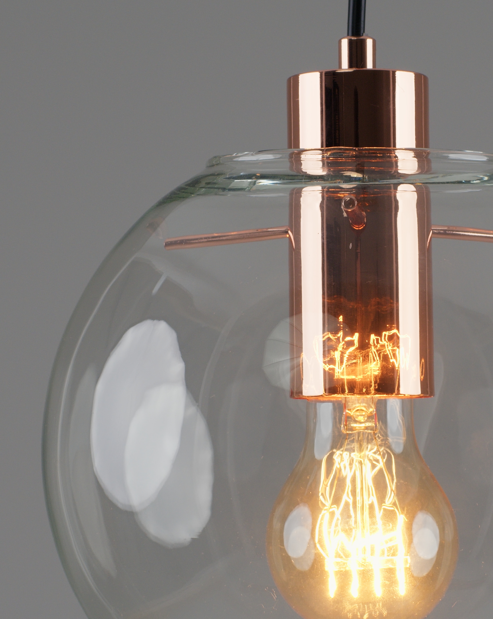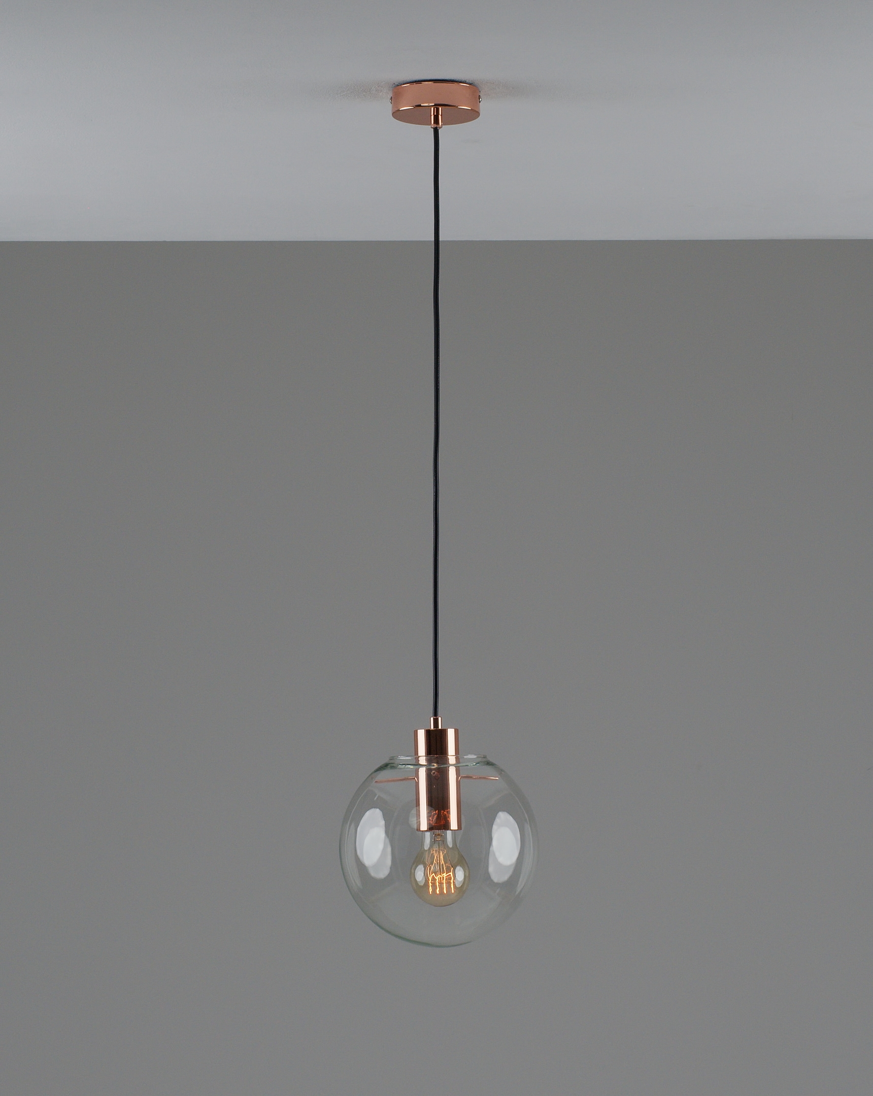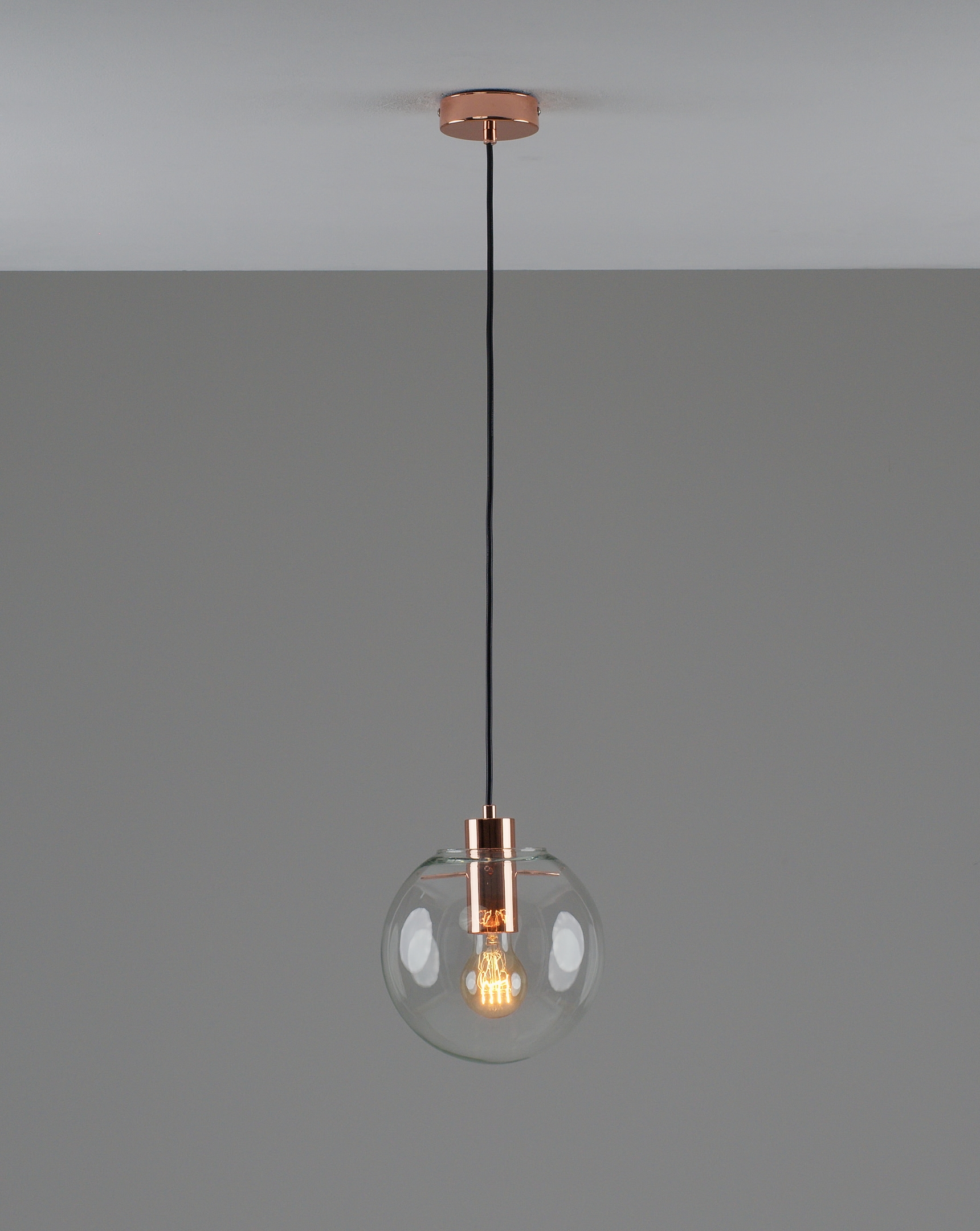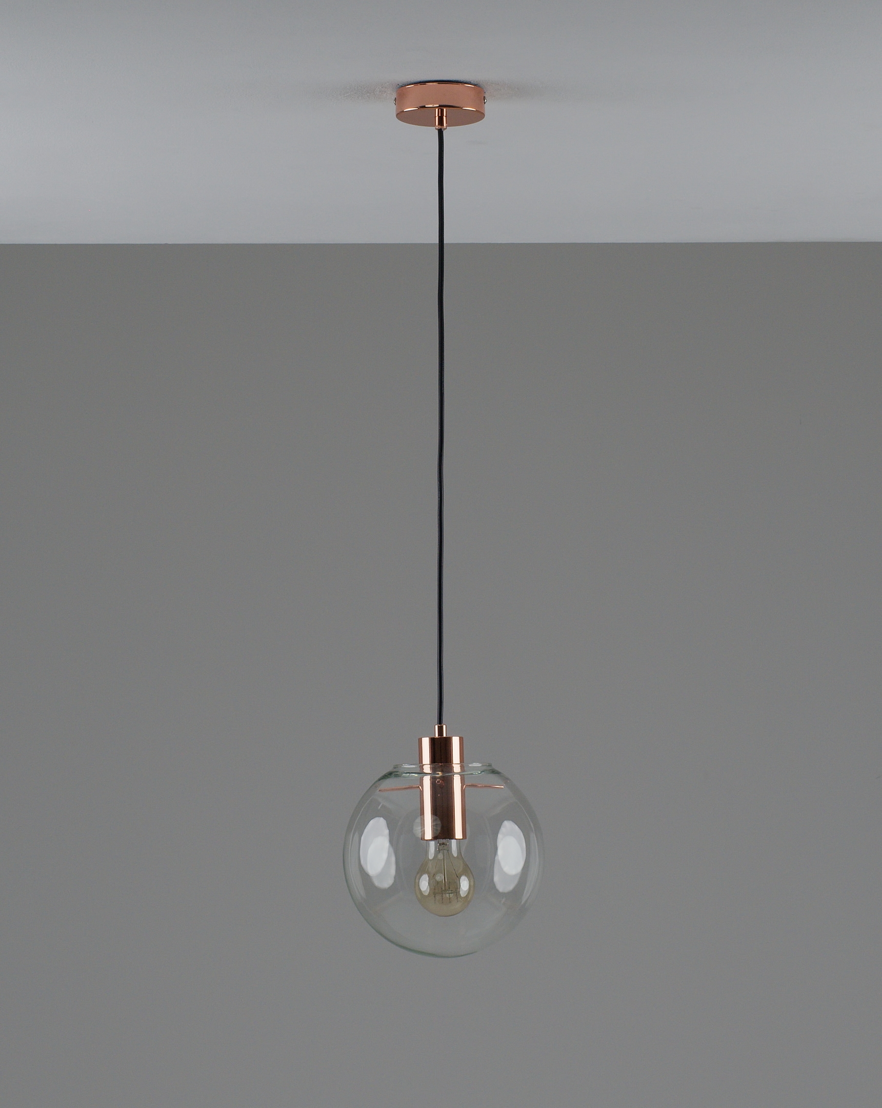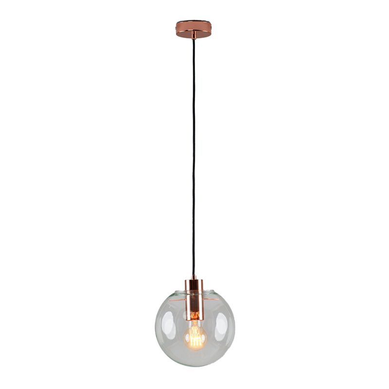 Запросить индивидуальное предложениеПодвесной светильник в современном стиле с плафоном из прозрачного стекла и арматурой цвета розового золота. Диаметр стеклянного плафона 20 см, в качестве источника света могут быть использованы лампы накаливания или LED с цоколем Е27.