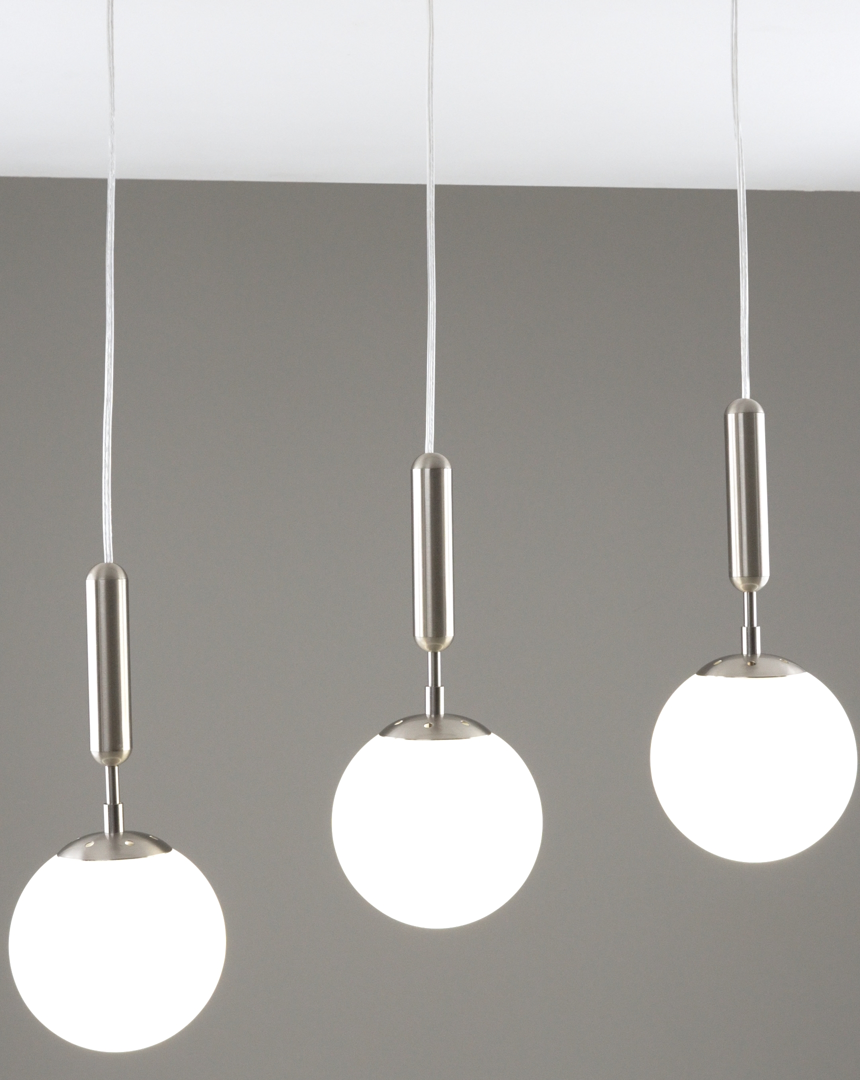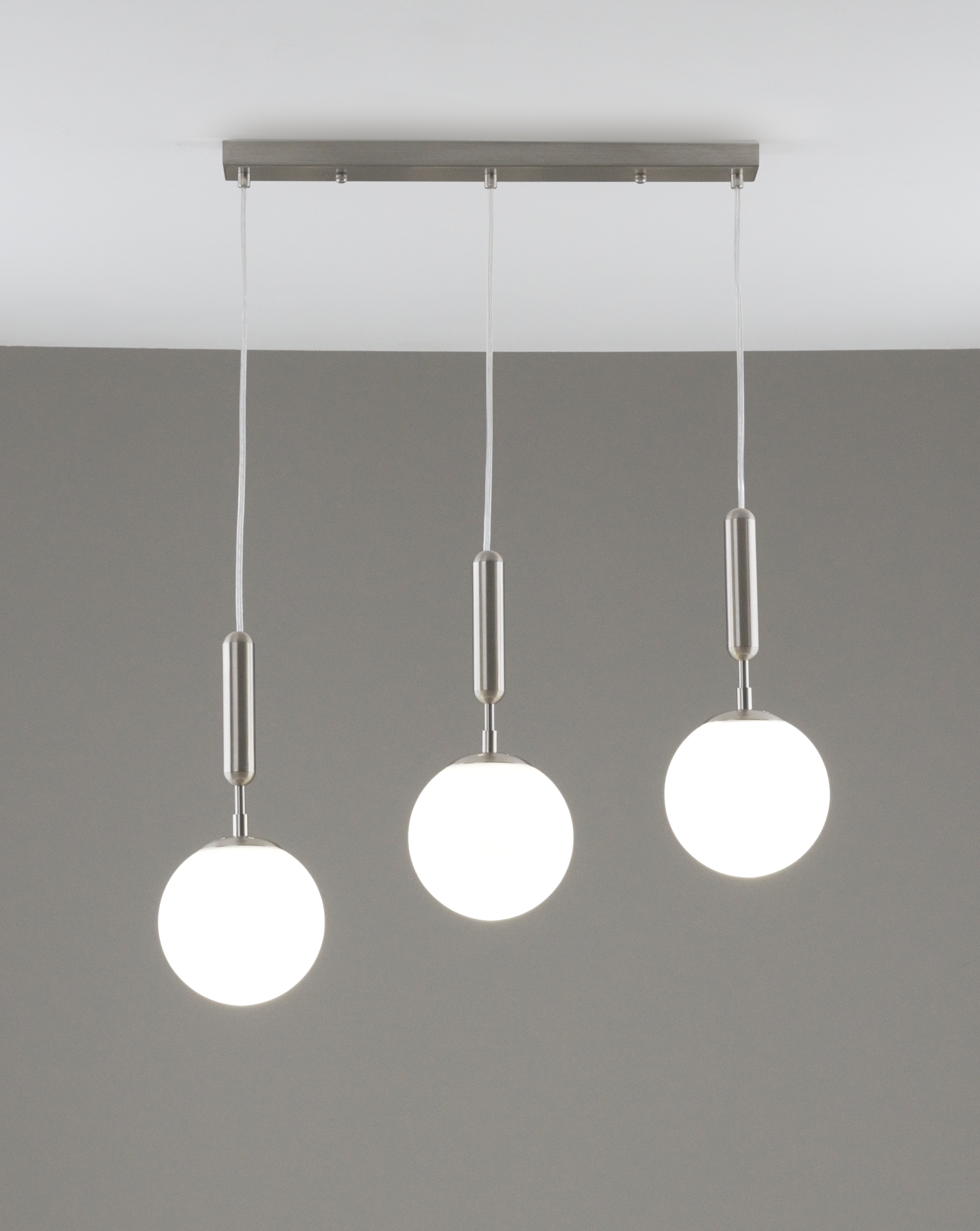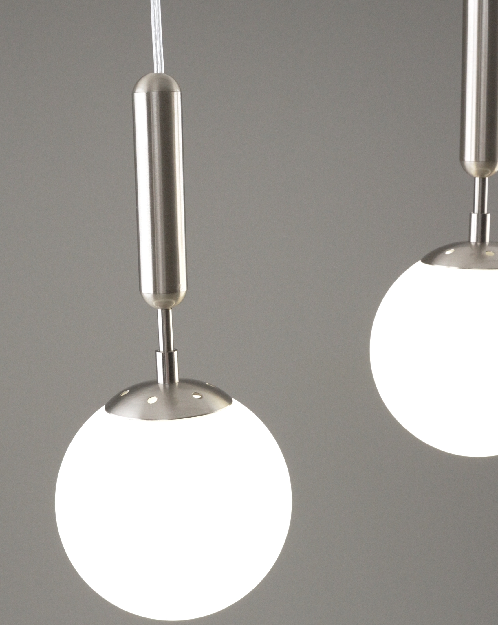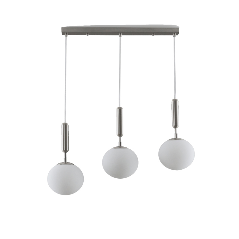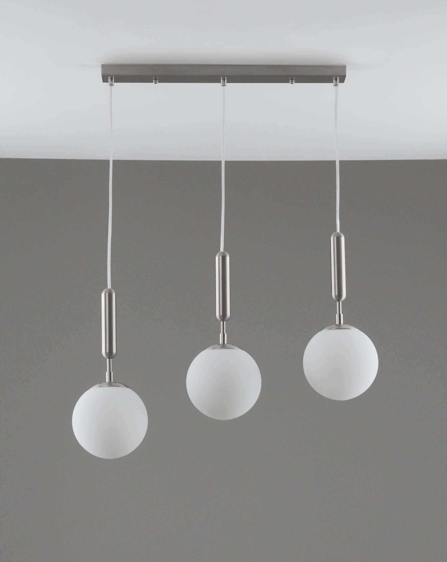 Запросить индивидуальное предложениеПодвесной светильник из коллекции Scrumbel. Металлический каркас цвета хром гармонично сочетается с матовыми плафонами в форме шара. Высота светильника 120 см., отличное решение для высоких потолков. Площадь освещения составляет 9 м². Данная модель сможет дополнить любой современный интерьер дома и подойдёт для освещения спальни, кухни, холла или гостиной комнаты. При монтаже светильника, плафоны можно отрегулировать по высоте.