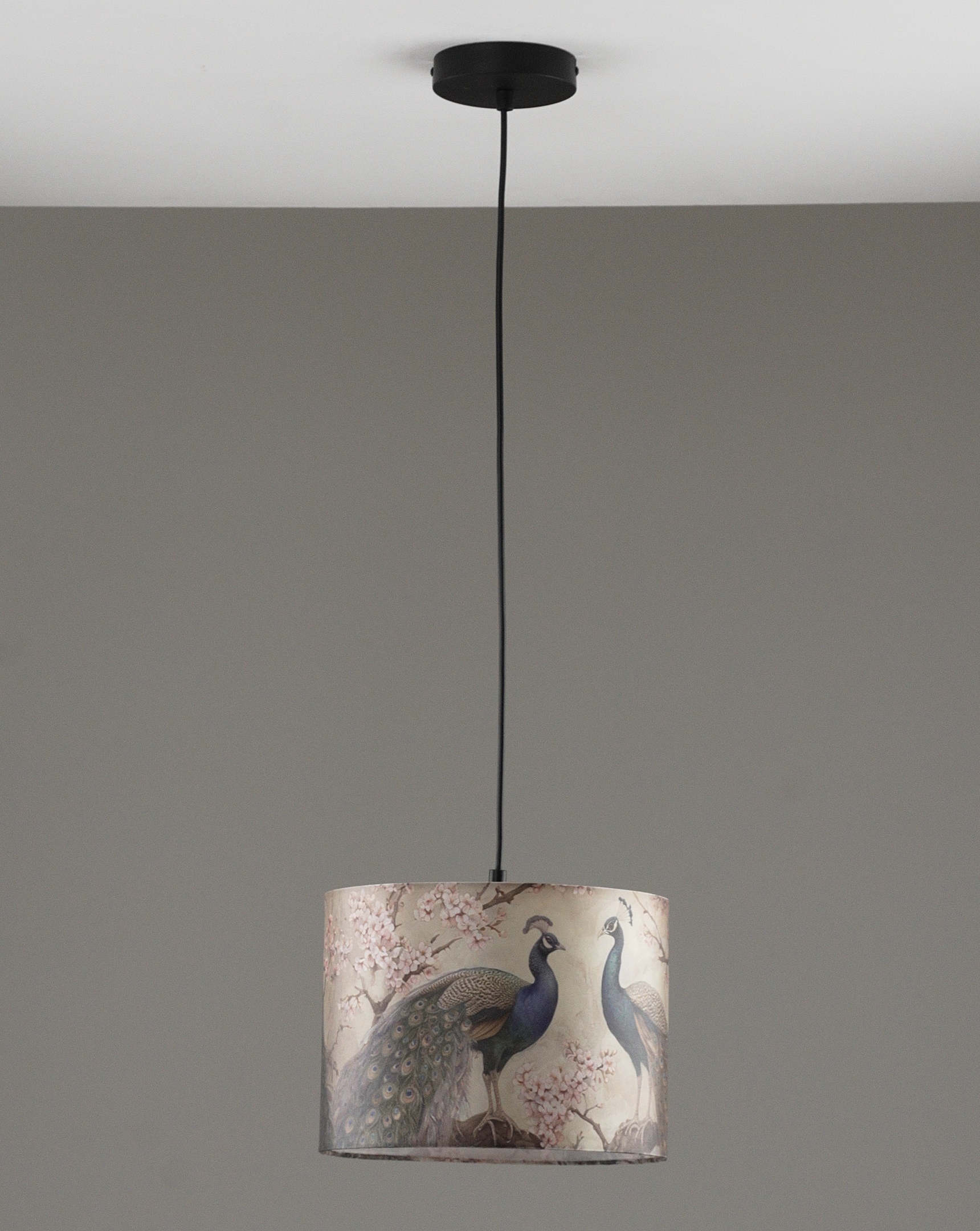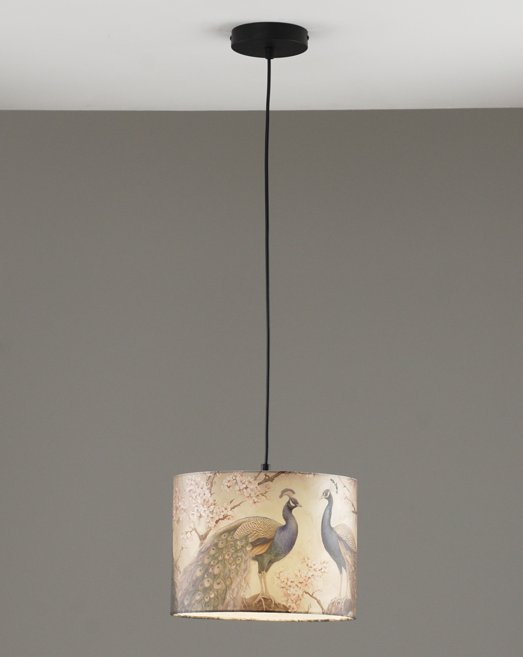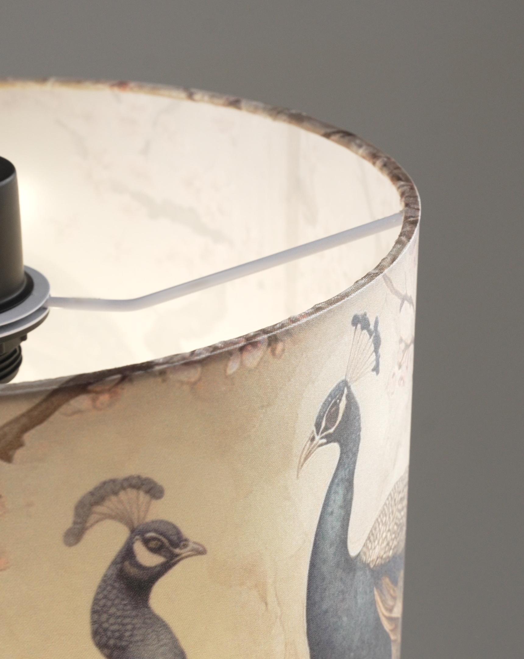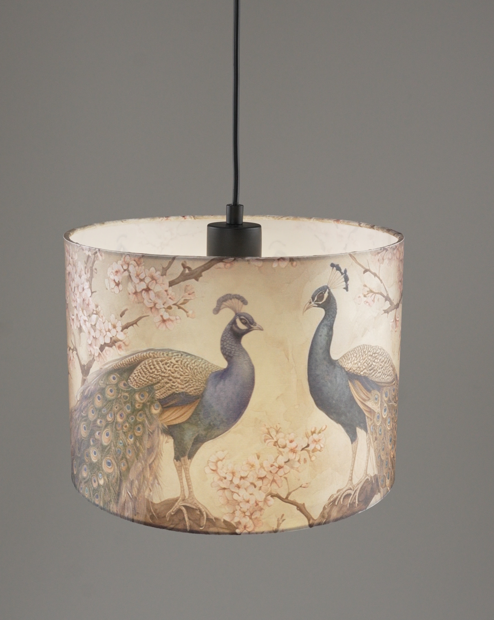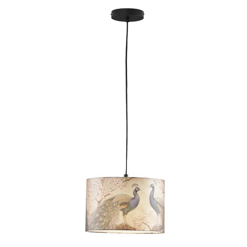 Светильник из коллекции Strauss от итальянского бренда Moderli мгновенно притягивает взгляд благодаря эксклюзивному принту с изображением павлинов на фоне нежных ветвей сакуры. Цилиндрический абажур выполнен из плотной ткани приятного бежевого оттенка, что при включении создает мягкий рассеянный свет и уютную атмосферу в помещении.