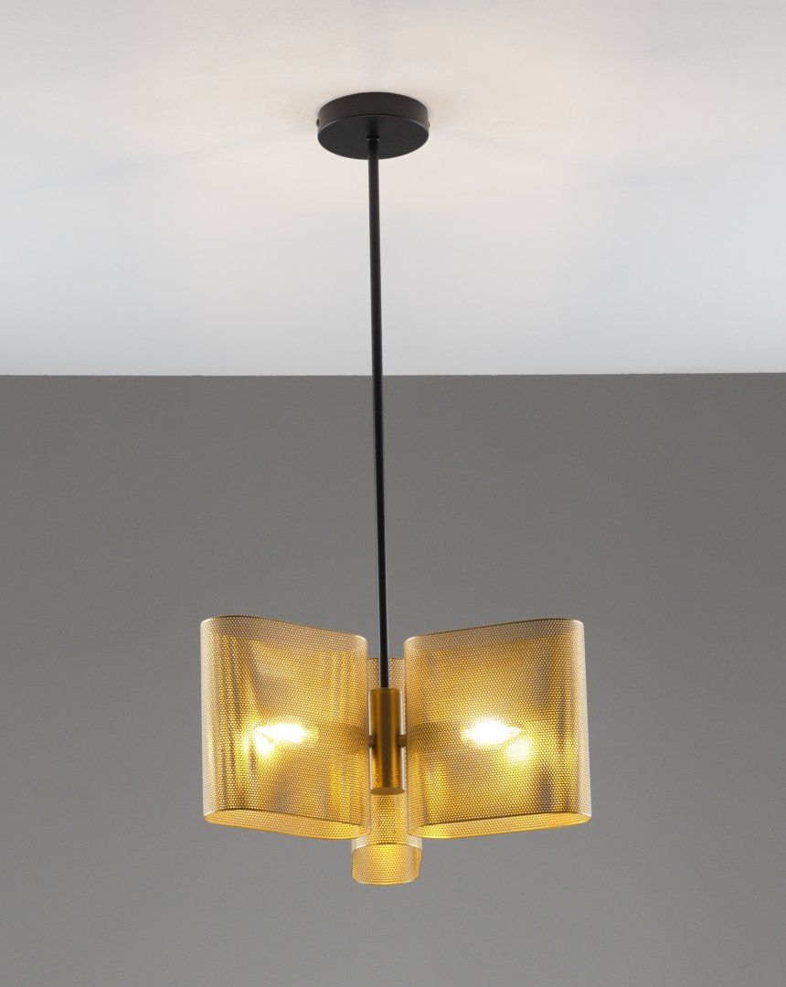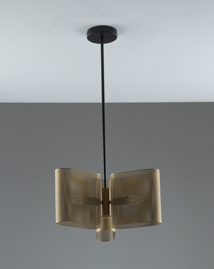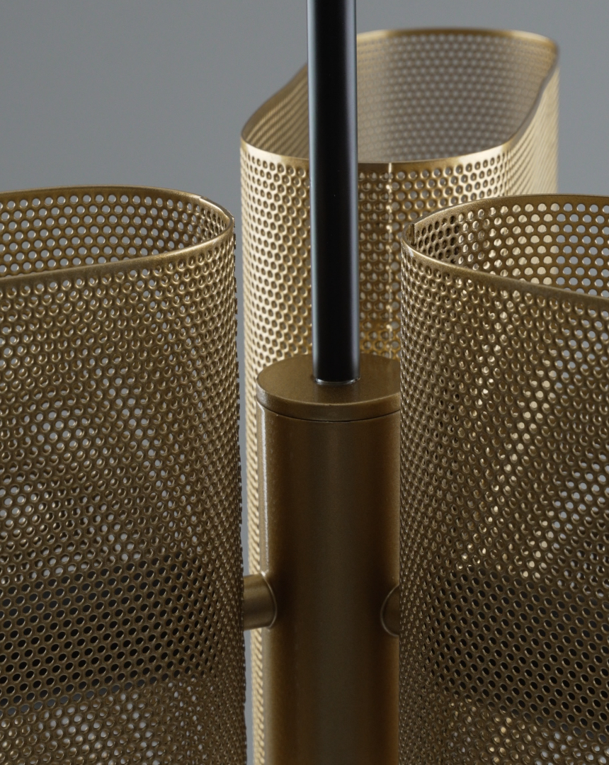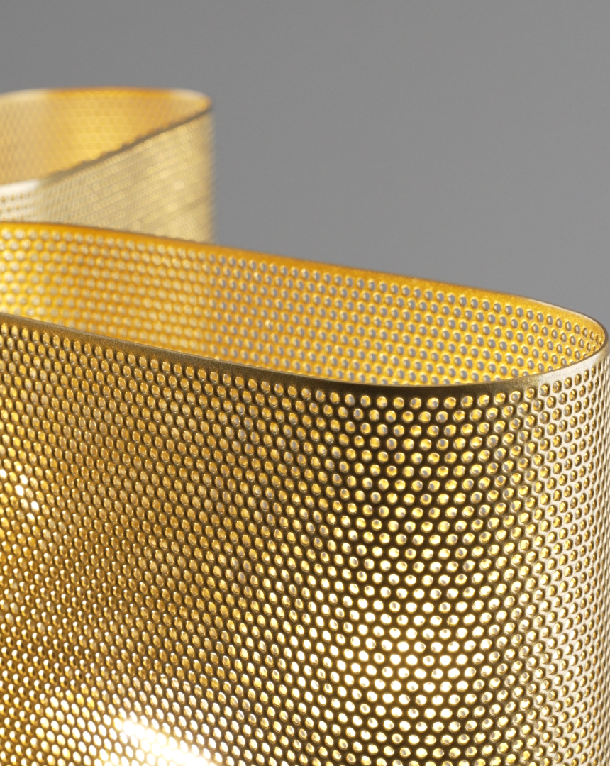 Корпус и плафоны выполнены из качественного металла с матовым покрытием в актуальном золотистом оттенке. Прочная конструкция гарантирует долговечность, а перфорированный дизайн делает свет мягким и рассеянным, создавая уютную атмосферу.