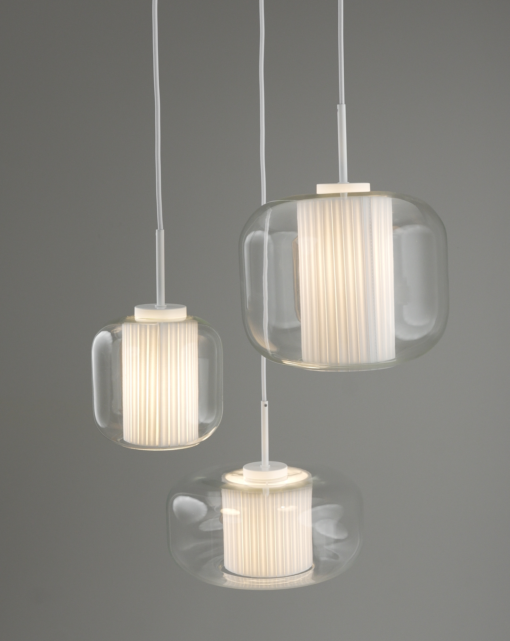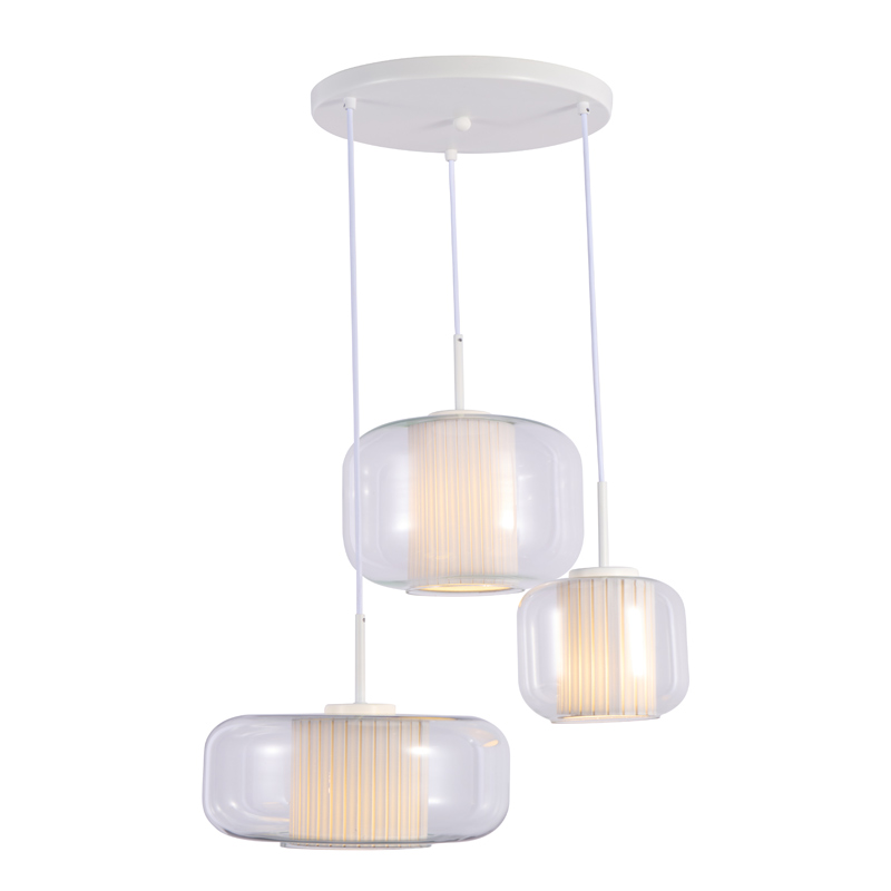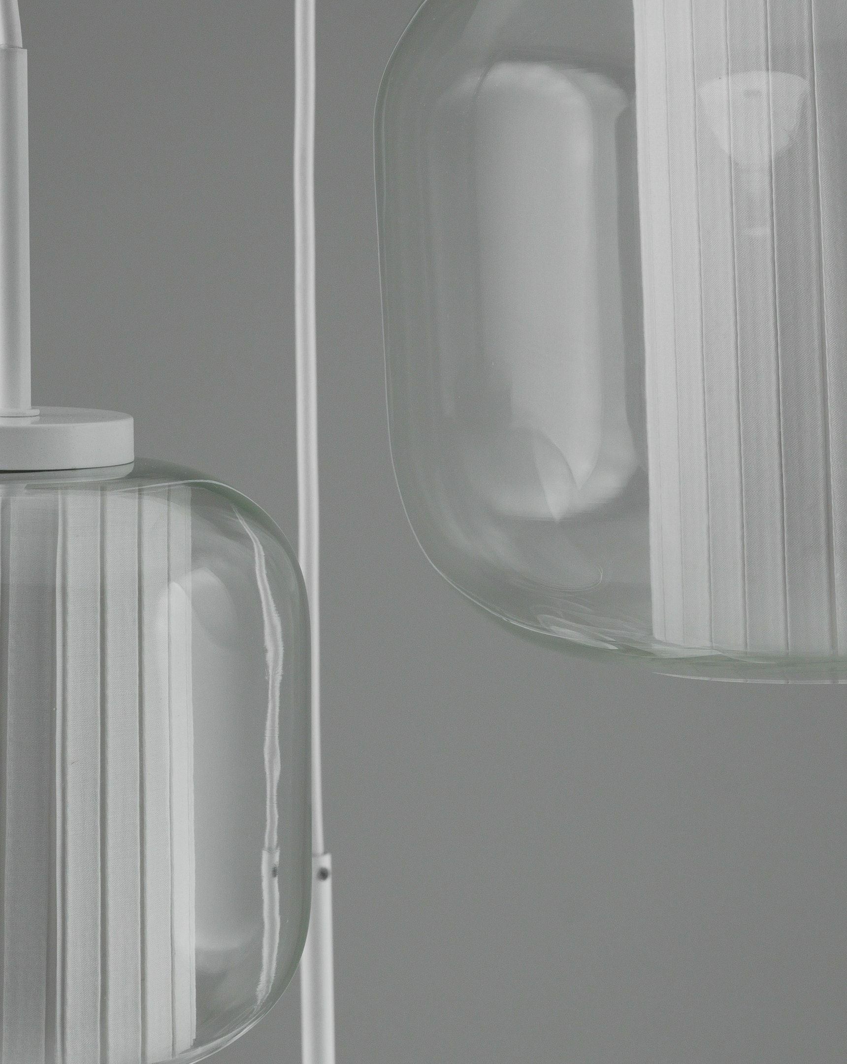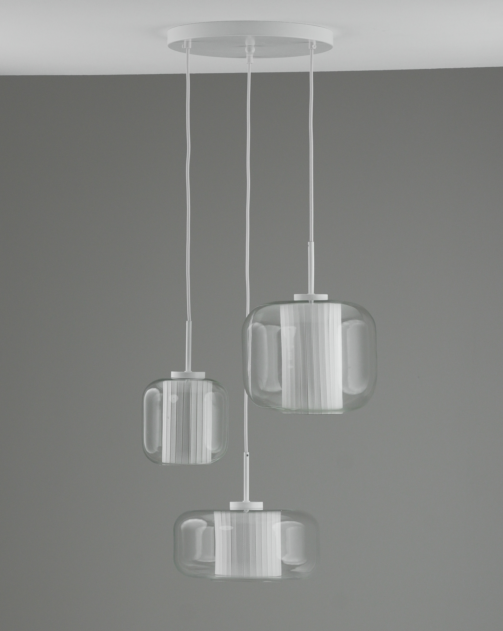 Светильник из коллекции Ember гармонично сочетает прозрачное стекло, мягкий текстиль и белоснежную арматуру. Три овальных плафона разной формы создают интересную композицию, которая придает интерьеру легкость и стиль. Внутри каждого стеклянного плафона — текстильный рассеиватель, обеспечивающий теплое, мягкое свечение.