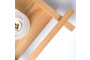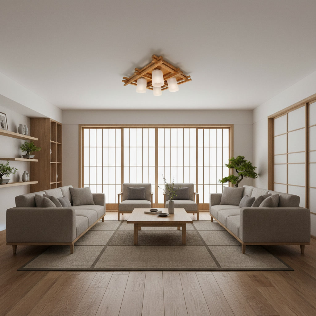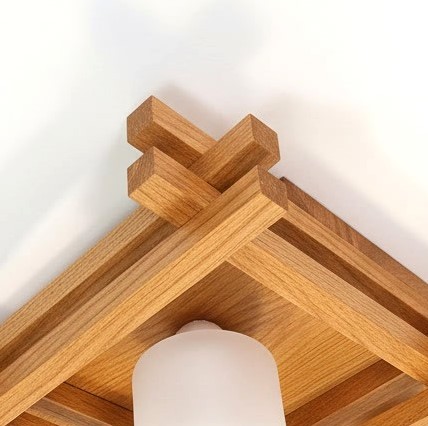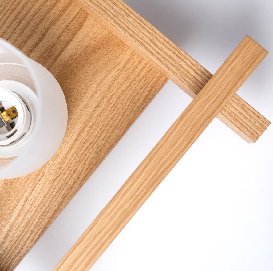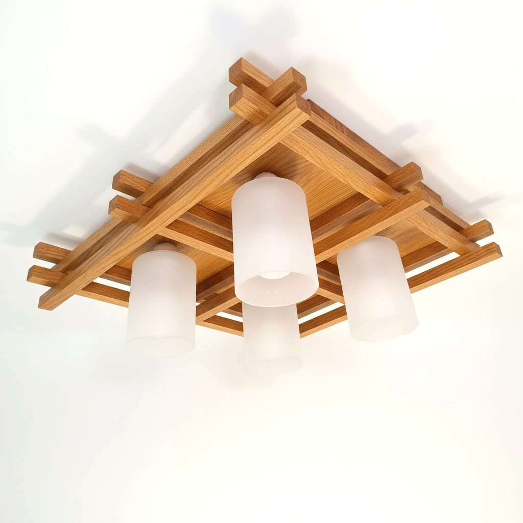 Четыре плафона обеспечивают равномерный световой поток, а матовое стекло делает освещение мягким и ненавязчивым. Деревянная рамочная конструкция из дубовых брусков создаёт выразительный ритм и подчёркивает архитектурную строгость формы.