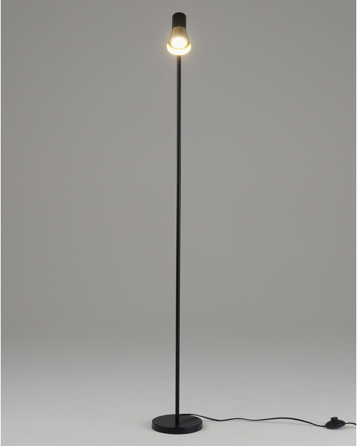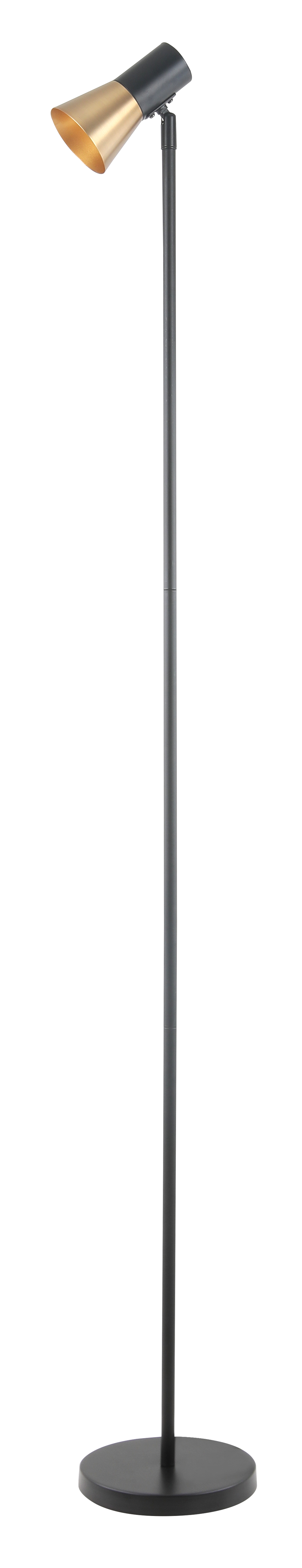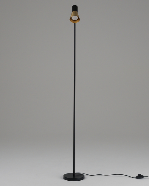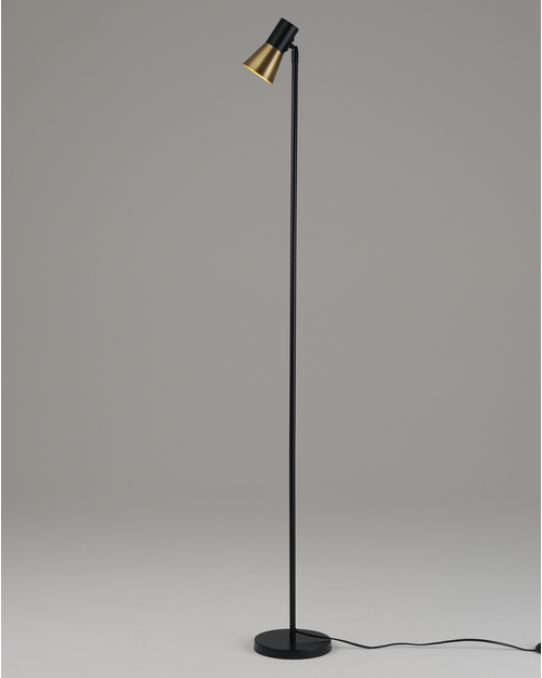 Торшер Melro выполнен из прочного металла. Корпус окрашен в черный цвет, а плафон украшен вставками из латуни с золотистым оттенком, что придает модели современный и утонченный вид. Лаконичная форма и минималистичный дизайн делают этот торшер идеальным акцентом в любом интерьере — от классического до современного.