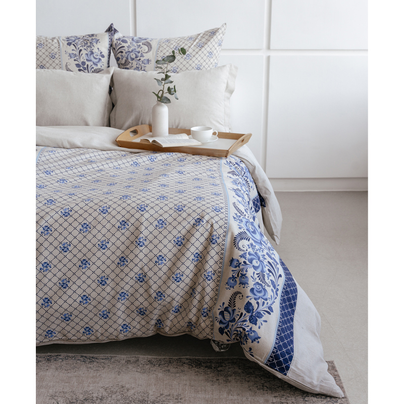 Комплект постельного белья Лен Евро Гжель с Простыней на резинке