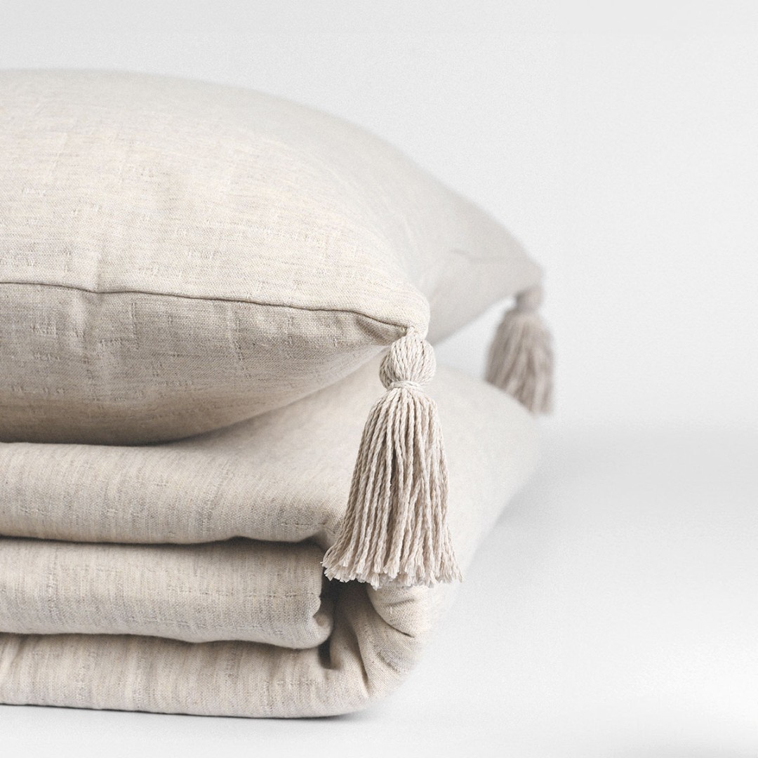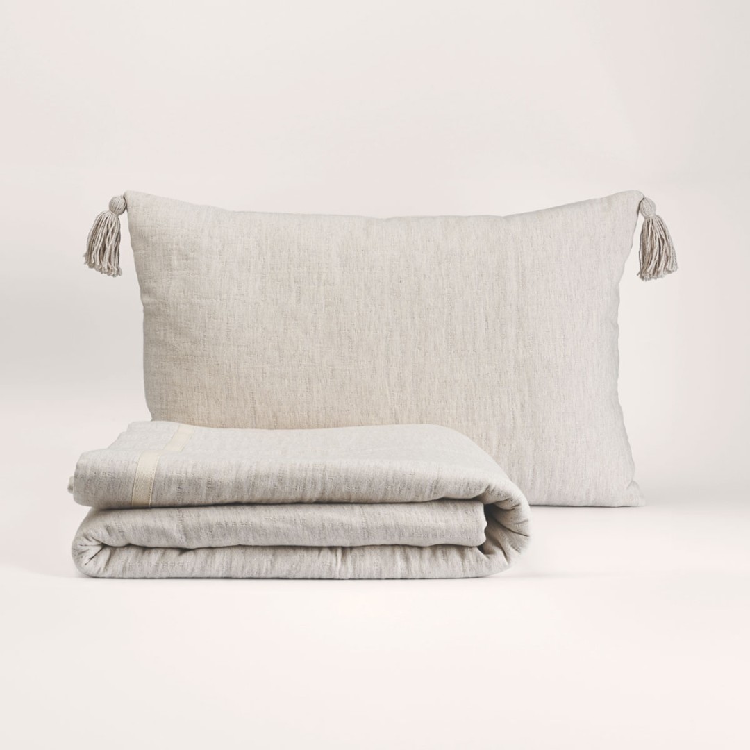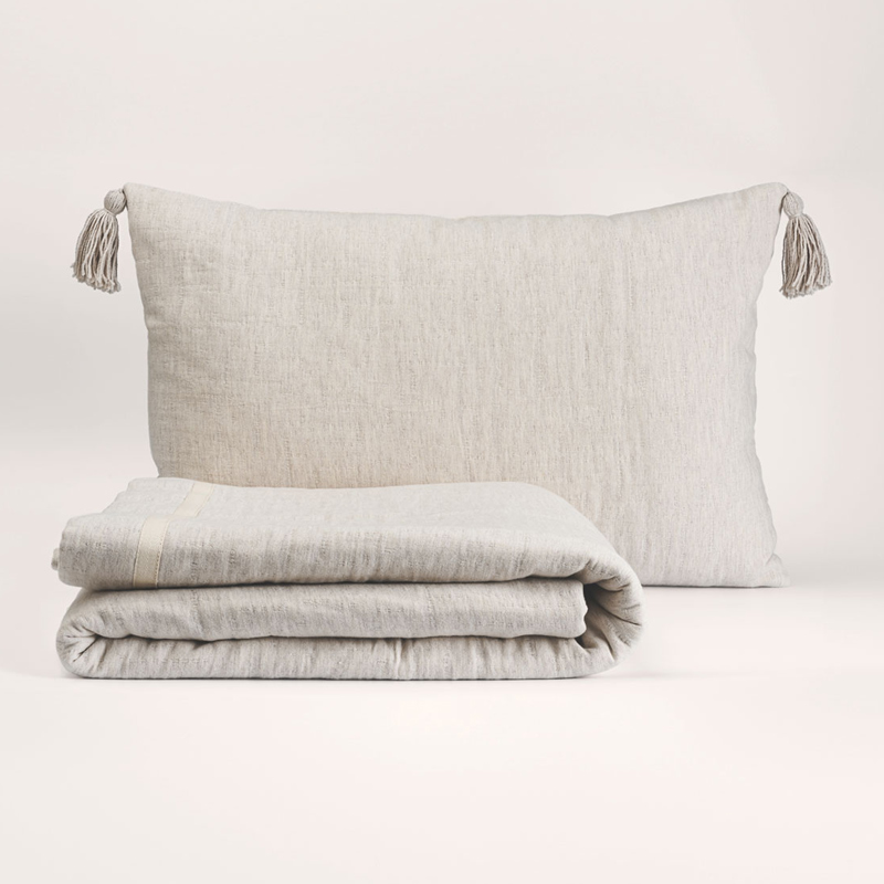 Запросить индивидуальное предложениеКомплект текстильный для дома изготовлен из 100% хлопка, плотность 370 г/кв.м.высшего качества от нашего испанского завода производителя натуральных тканей. Комплект состоит из двустороннего легкого покрывала 220*240 с наволочками 50*70 см ( 2шт) цвет светло-бежевый, отделка из хлопковой ленты придает элегантный вид, наволочки декорированы кистями ручной работы, изготовленными из 100% хлопка.