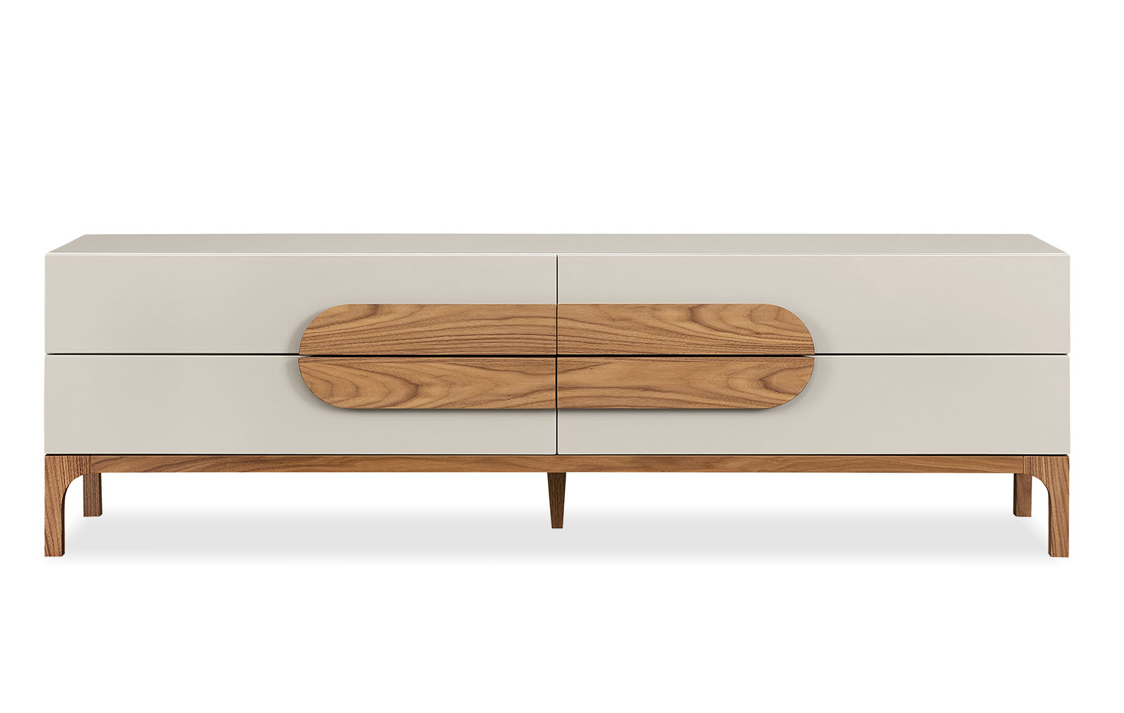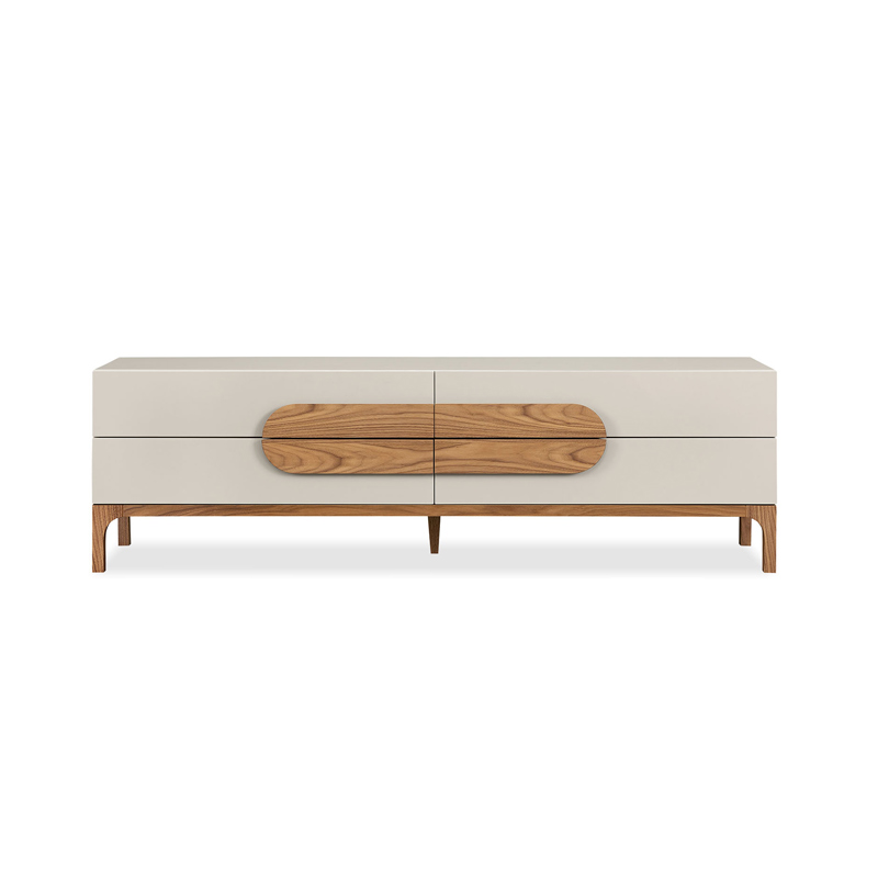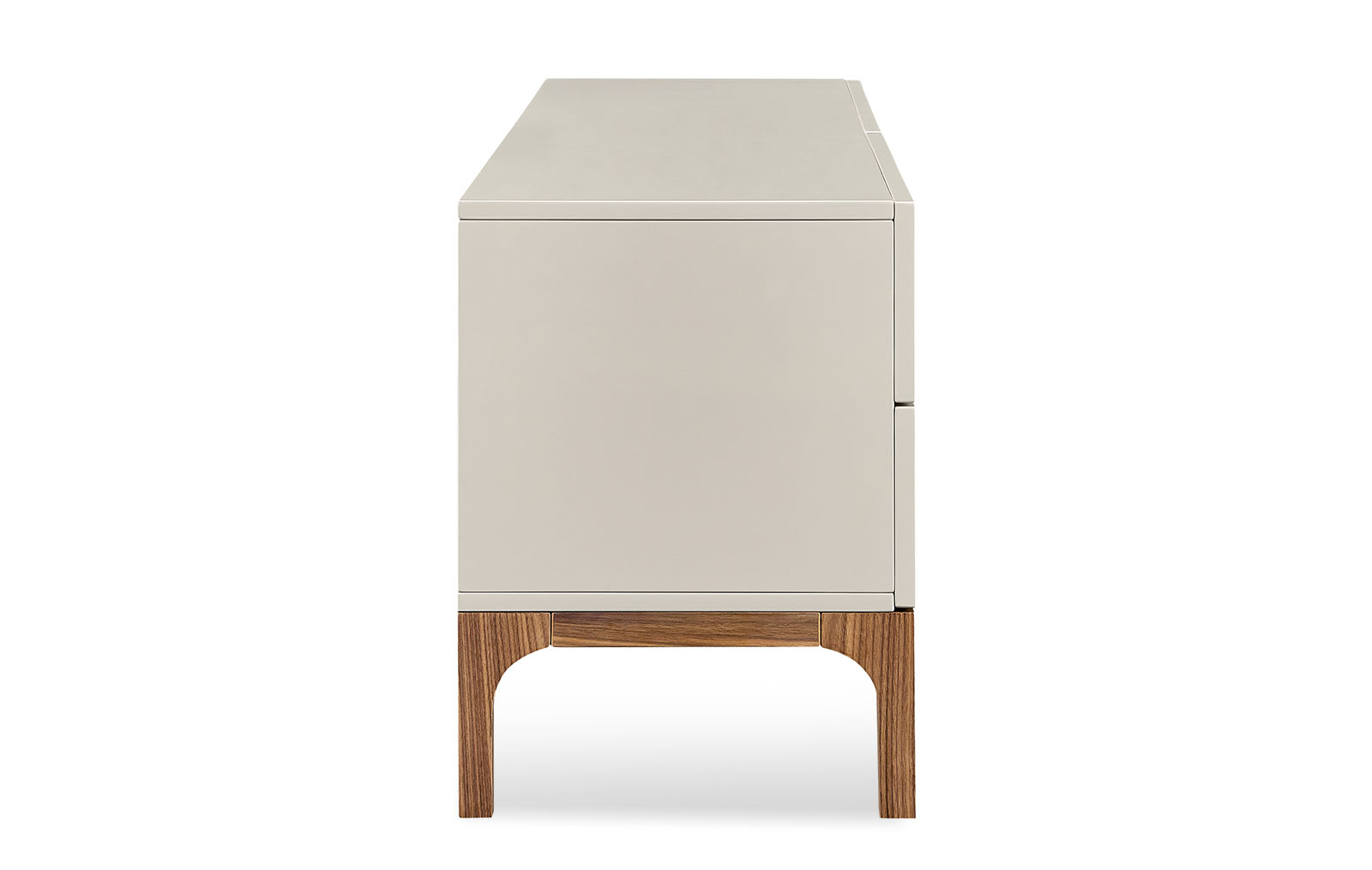 Тумба под телевизор Eloisa (Элоиза) благородного оттенка слоновой кости отлично подойдет для любой комнаты и будет гармонично смотреться в большинстве современных стилей интерьера. Сделана она из МДФ в глянцевом лаке, декорирована шпоном ореха.
