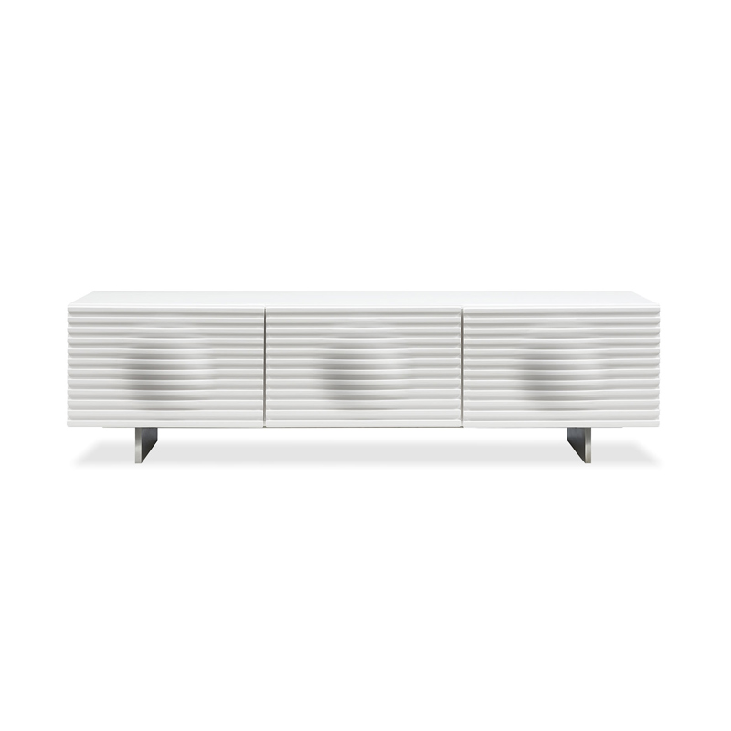 Изготовлена тумба из МДФ, покрытого глянцевым белым лаком, внутренняя отделка из меламина, а ножки из нержавеющей стали.