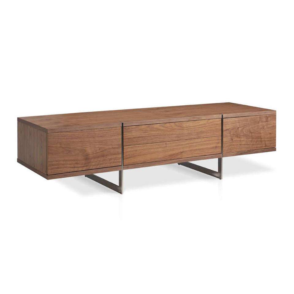 Запросить индивидуальное предложениеТумба под ТВ LE312 от фабрики Angel Cerda — необычная конструкция для европейских интерьеров. Тумба впечатляет своей непростой и оригинальной сборкой. Рамочные ножки буквально «разрезают» изделие на три части, но при этом, не проходят сквозь столешницу. Такая дизайнерская задумка выглядит не только необычно, но и обеспечивает равномерное распределение нагрузки. Модель создана для небанального европейского интерьера, где преобладает мебель из дерева. Тумба ТВ LE312 имеет форму вытянутого прямоугольника. Конструкция представляет собой каркас, в котором находится четыре ящика, из двух рамочных опор. Ящики, находящиеся в центральной секции, выдвижные. Они оснащены доводчиками и прочными металлическими направляющими. Материал изготовления — МДФ и шпон орехового дерева. Эта порода обладает красивым природным орнаментом, который нашел широкое распространение в современных интерьерах. Опоры визуально делят изделие на три одинаковых сектора, обеспечивая хорошую устойчивость. Они сделаны из хромированной стали, благодаря чему изделие способно ежедневно выдерживать высокую весовую нагрузку. Цвета отделки указываются в соответствии с каталогом производителя. Допускается незначительное отклонение в цвете, обусловленное техническими особенностями цветопередачи фотографий Изделие поставляется в собранном виде.