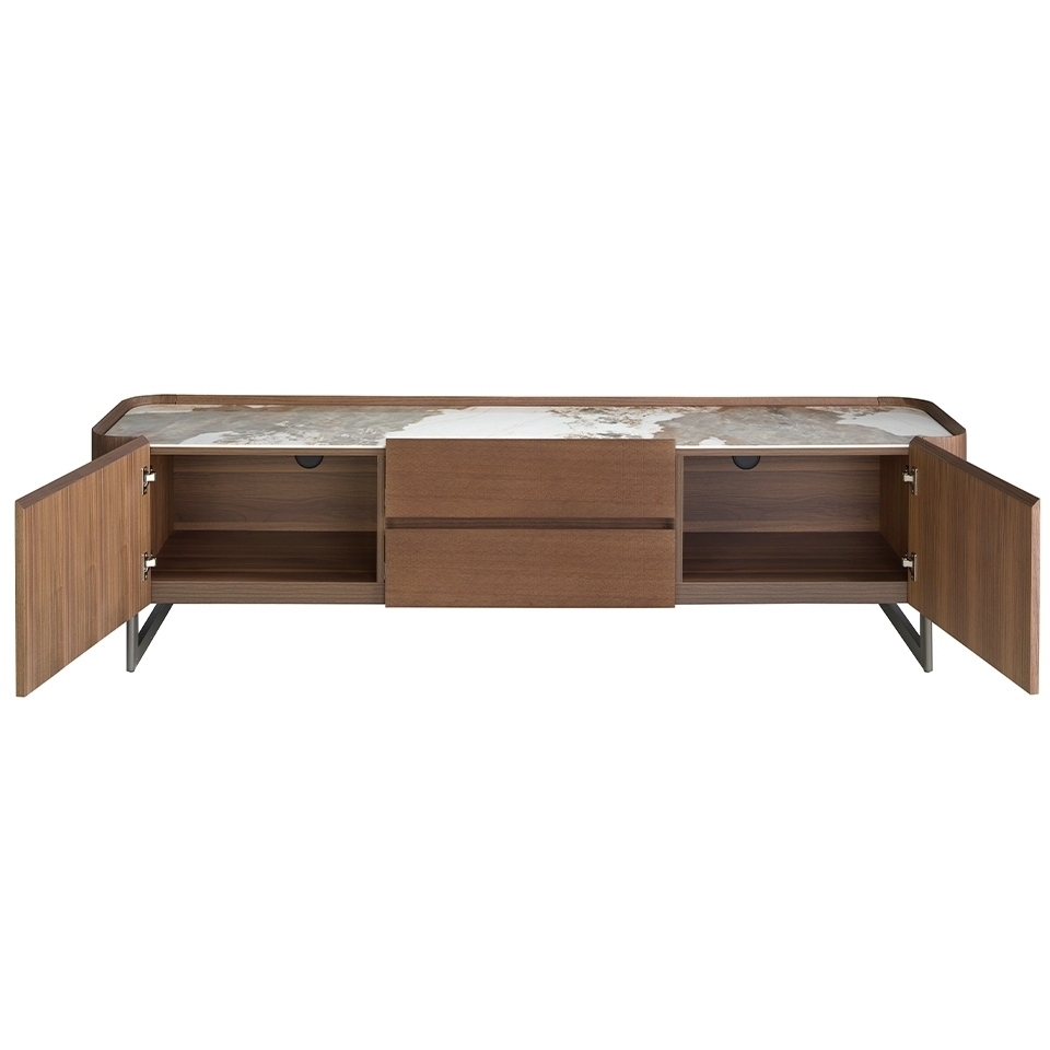 Запросить индивидуальное предложениеПодставка под телевизор современного дизайна с конструкцией из натурального шпона ореха и оригинальными ножками из нержавеющей стали темного цвета. Благодаря элегантной столешнице из белого керамогранита с серыми и коричневыми прожилками и глянцевой отделкой вы получите изысканный вид, который вы ищете для своих комнат. Он имеет большое пространство для хранения с 2 ящиками с системой плавного закрывания и 2 дверцами с системой открывания на петлях и системой плавного закрывания. Цвета отделки указываются в соответствии с каталогом производителя. Допускается незначительное отклонение в цвете, обусловленное техническими особенностями цветопередачи фотографий.