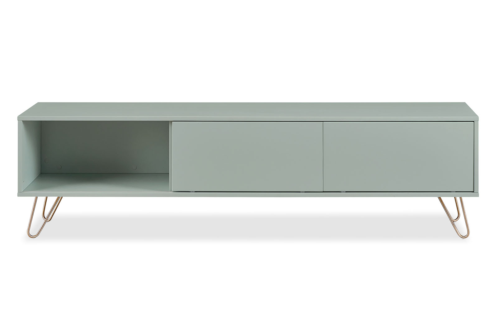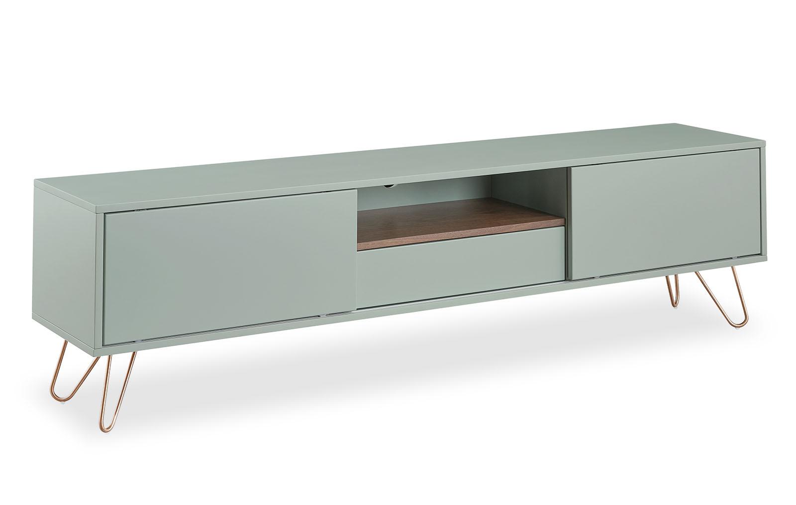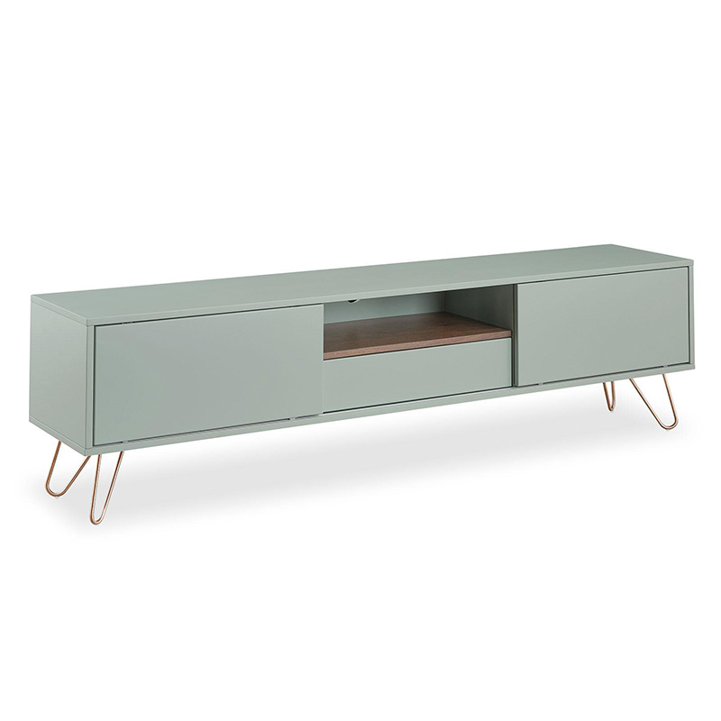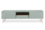 Запросить индивидуальное предложениеТумба под телевизор Tilda (Тильда) светло-серого оттенка отлично подойдет для любой комнаты и будет гармонично смотреться в большинстве современных стилей интерьера. Сделана она из МДФ с лаковым покрытием (фасады и корпус). Ножки из нержавеющей стали, окрашенного в золотистый оттенок.