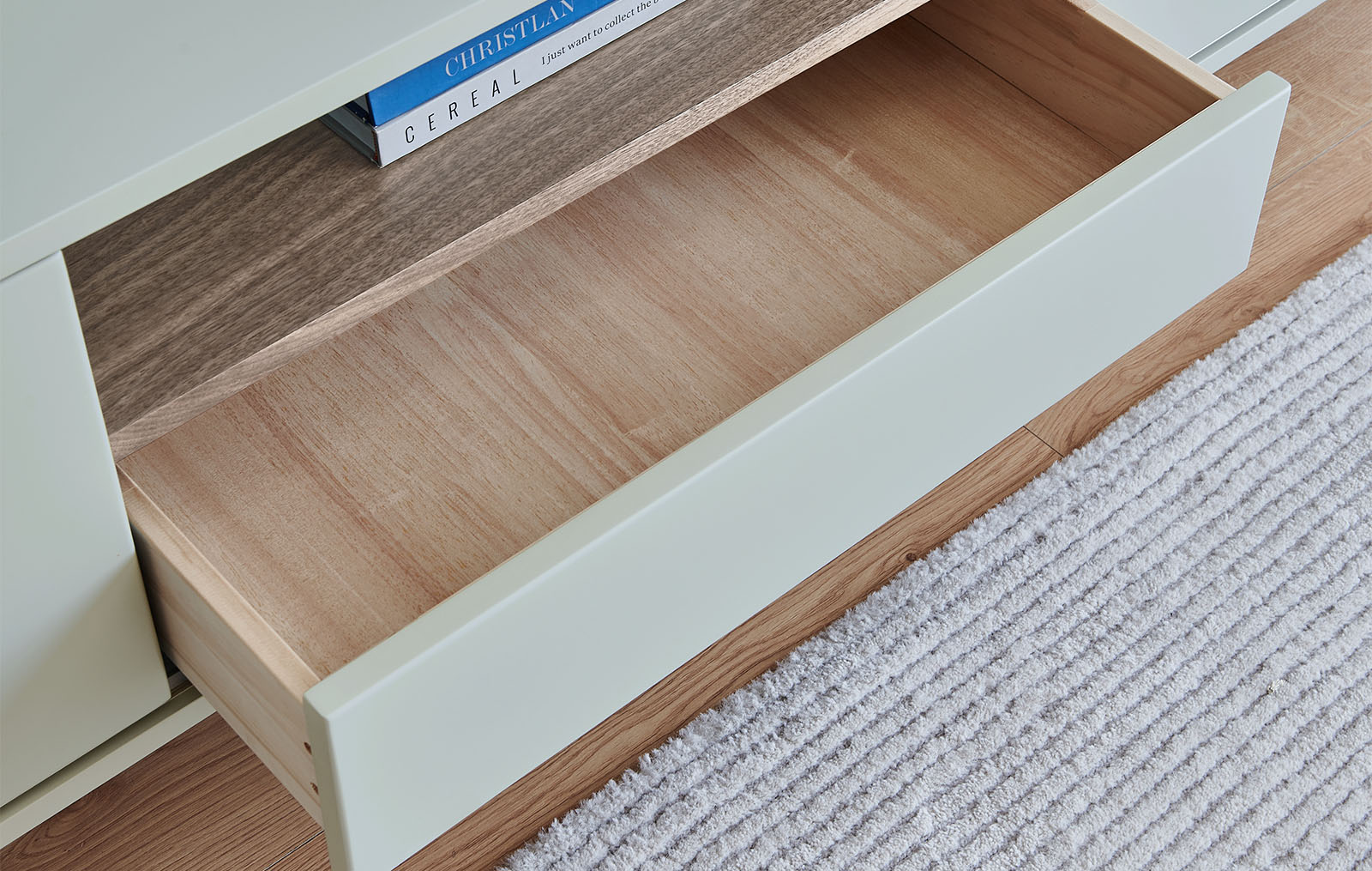 Тумба достаточно вместительна: по бокам два отделения за раздвижными дверцами, в центре открытая ниша-полочка и выдвижной ящик.
