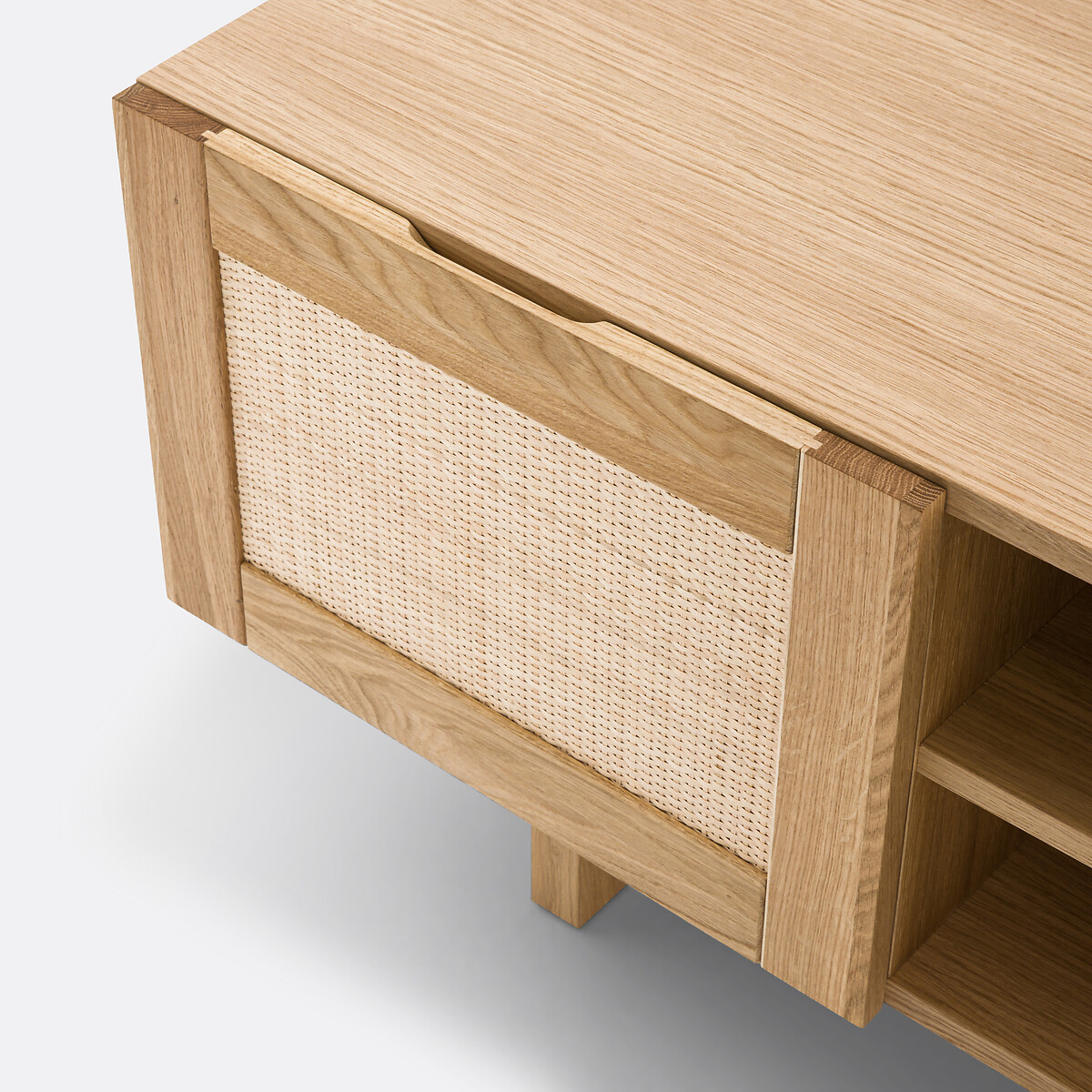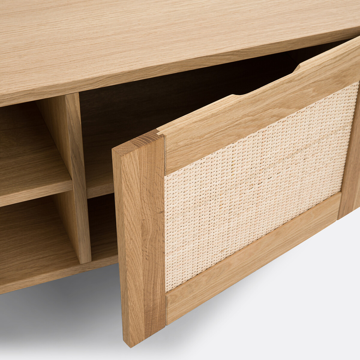 Запросить индивидуальное предложение • Корпус, ножки из ДСП, облицованные дубом, и рама дверец из массива дуба, центральная панель дверец из МДФ, облицованная плетением из натурального тростника, отделка бесцветным полиуретановым лаком
