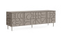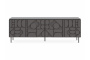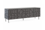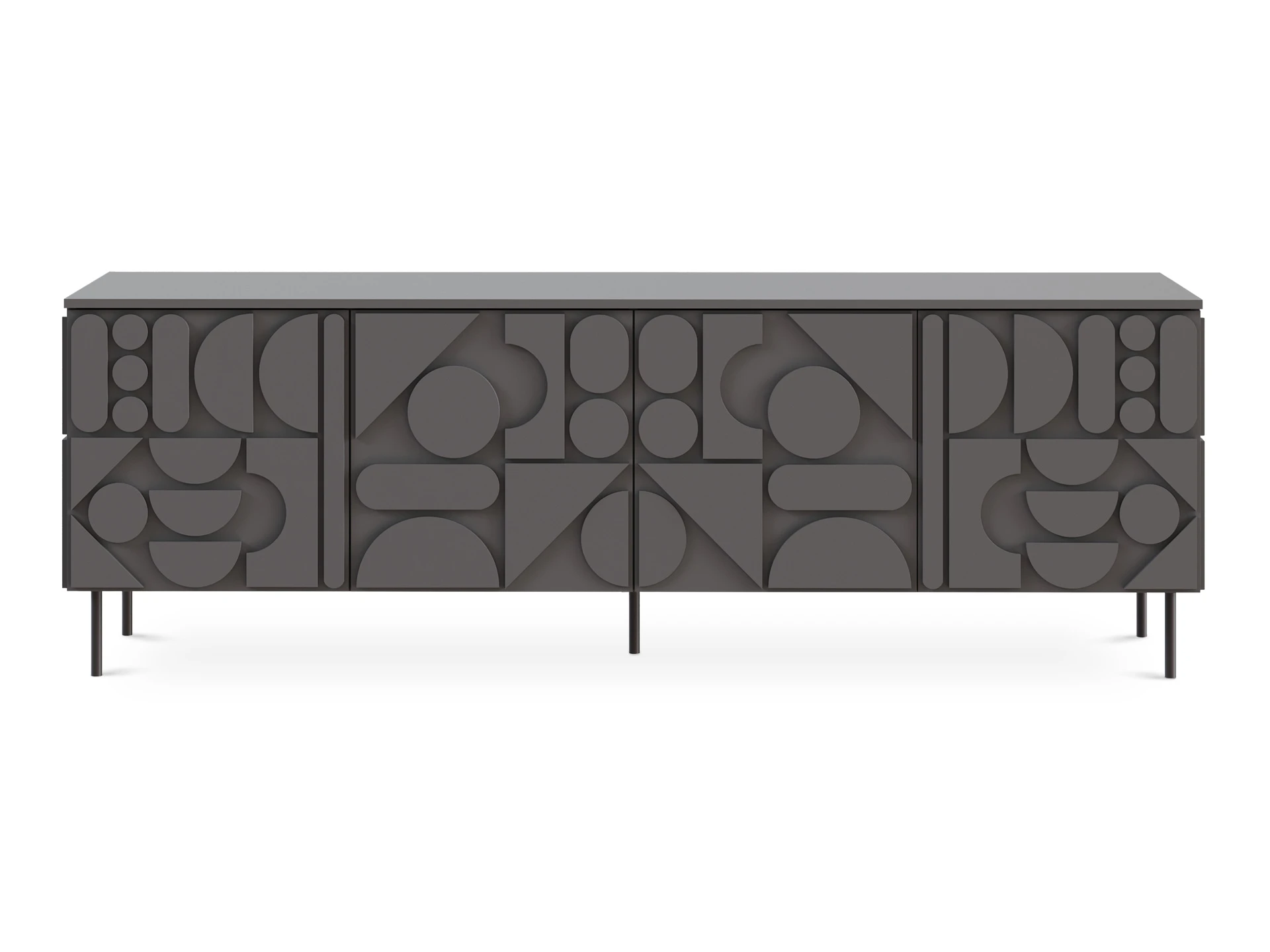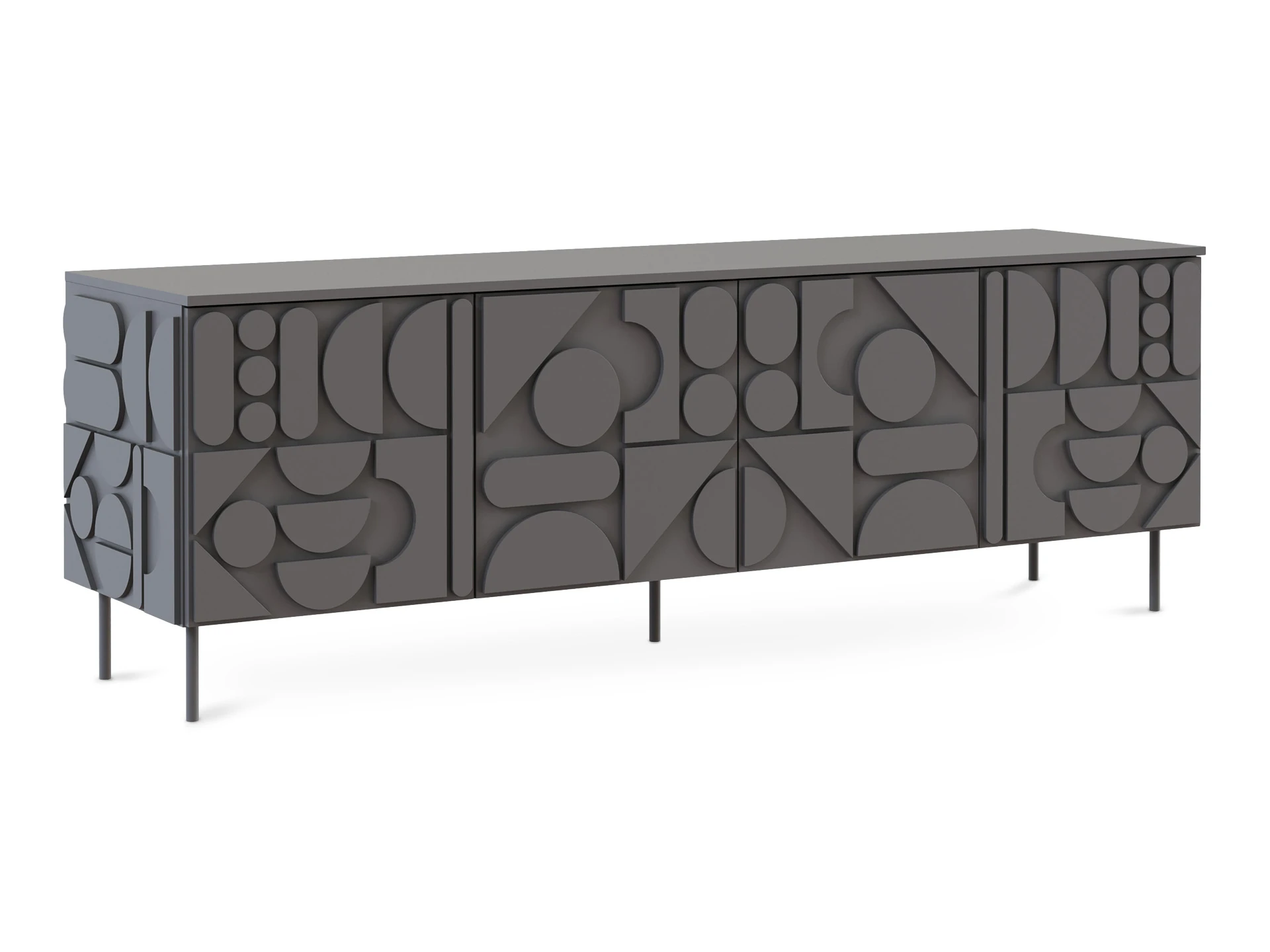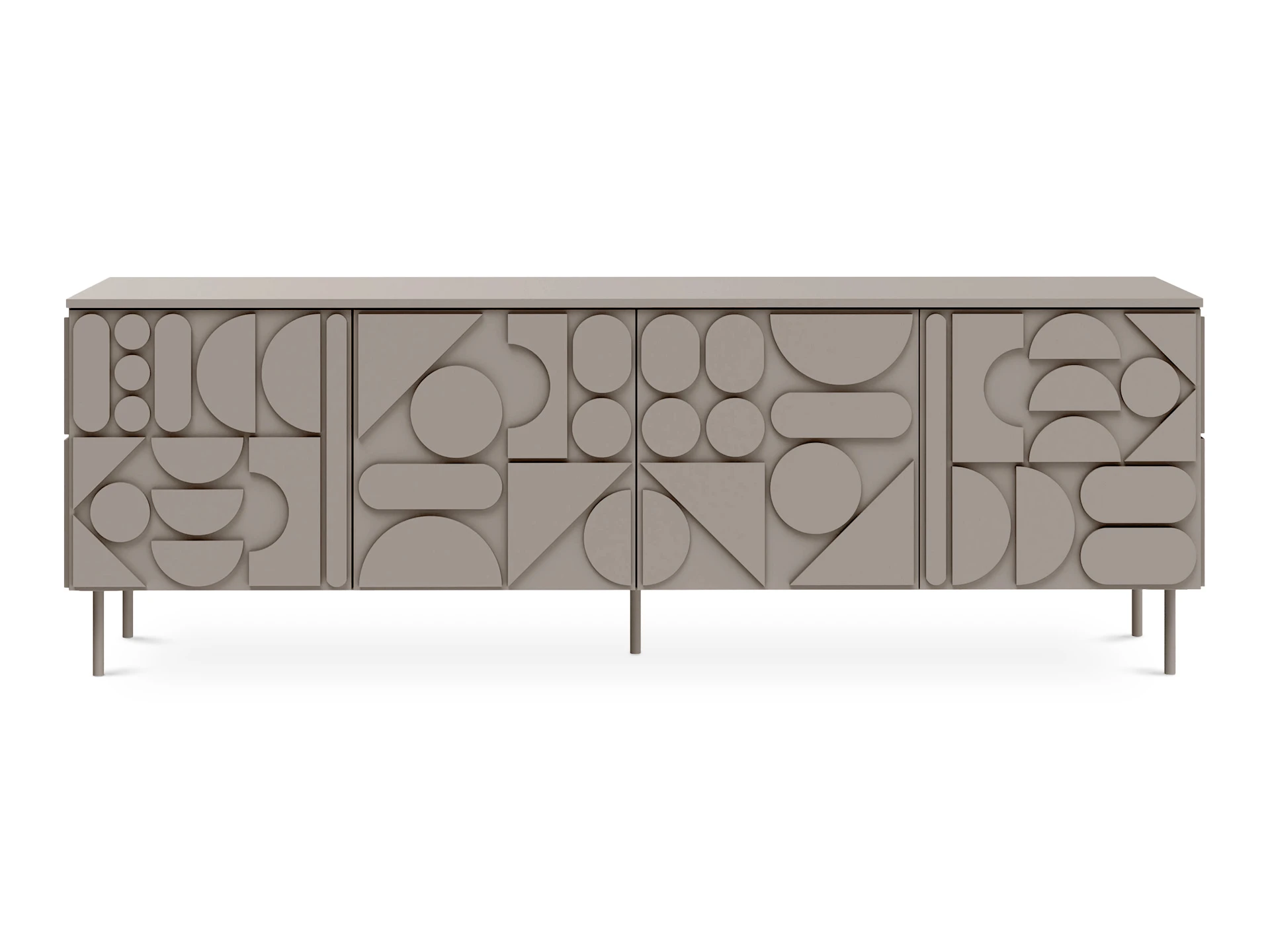 Тумба с четырьмя распашными дверями, расположенными в ряд. За каждой дверью отделение со съёмной полкой. Перестановка полок по высоте не предусмотрена.