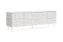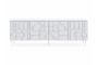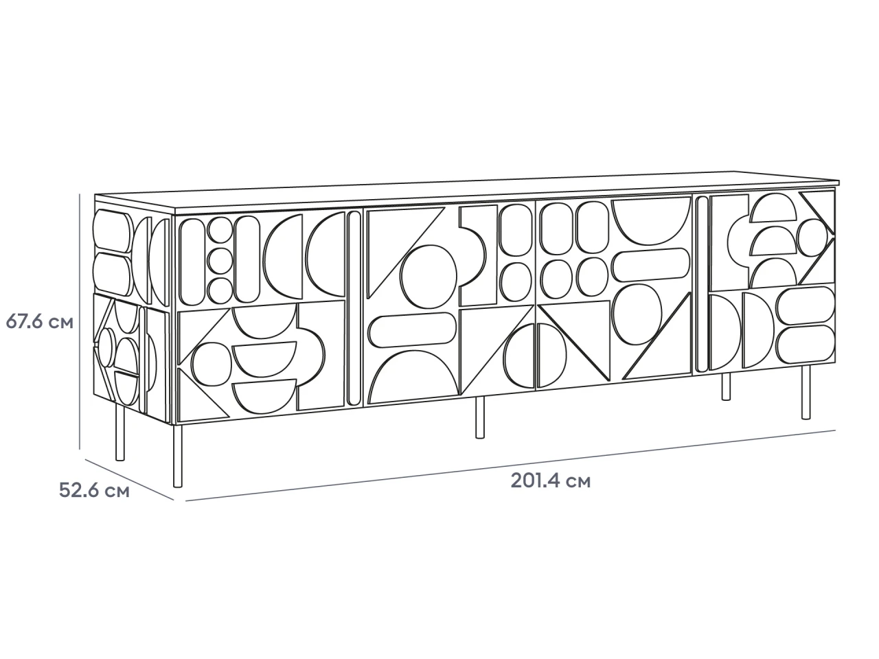 Тумба с четырьмя распашными дверями, расположенными в ряд. За каждой дверью отделение со съёмной полкой. Перестановка полок по высоте не предусмотрена.