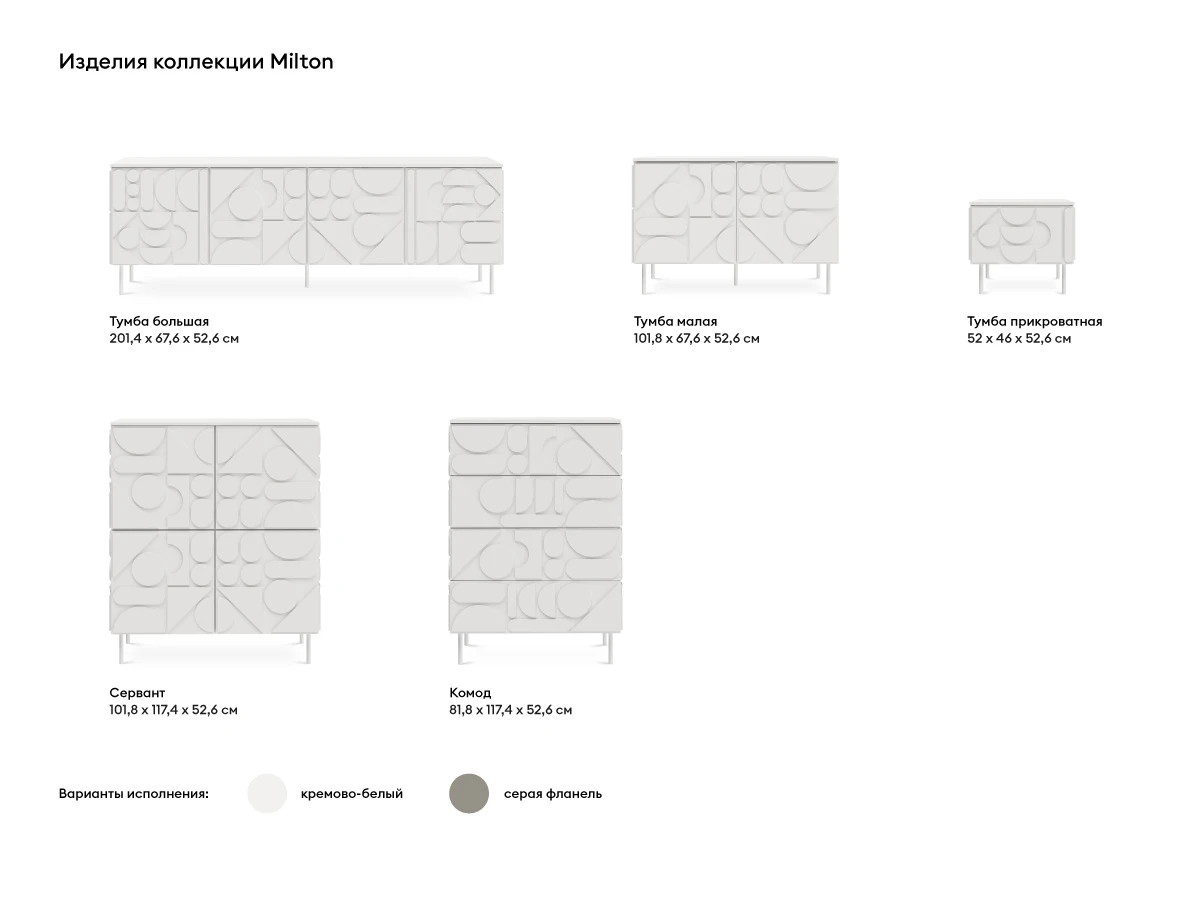 Фасады, боковые стенки и крышки изделий коллекции Milton выполнены из МДФ толщиной 16 мм. На фасадах и боковых стенках закреплены детали в виде геометрических фигур из МДФ толщиной 10 мм.