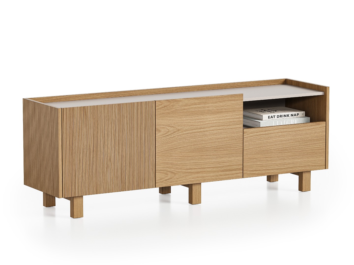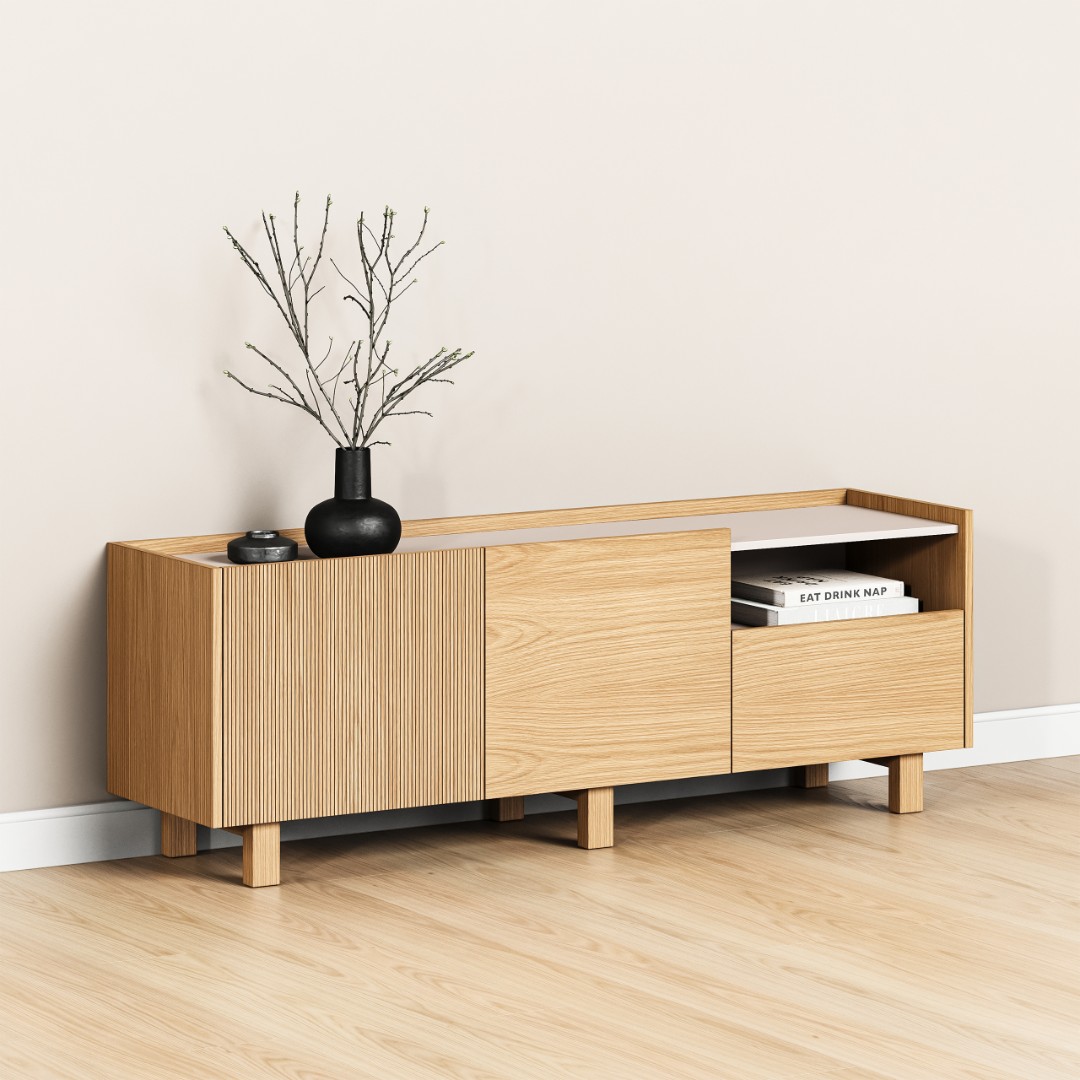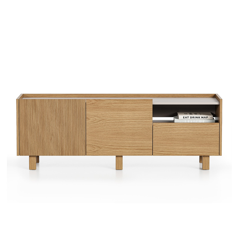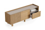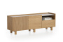Тумба под телевизор Aramil выполнена из натурального шпона европейского дуба, ее образ объединяет минимализм, функциональность и элегантность скандинавского дизайна с утонченной простотой, характерной для японской эстетики.