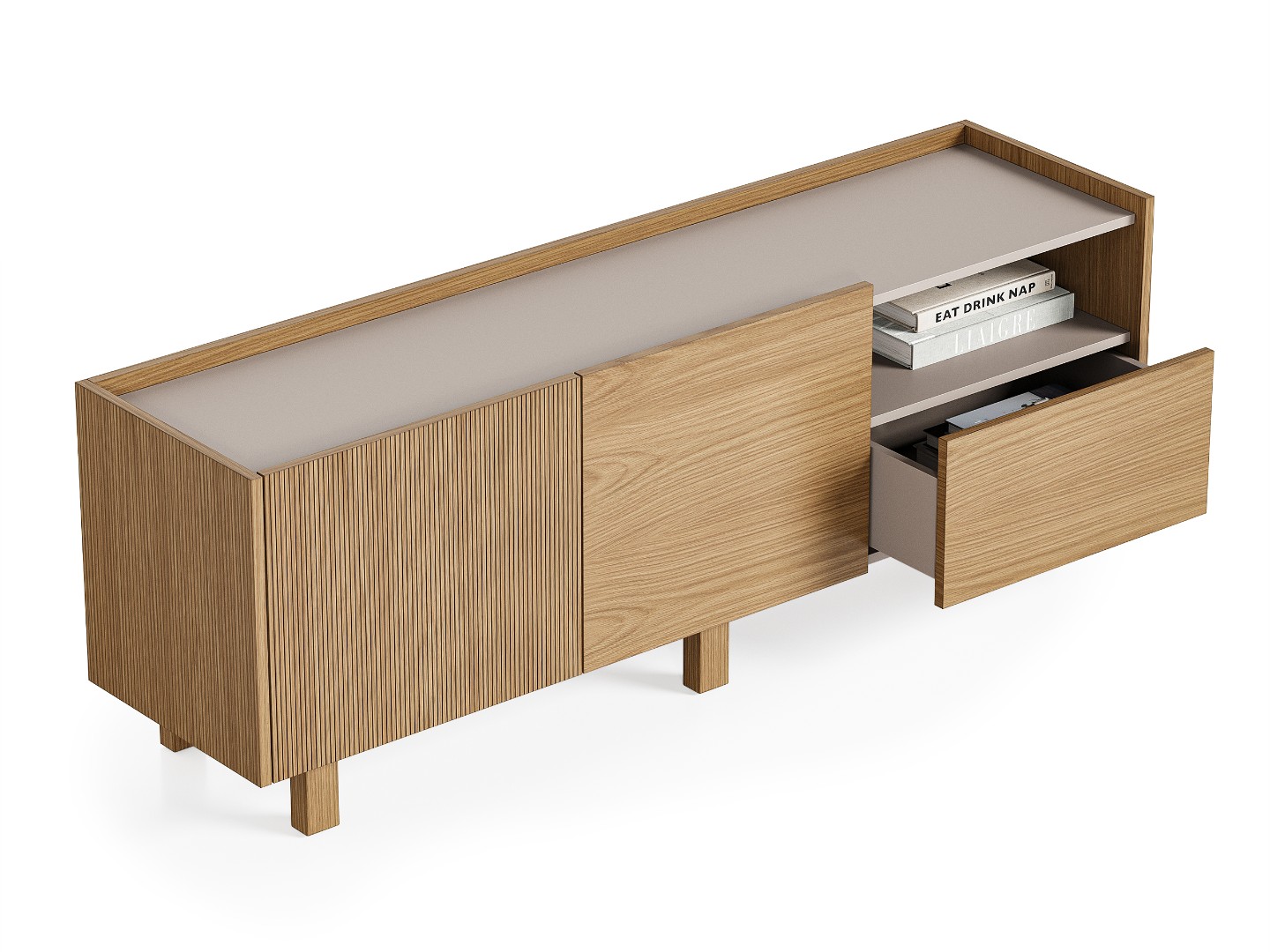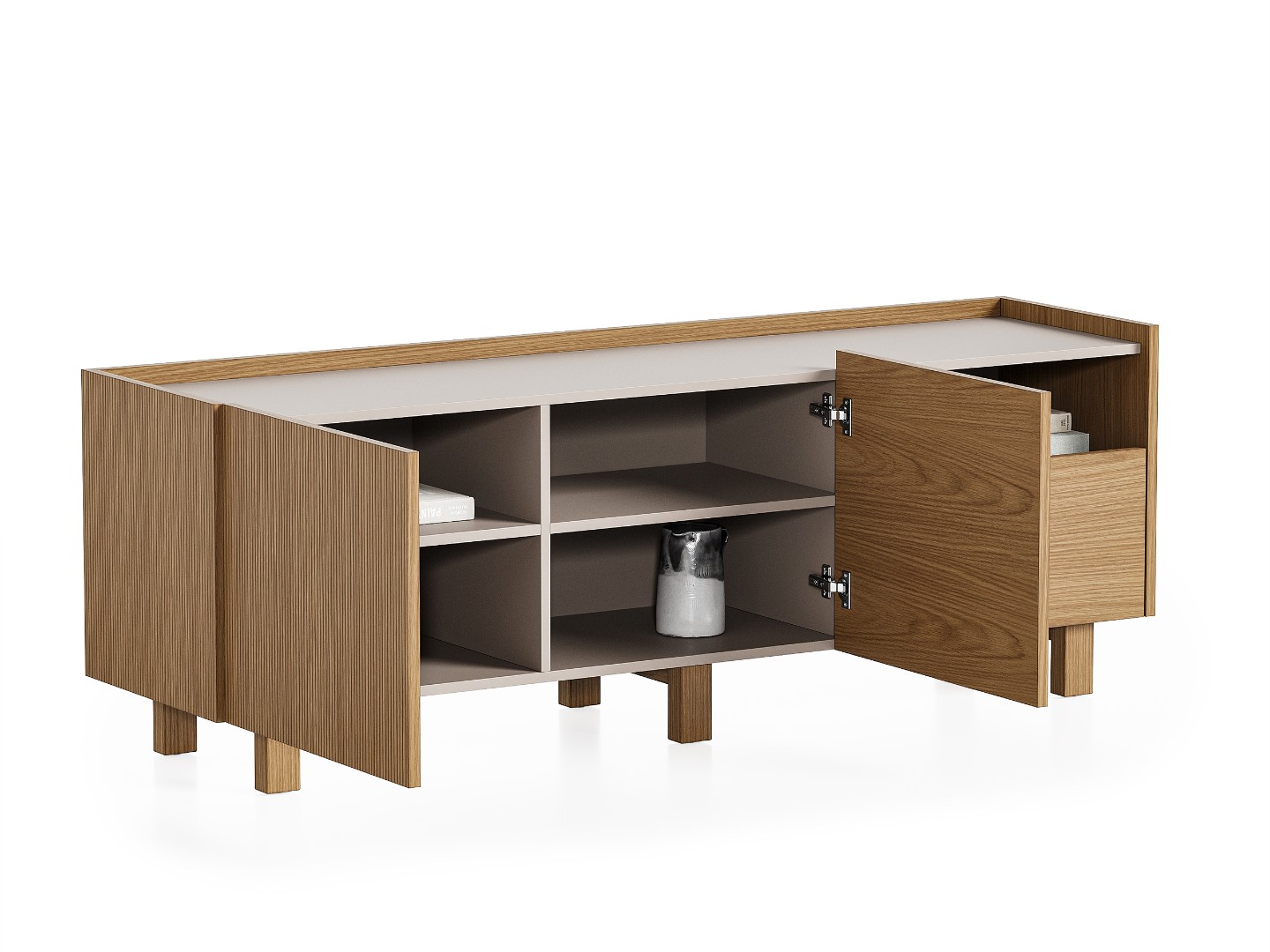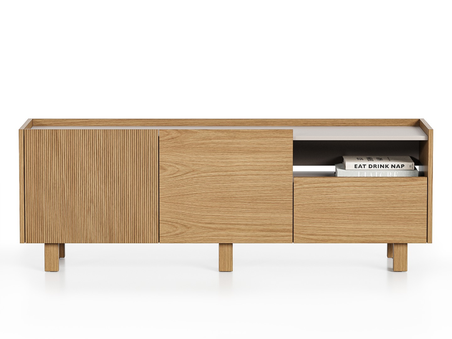 Тумба под телевизор Aramil выполнена из натурального шпона европейского дуба, ее образ объединяет минимализм, функциональность и элегантность скандинавского дизайна с утонченной простотой, характерной для японской эстетики.