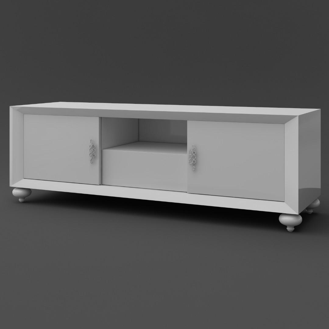 ТВ тумба выполнена в современном стиле. Отделка белый блестящий лак. Конструкцию удерживают низкие фигурные ножки. Сделана из высококачественного МДФ высокой плотности и массива дерева.