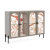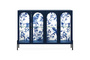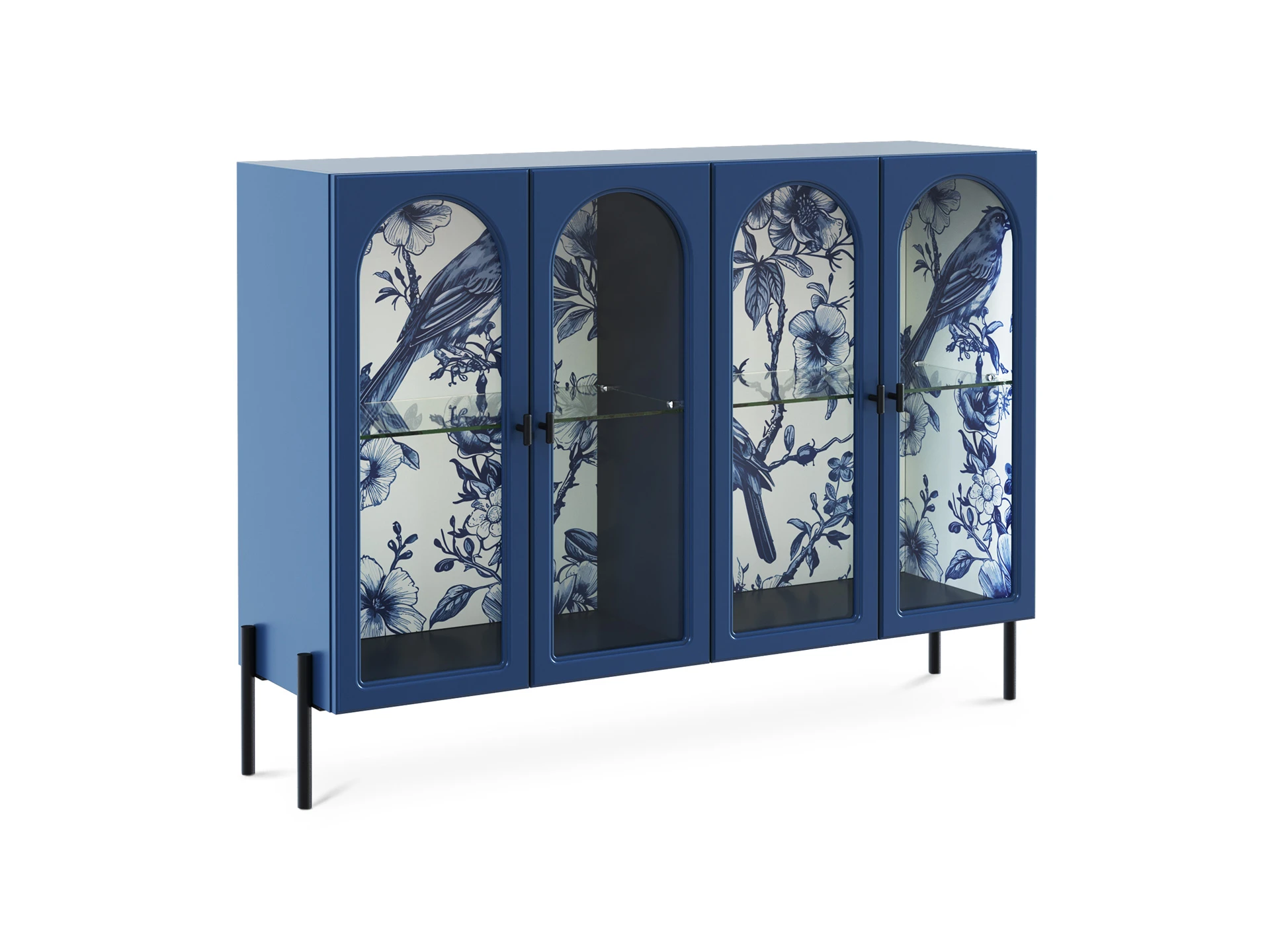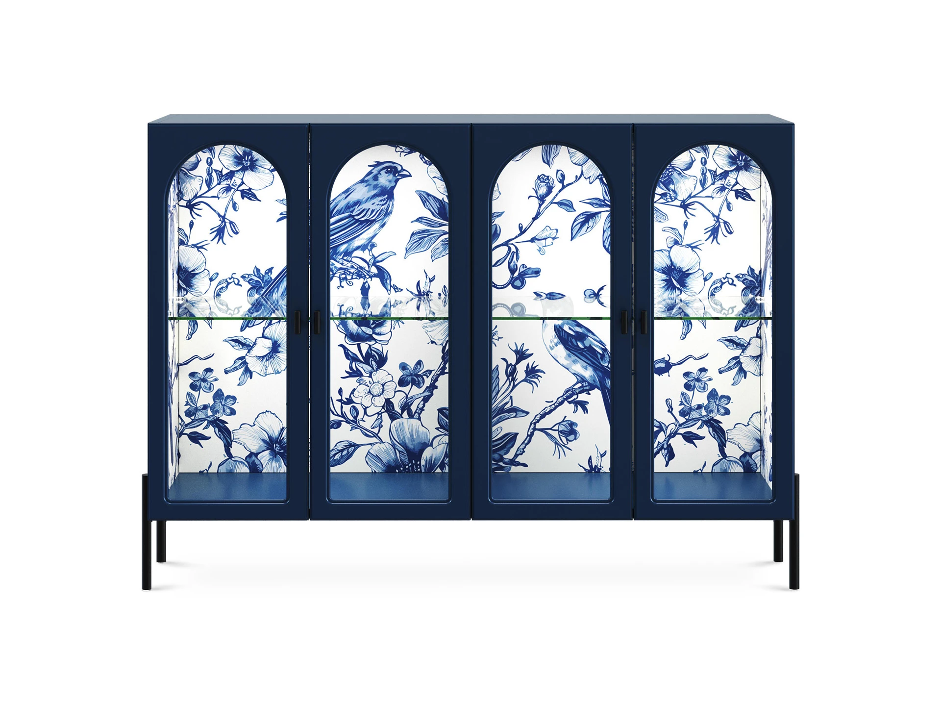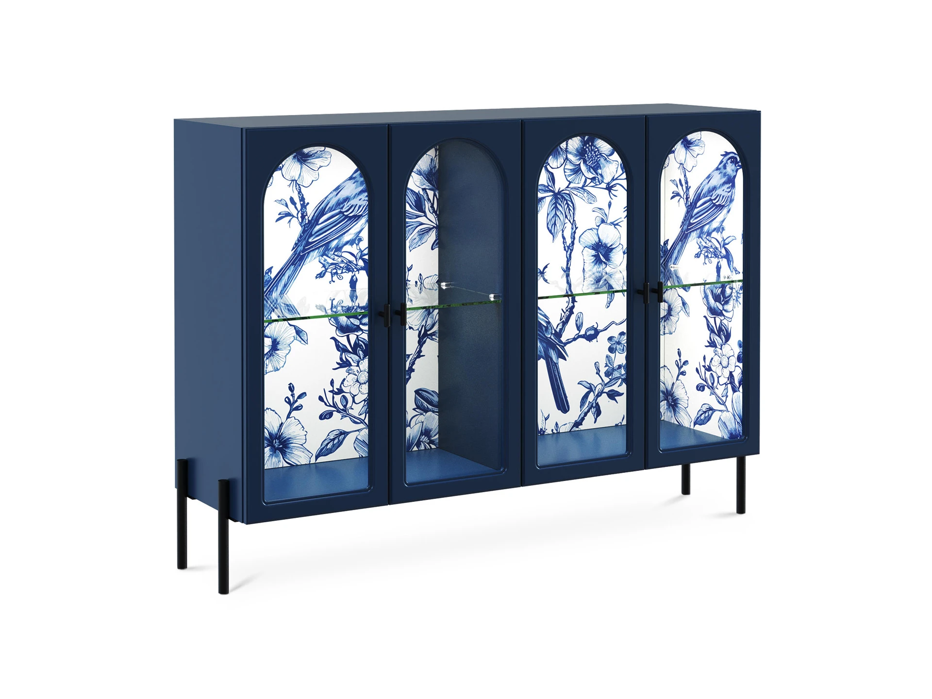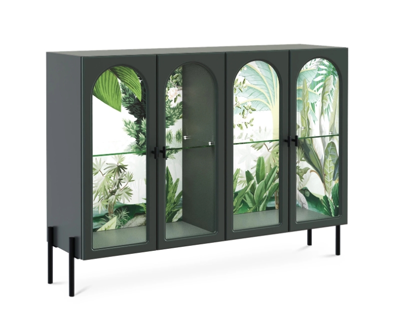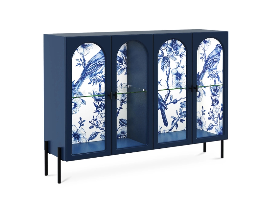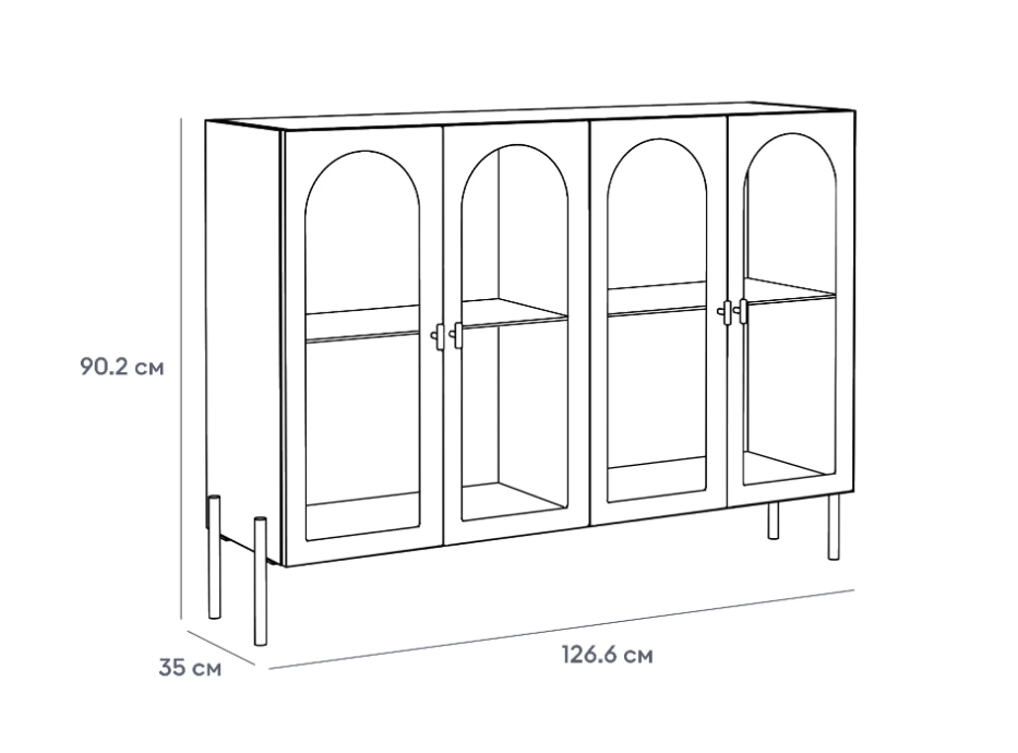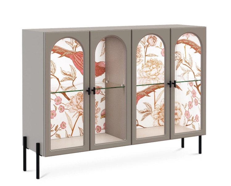 Сервант с четырьмя распашными фасадами. Центральная перегородка делит сервант на два отделения. В каждом отделении одна стеклянная полка. Рамка фасадов выполнена в виде арки.