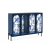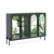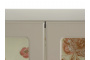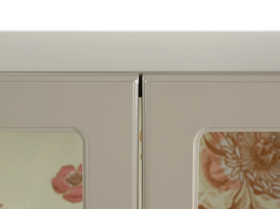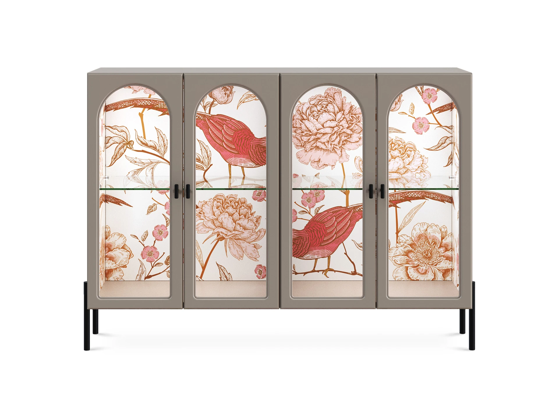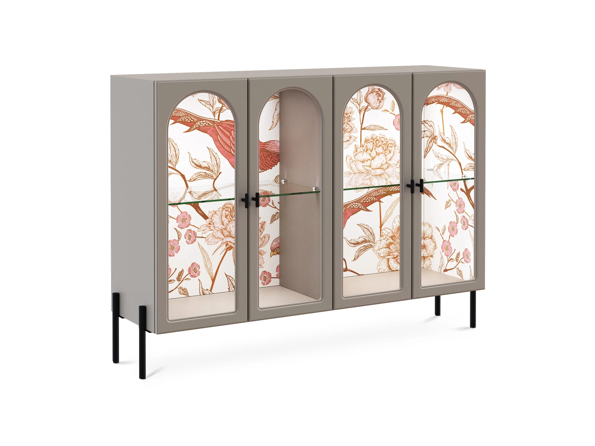 Сервант с четырьмя распашными фасадами. Центральная перегородка делит сервант на два отделения. В каждом отделении одна стеклянная полка. Рамка фасадов выполнена в виде арки.