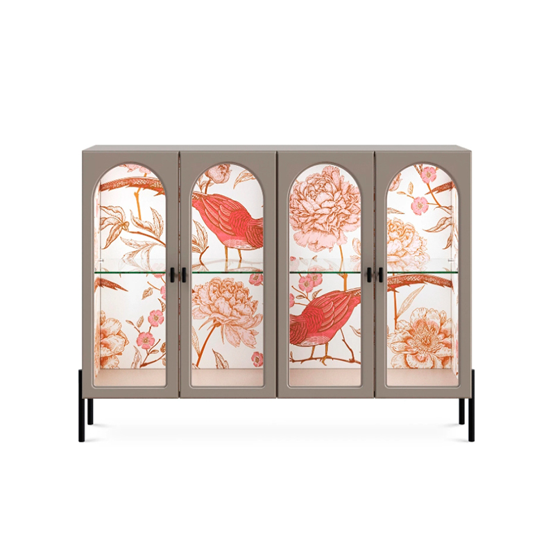 Запросить индивидуальное предложениеBanksy — коллекция оригинальных шкафов-витрин и сервантов с художественными акцентами. В основе дизайна — дань классическим формам и стремление к актуальным тенденциям. Внушительный корпус балансирует на изящных ножках из металла. Что делает габаритные формы визуально легкими. Также за воздушность отвечают дверцы и полки из стекла. Вместе с внутренней подсветкой они обеспечивают «выставочное» хранение книг, посуды, косметики, декора и других предметов. Изображения в духе шинуазри являются колоритными элементами интерьера. Они моментально притягивают взгляд и становятся фокусной точкой, привнося в пространство разнообразие, таинственность, дух приключений. С помощью Banksy вы поддержите комфорт и индивидуальность как домашних локаций: гостиной, спальни, гардеробной, обеденной группы, так и бизнес-пространств: кафе, студий, салонов, шоурумов.