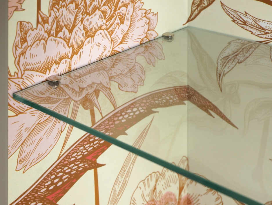 Внутри полки из стекла толщиной 6 мм. Перестановка полок по высоте не предусмотрена.