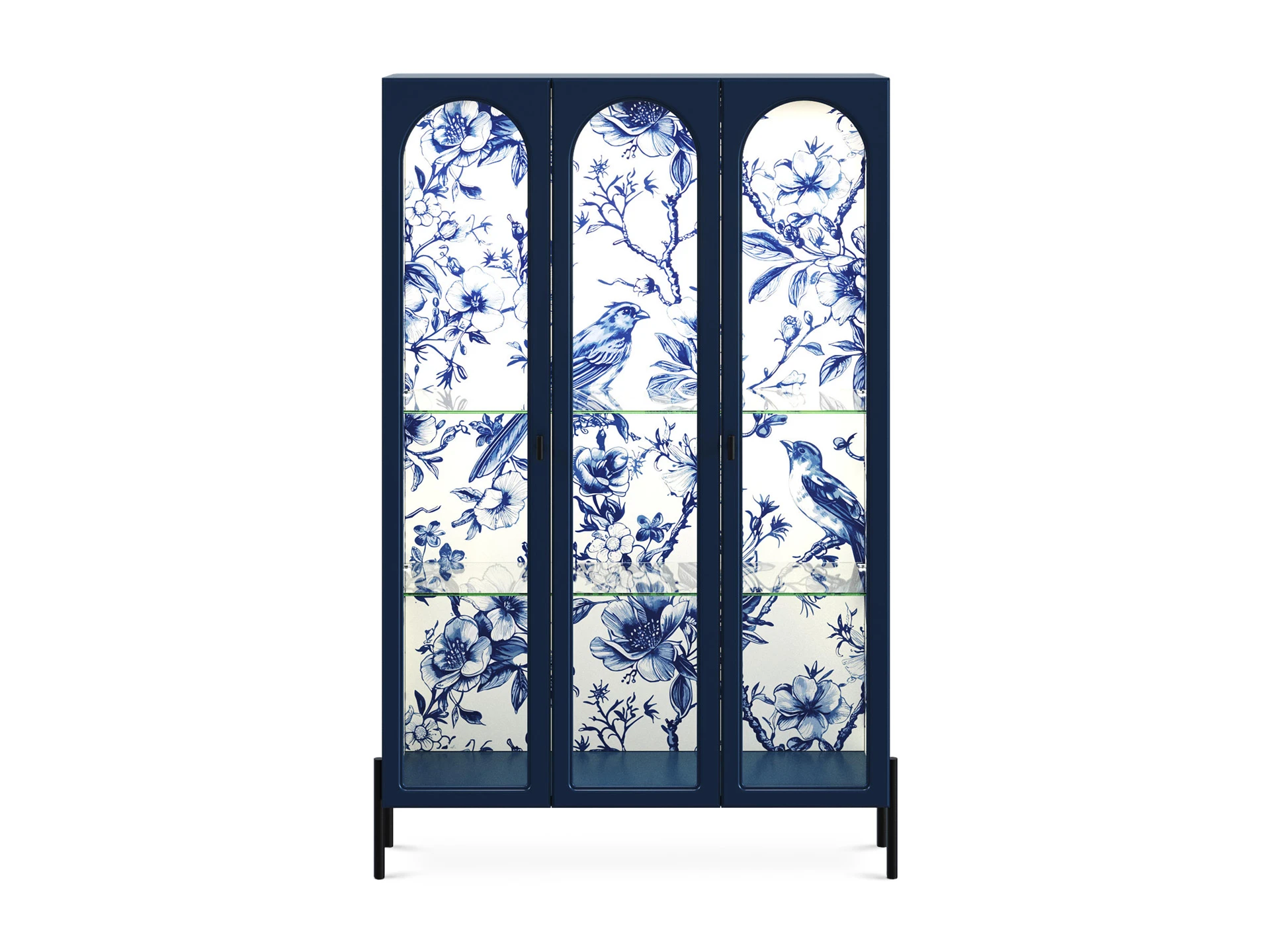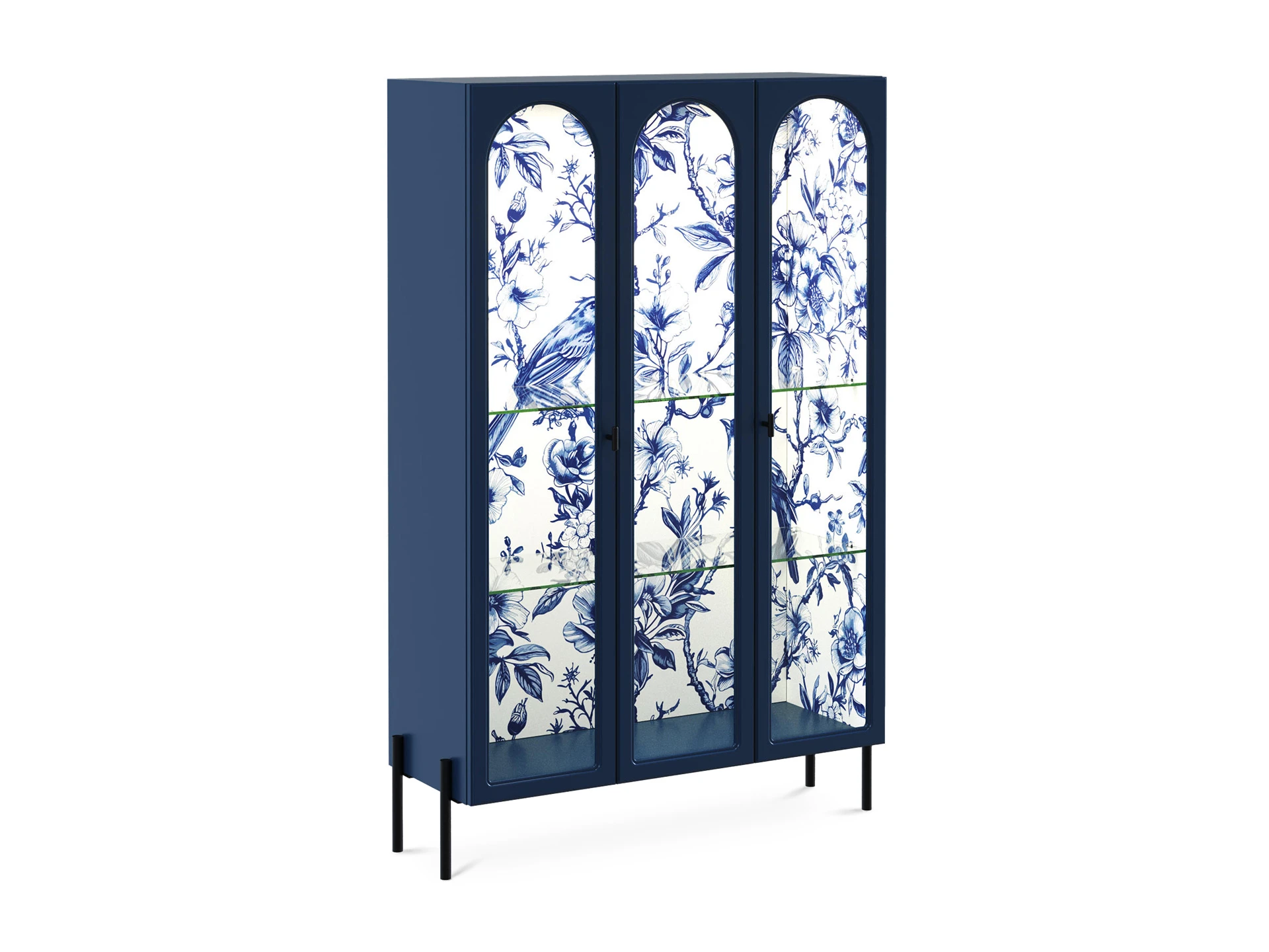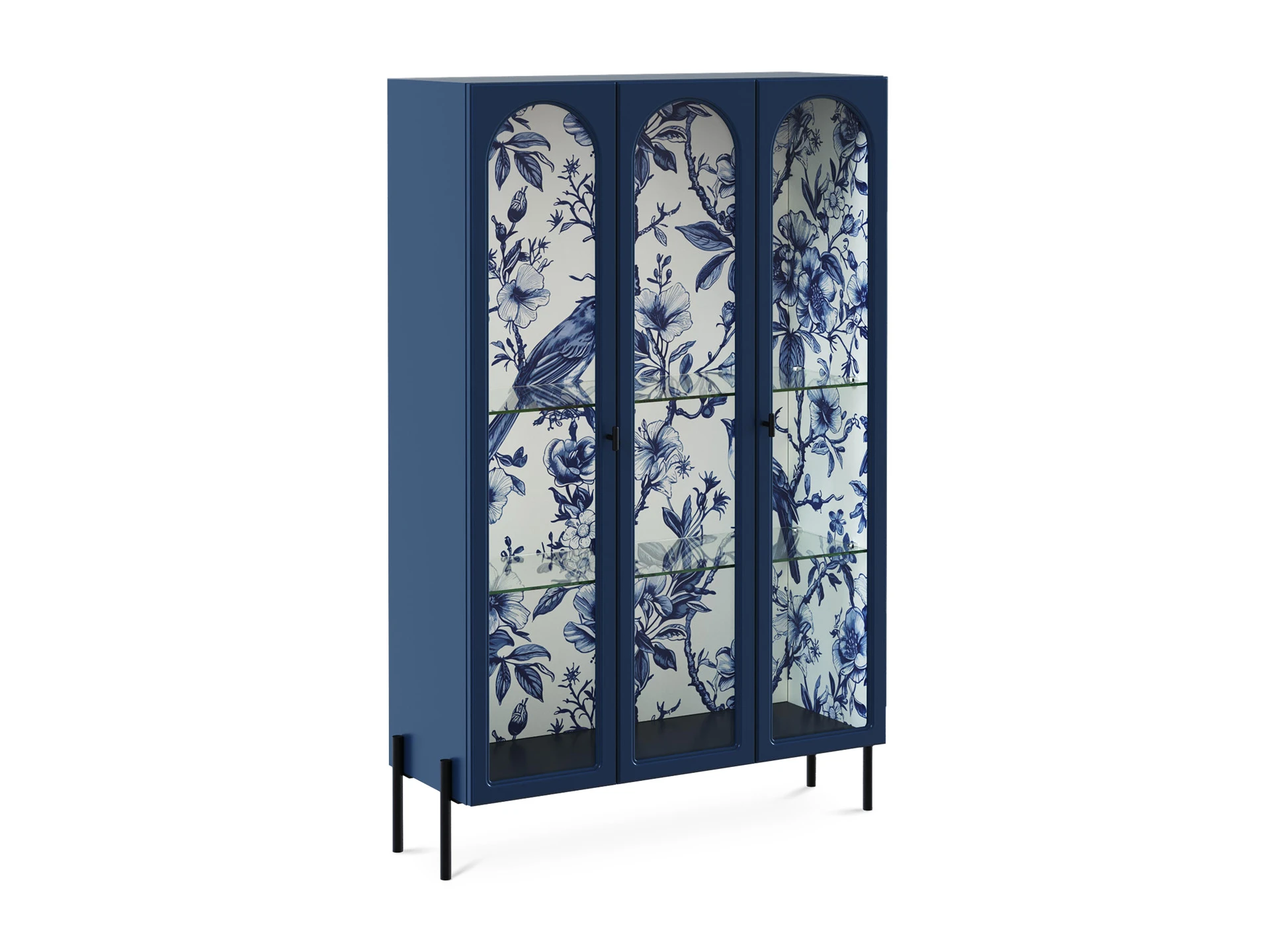 Витрина с тремя фасадами, из них два крайних – распашные, центральный – стационарный – не открывается. Рамка фасадов выполнена в виде арки. Количество полок – 2 шт.