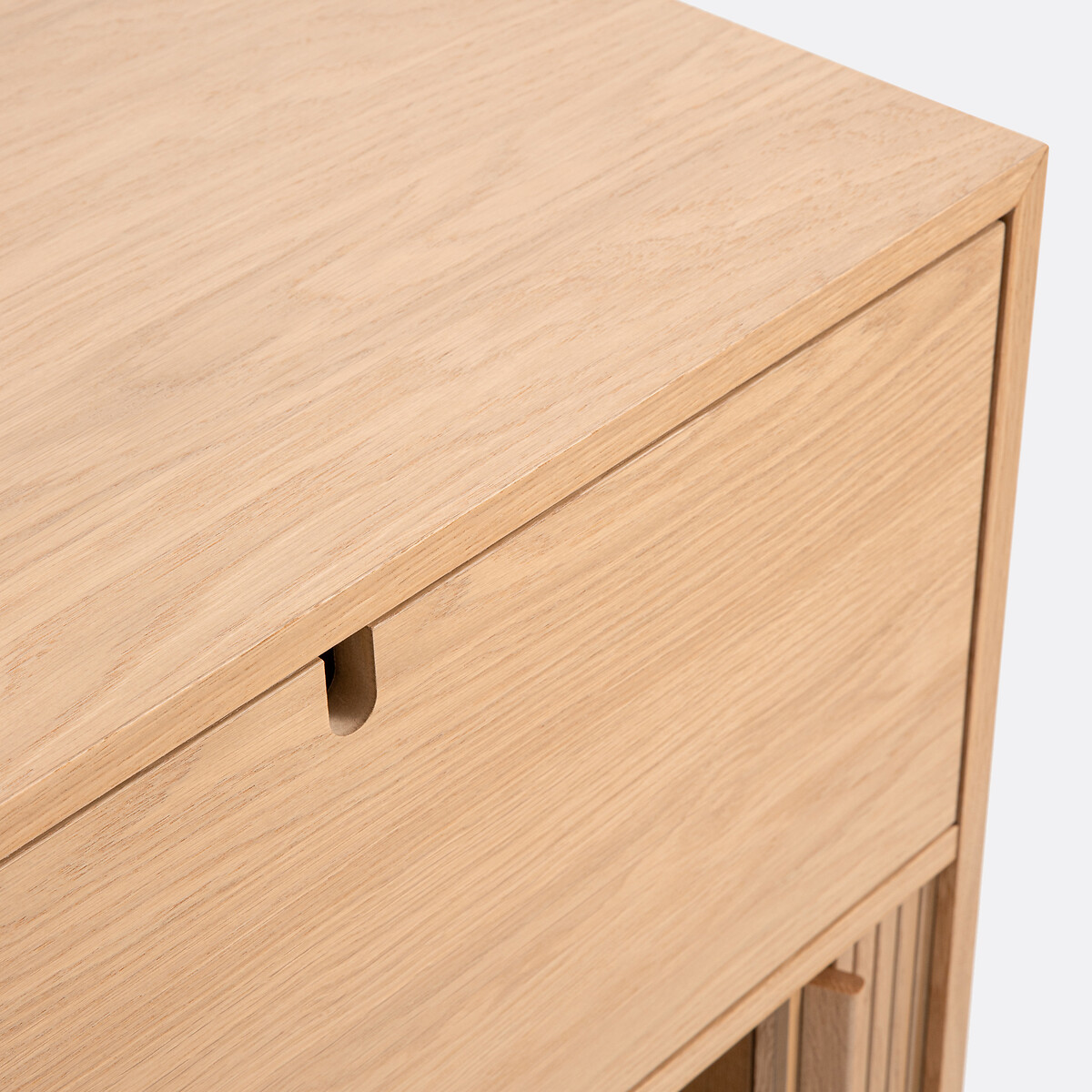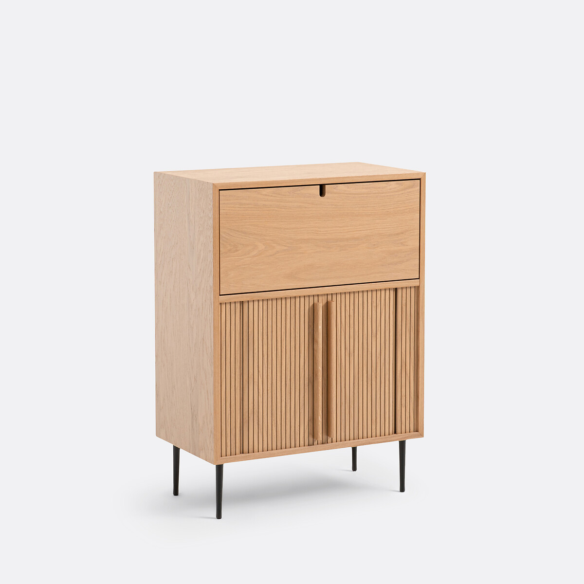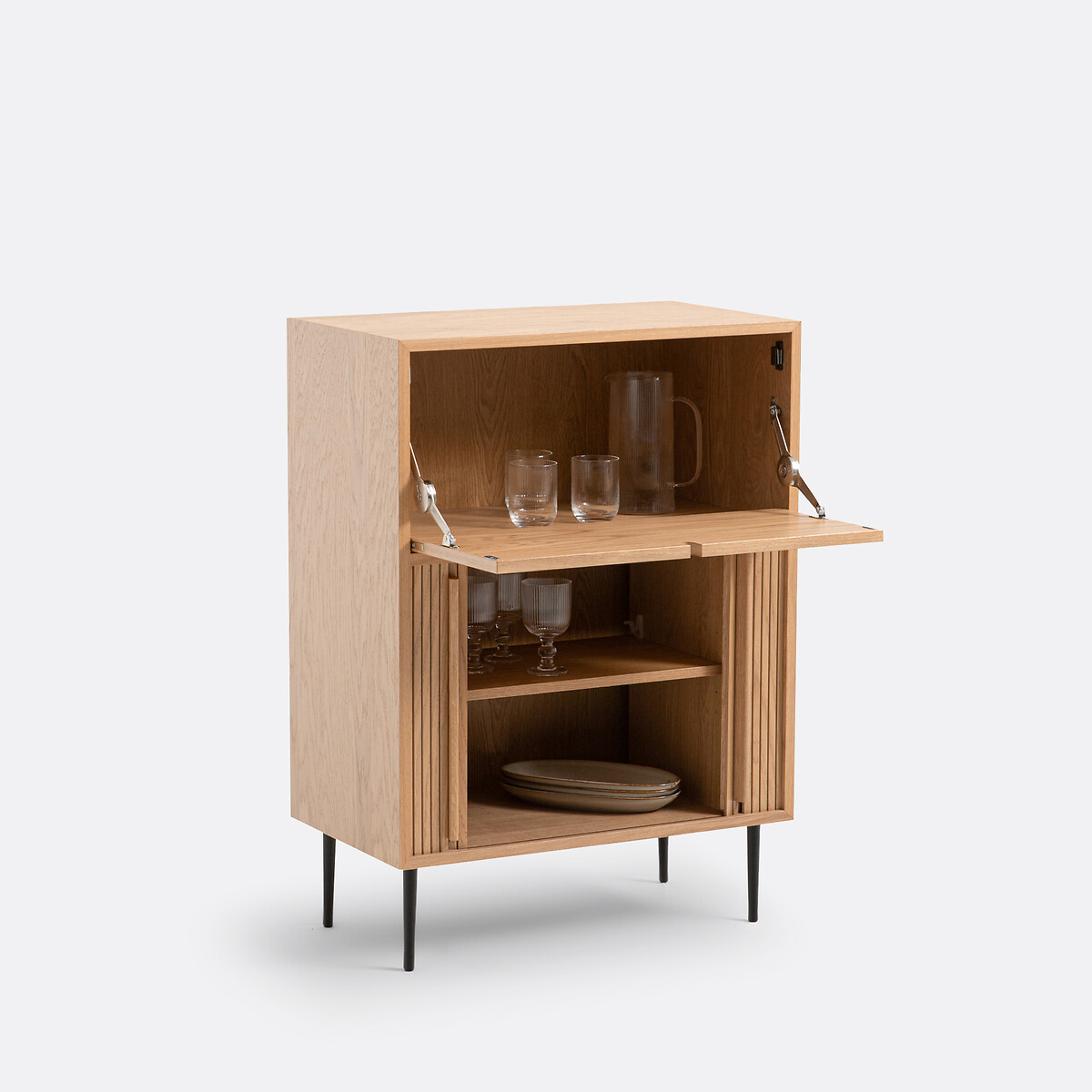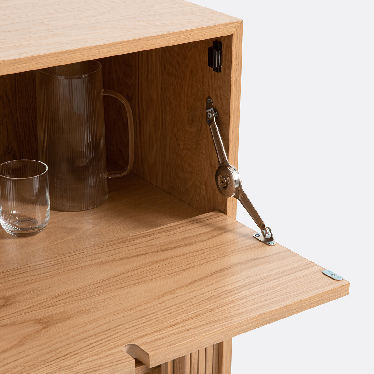 • Две раздвижные дверцы из реек из МДФ, шпонированной дубом, покрытие матовым лаком